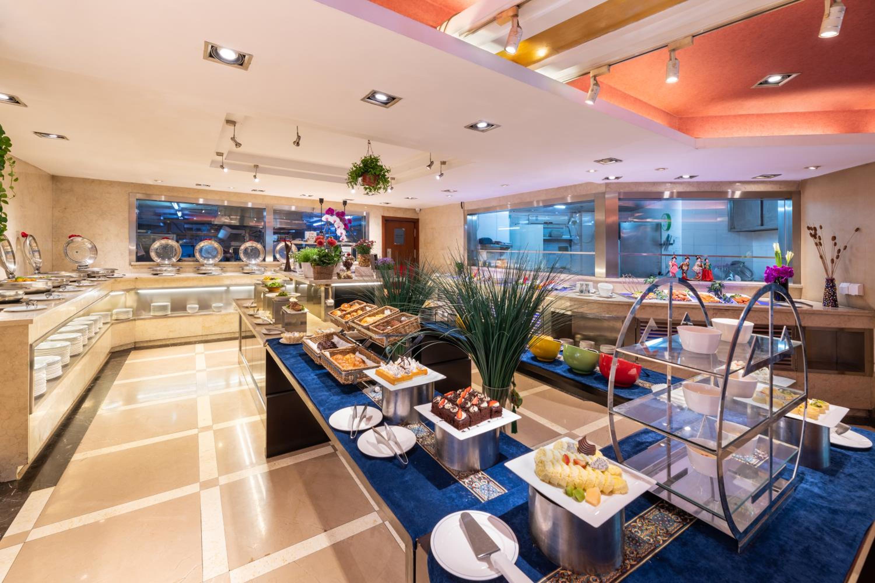 The cafe downstairs serves breakfast, lunch, and dinner. We had the dinner buffet; it wasn't expensive and offered good quality food with lots of choices. I was able to feed my picky kids, and we really liked our meal. Overall, it’s a great place to stay.