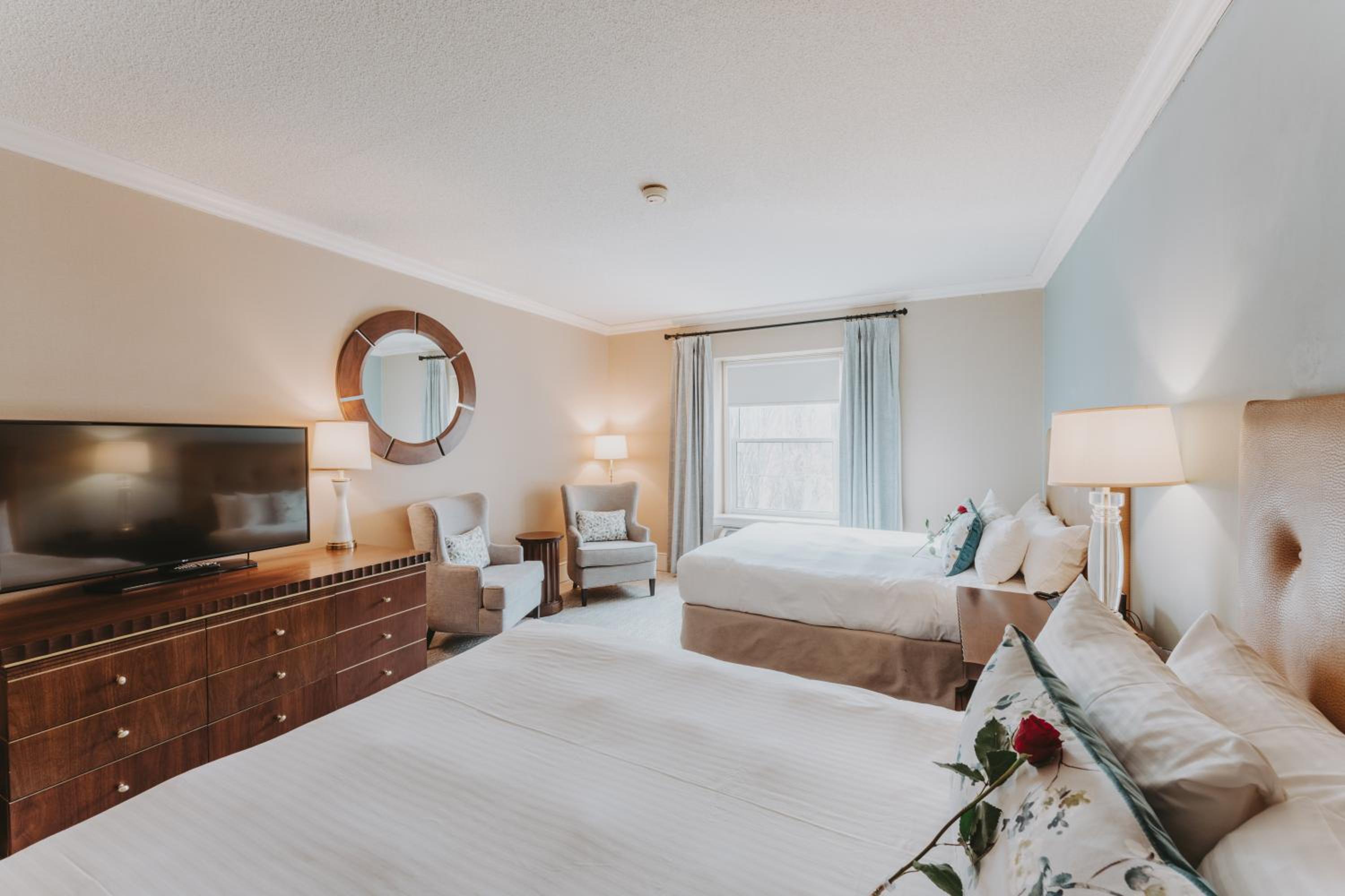 Indulge in the elegant rooms at Queens Landing, each equipped with a flat-screen TV, work desk, and cozy seating area. Upgrade to rooms with a fireplace and spa bath for a truly lavish experience.