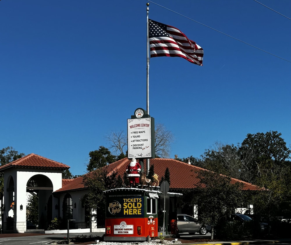 I wanted to stay a bit outside of St. Augustine as I planned on attending and knew that the city was going to be mobbed. It is about 7 minutes from the city. It was clean and good location for the beach. It has a small pool which I could not see more than one family using it at one time. The hotel was clean and appointed. I stayed on the first floor, which is a mistake. I could hear the people walking across the floor until 10:30 pm and beginning at 6:30 am which woke me up. During my sleep, I could hear someone snoring in the other room. I would not stay there again. Not that it matters, but there was a knob missing on a wardrobe cabinet making it difficult to open. I didn't have to open it as I only stayed there overnight.