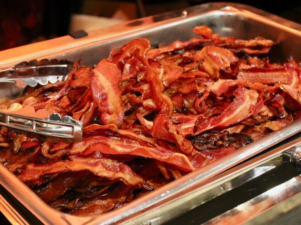 bacon and sausage links, potatoes, omelettes and scrambled eggs.