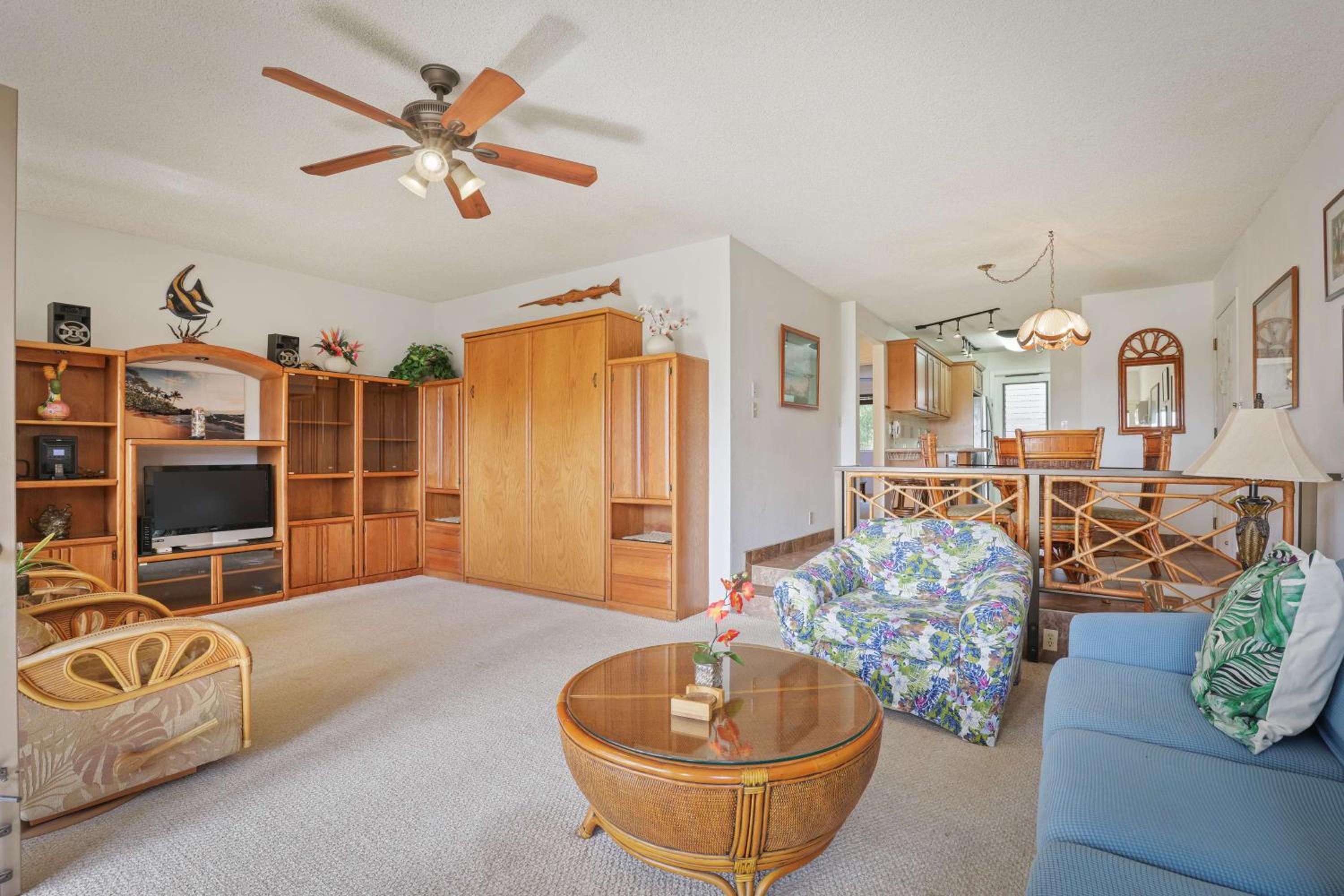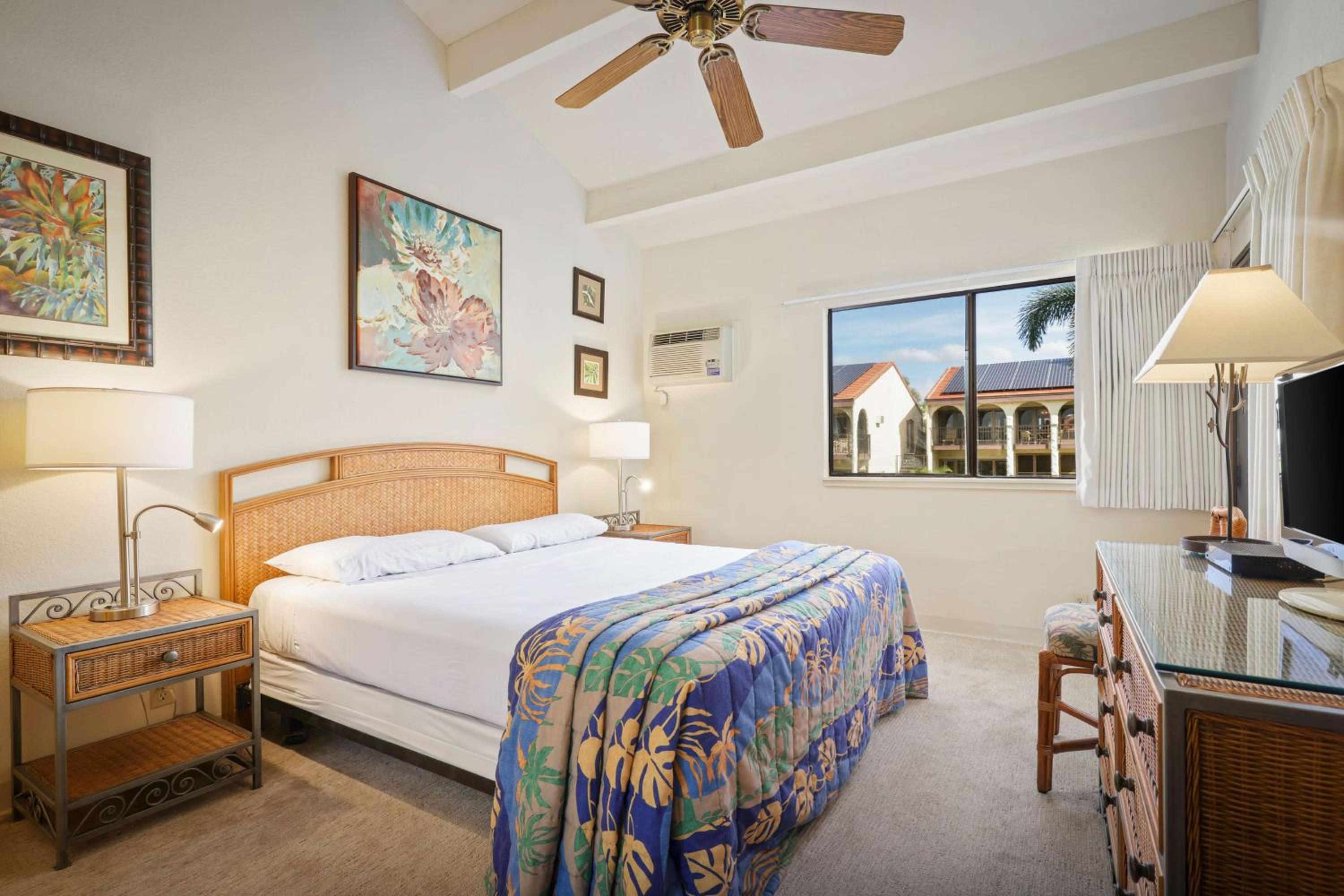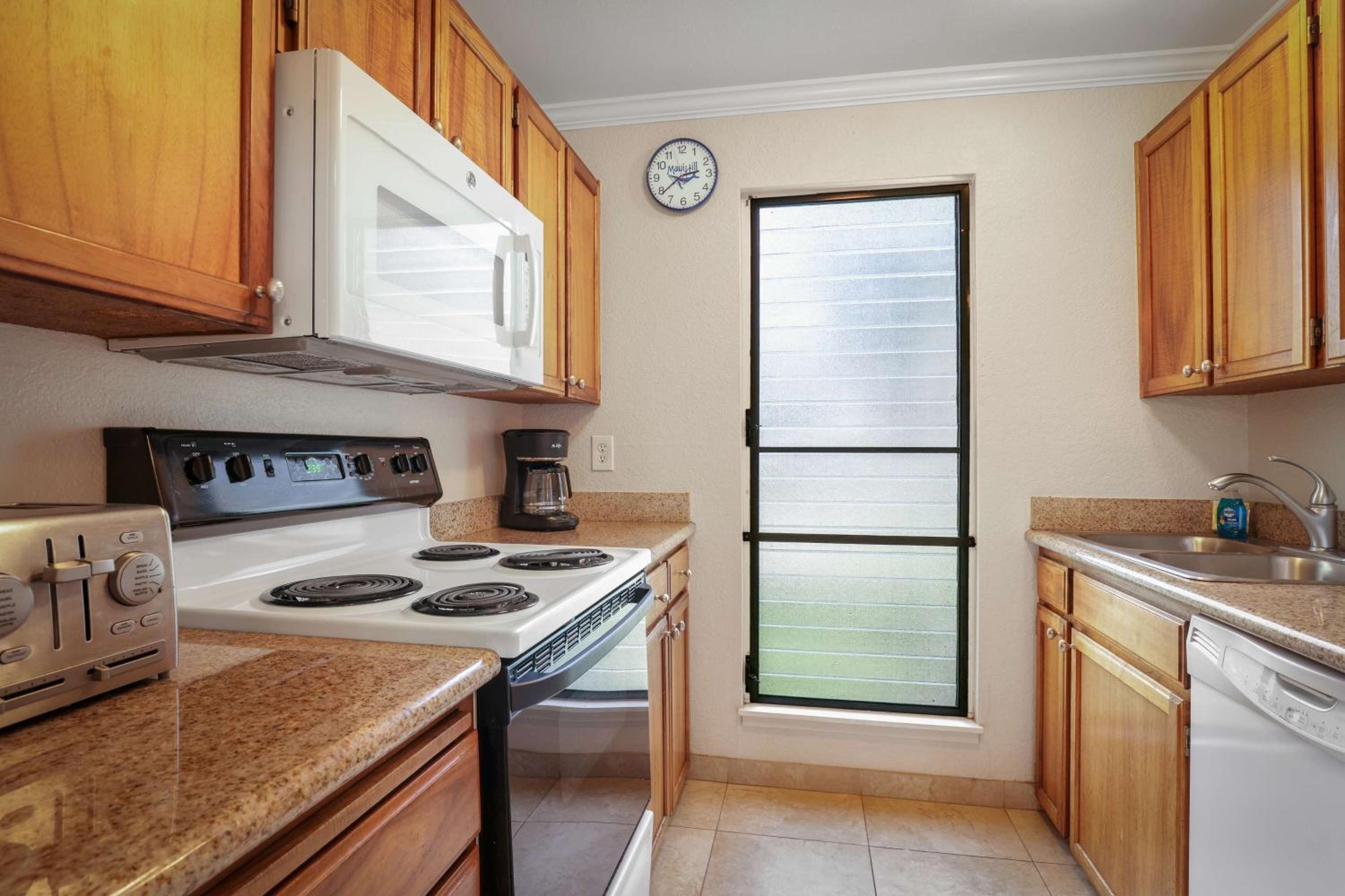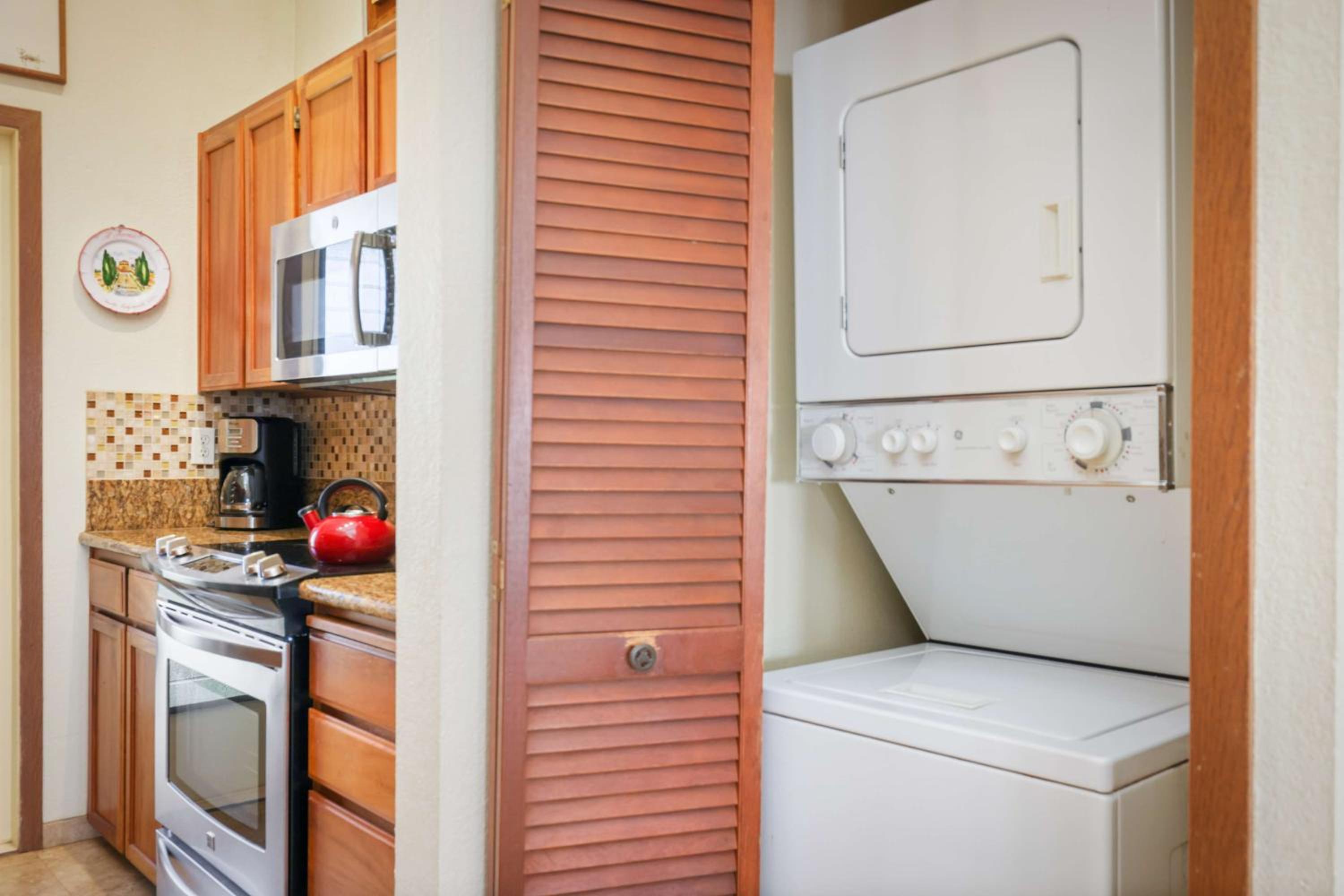 Indulge in the comfort of our tropical-themed suites at Aston Maui Hill, each complete with a fully-equipped kitchen, private balcony, and in-room washer and dryer for your convenience.