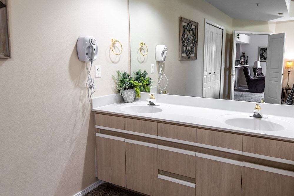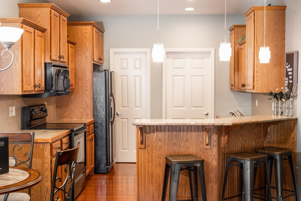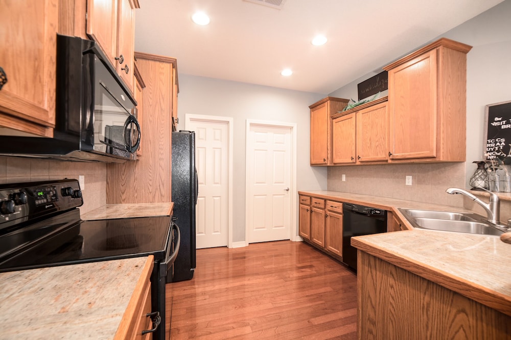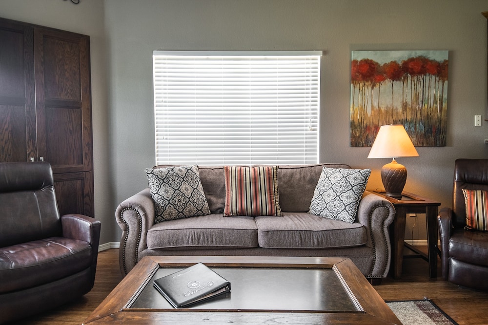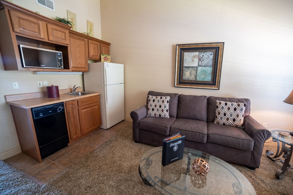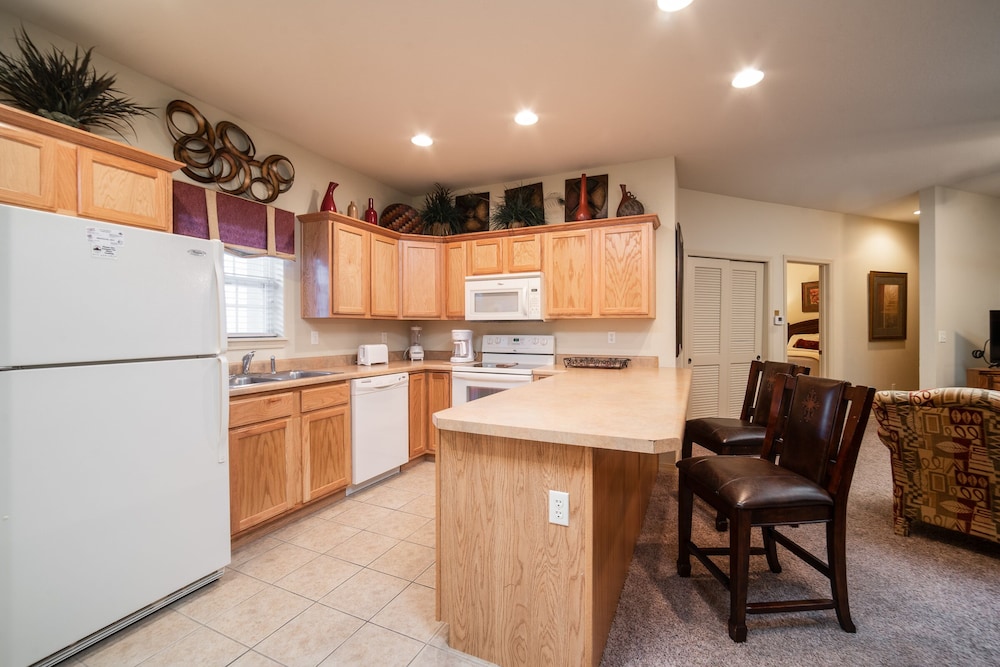 This place was great! It was such a a comfortable place to stay. We were there for a week and it felt like a home away from home. And we got lucky, the room we stayed in was directly across from one of the pools. I loved having a full kitchen, washer and dryer, and a lovely enclosed patio overlooking the golf course. The kitchen was big and had everything you could ask for including a coffee pot, toaster, and even a blender. And the property is so close to the 76 Strip and all the amazing fun to be had there! It was right around the corner from Fritz's Adventure and about 20 minutes from Silver Dollar City. I also really liked that there wasn't a huge cleaning list to have to do before check out. They just ask that you take out your trash (there is a trash receptacle in front of every building) and start the dishwasher, easy.