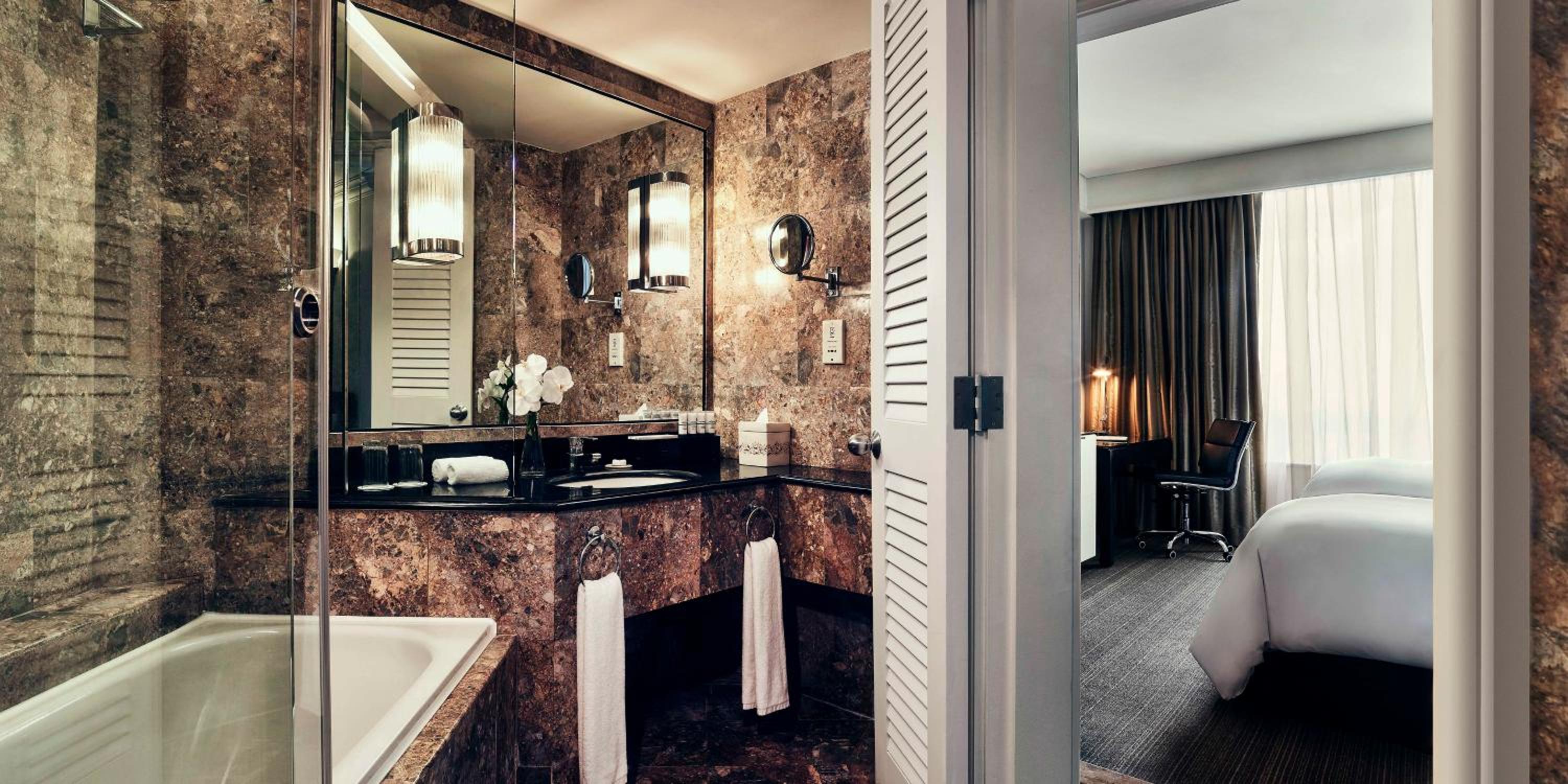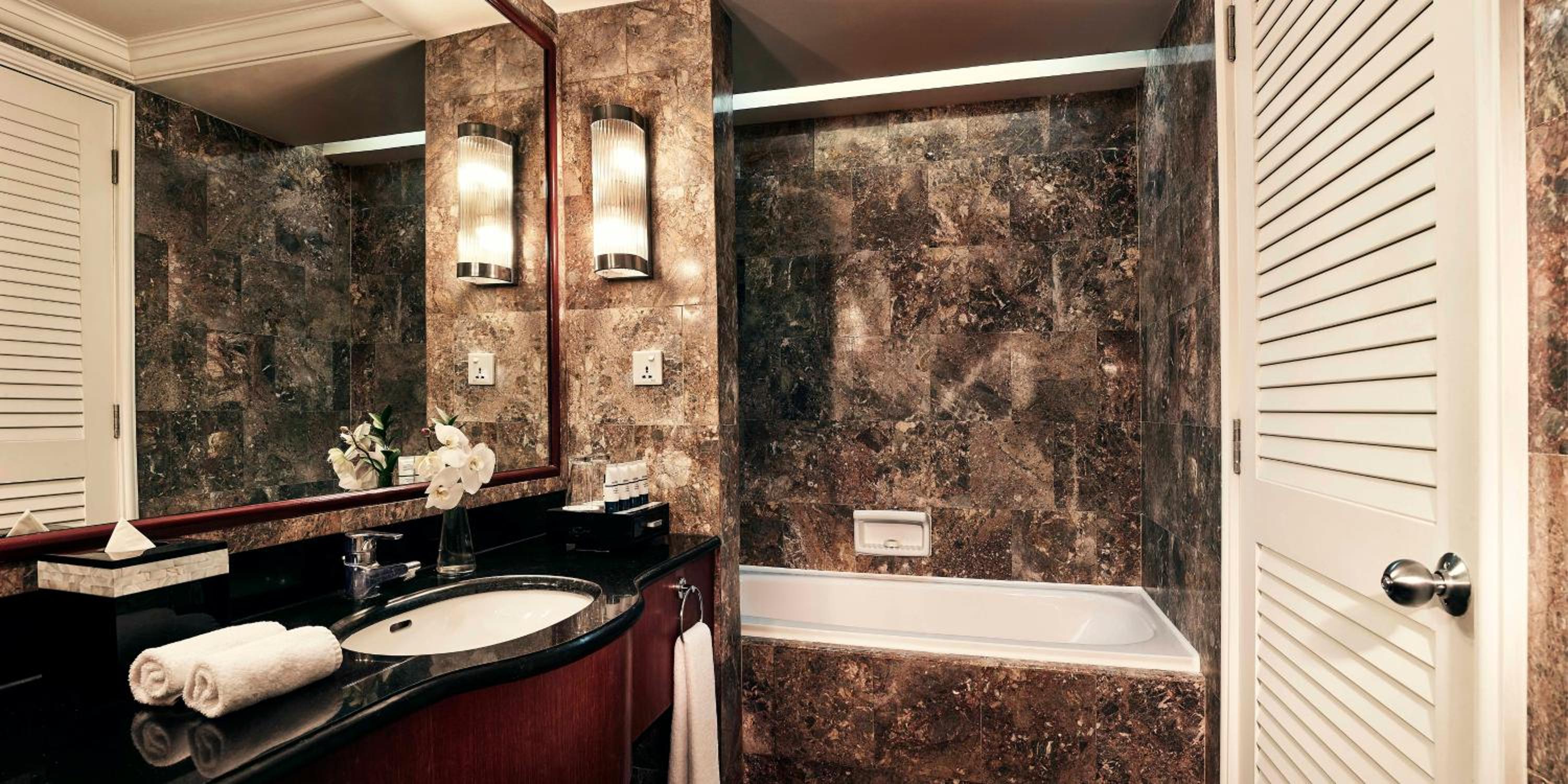The room was a good size and in line with expectations for a five-star hotel, though the property itself feels slightly dated. That said, everything was comfortable and functional. The bed was very comfortable, and I appreciated the bedside controls for A/C and lighting. The bathroom was on the smaller side but perfectly usable, with good shower pressure, a soaking tub, and even a clothesline for hanging items.