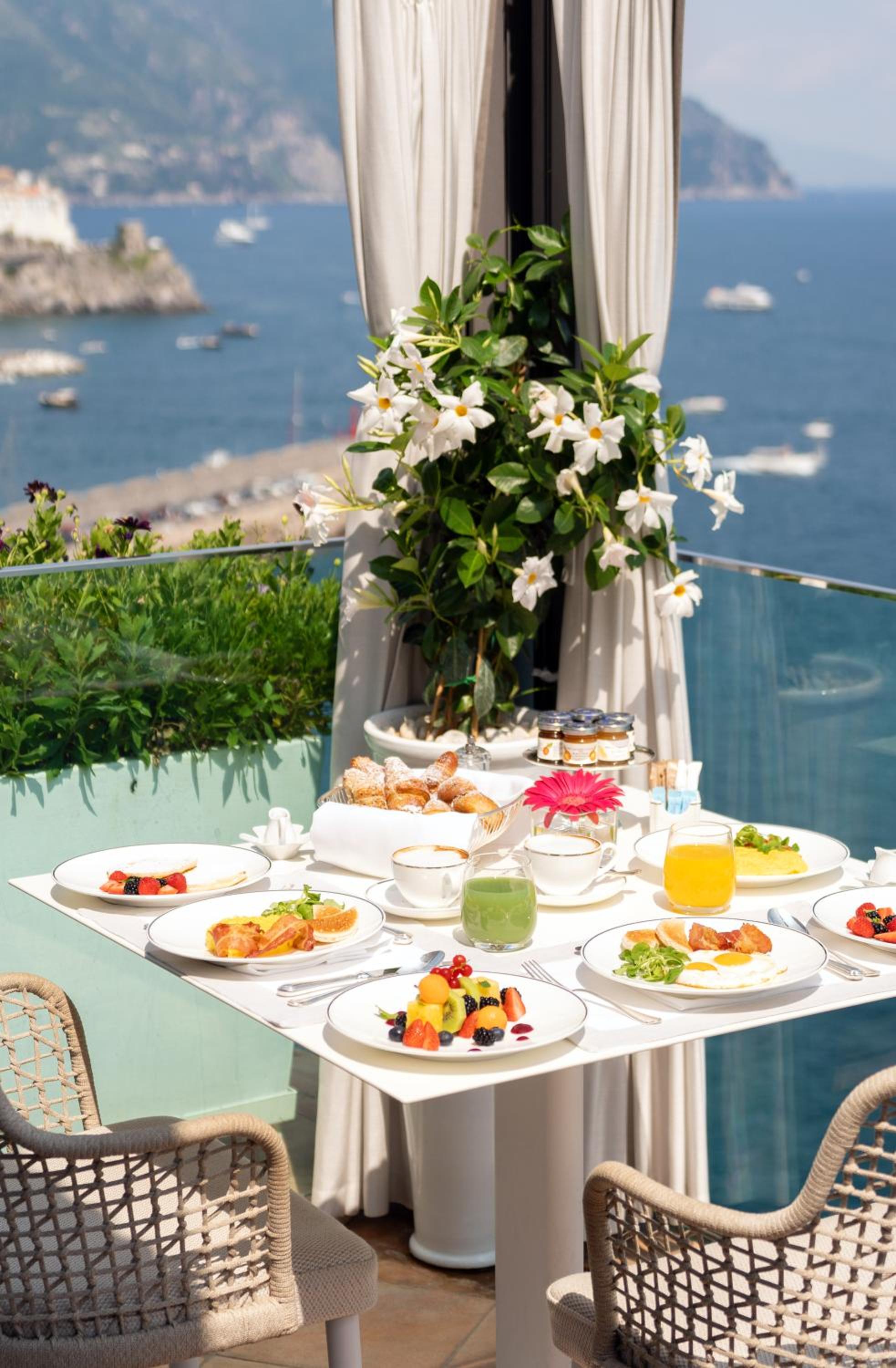 I like the view of sunrise over the Amalfi sea from our hotel balcony every morning. The beach club was exceptionally beautiful, postcard perfect. The staff were very friendly and helpful. The breakfast buffet table had an entire leg of prosciutto.