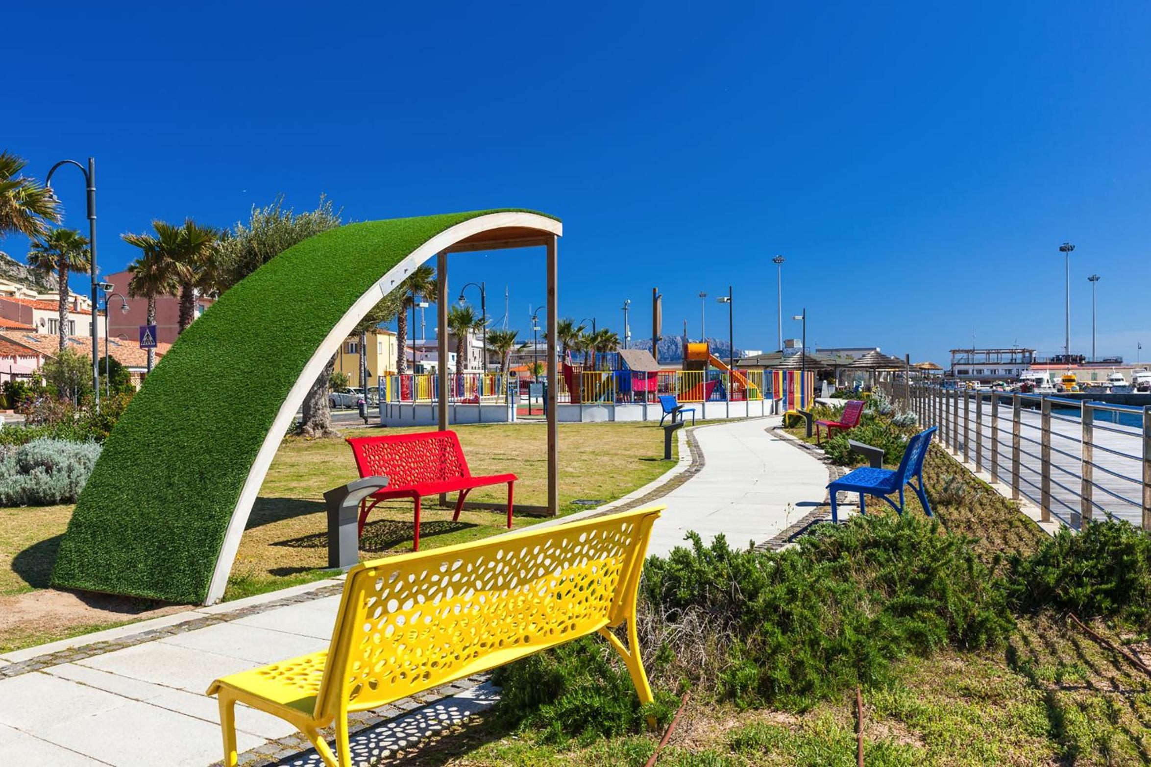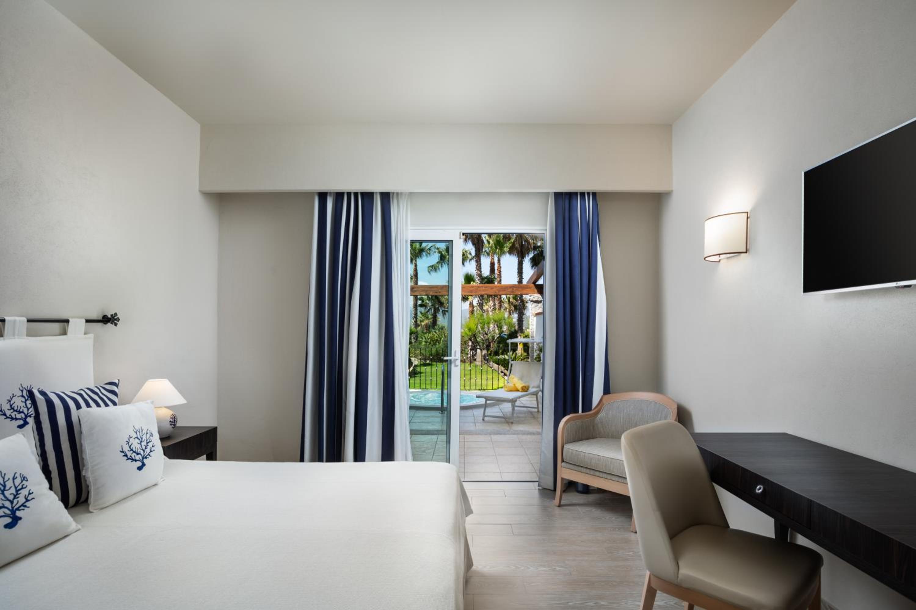 Indulge in stunning Gulf of Aranci views from your room at Villa Margherita. Unwind by the outdoor pool or hot tub, surrounded by serene palm trees.