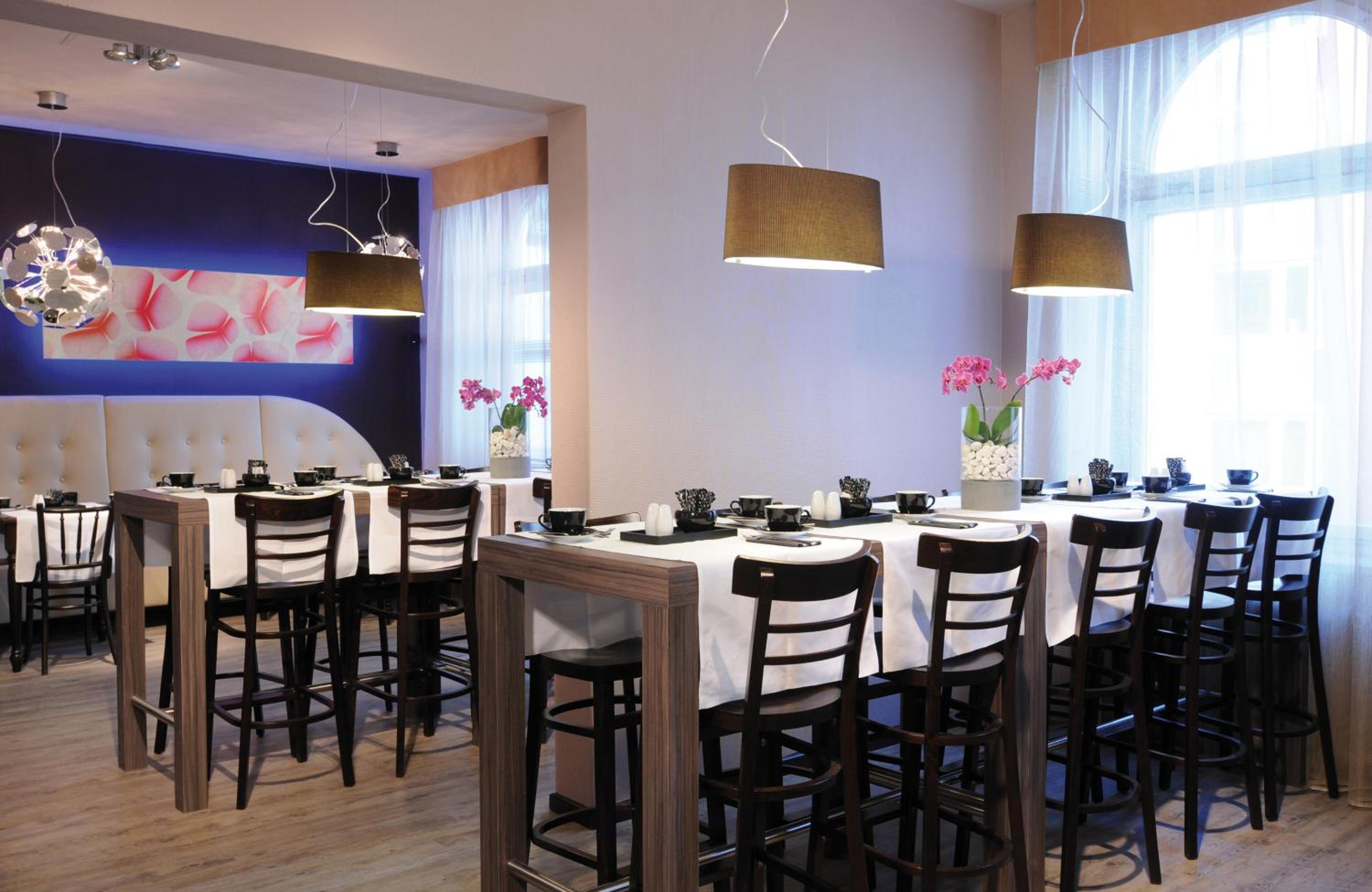 I especially loved the breakfast room. It is beautifully and stylishly decorated – and to my delight, it is even in my favorite color, **violet**. The chairs, the atmosphere, and the nicely prepared tables make the room feel warm, elegant, and welcoming.
