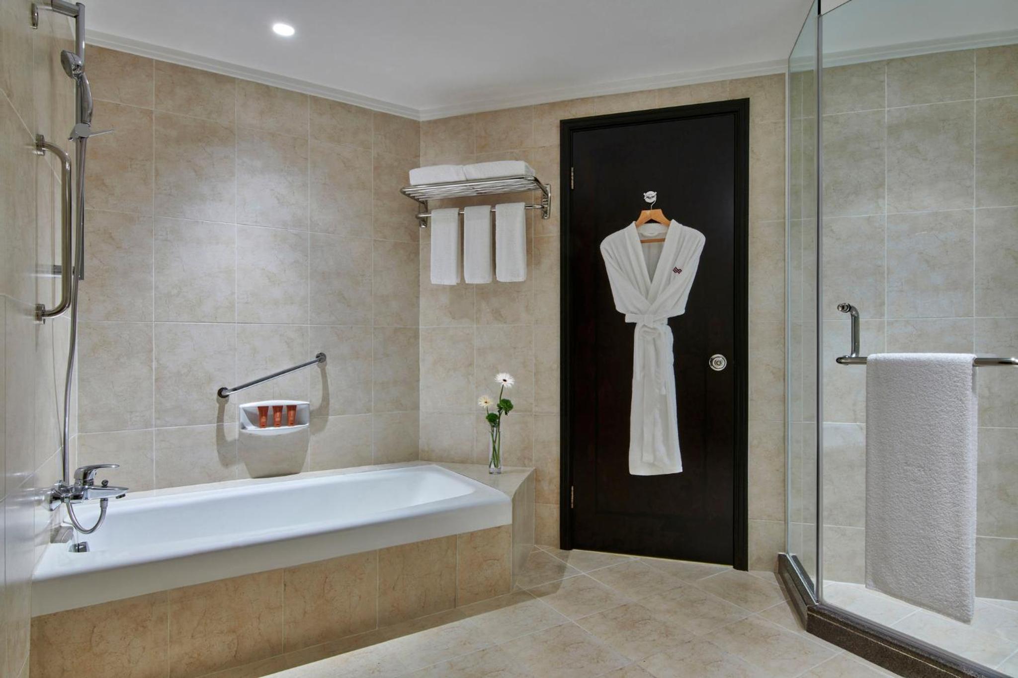 The hospitality of the staff. They are very friendly and helpful. We got free breakfast for one person and free extra bed. There are asian and western food on breakfast.