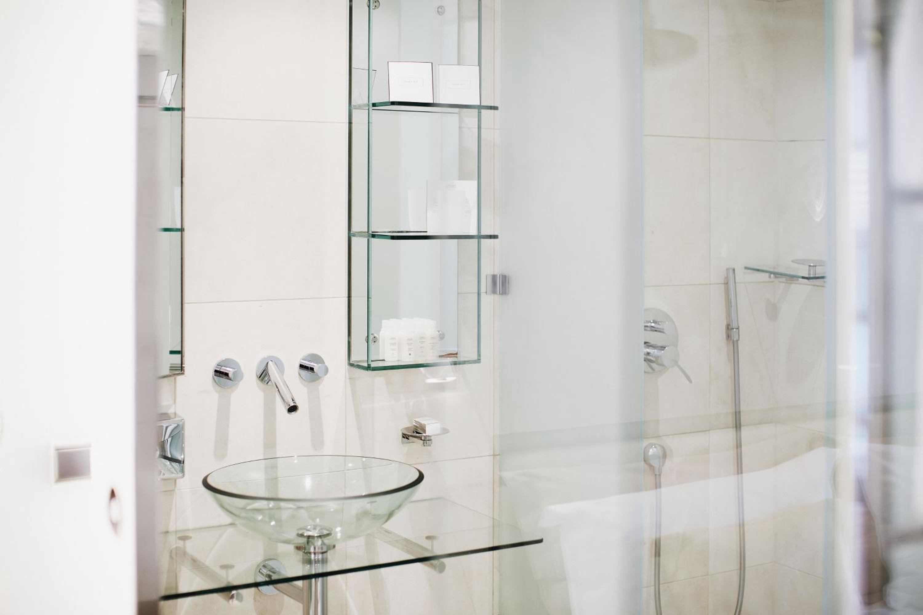 Visitors should be aware that the bathroom is enclosed in glass walls.