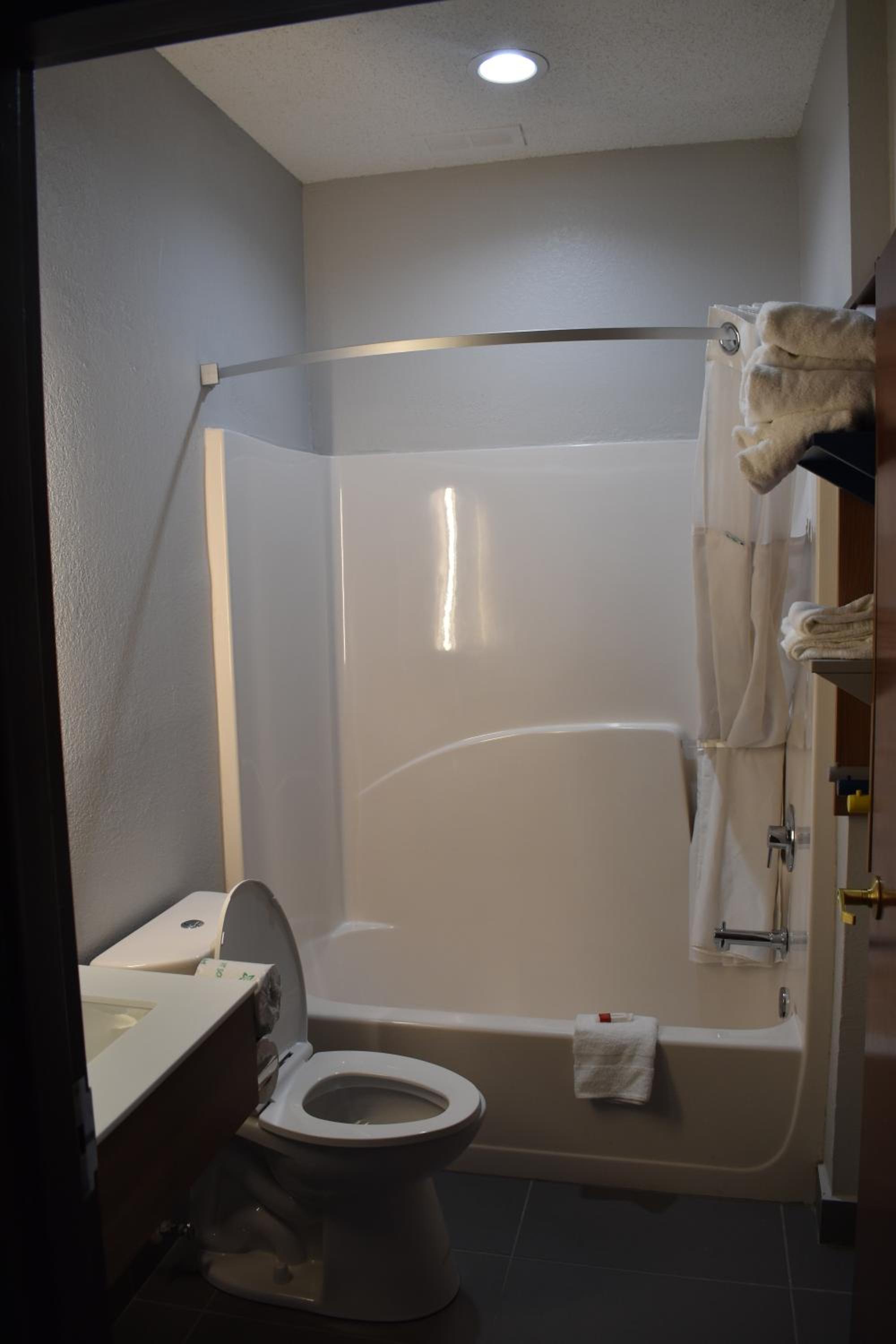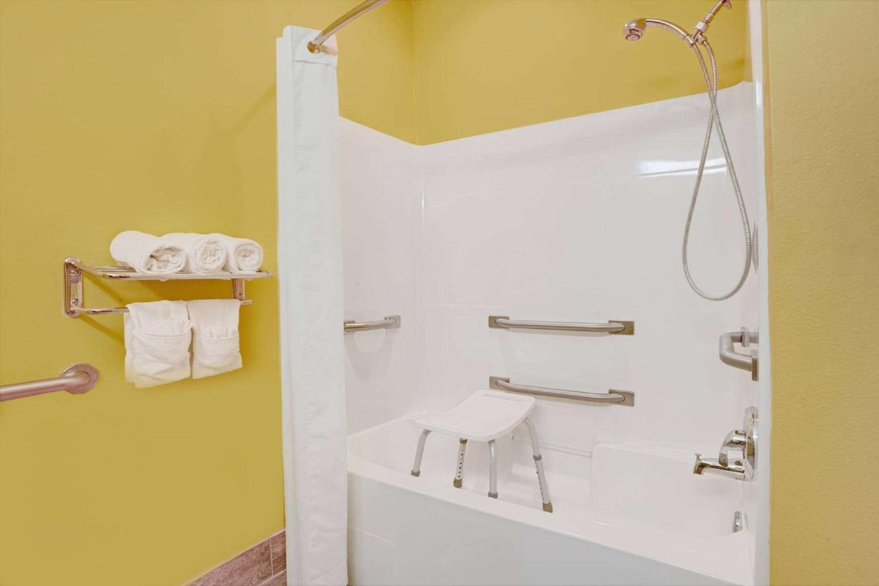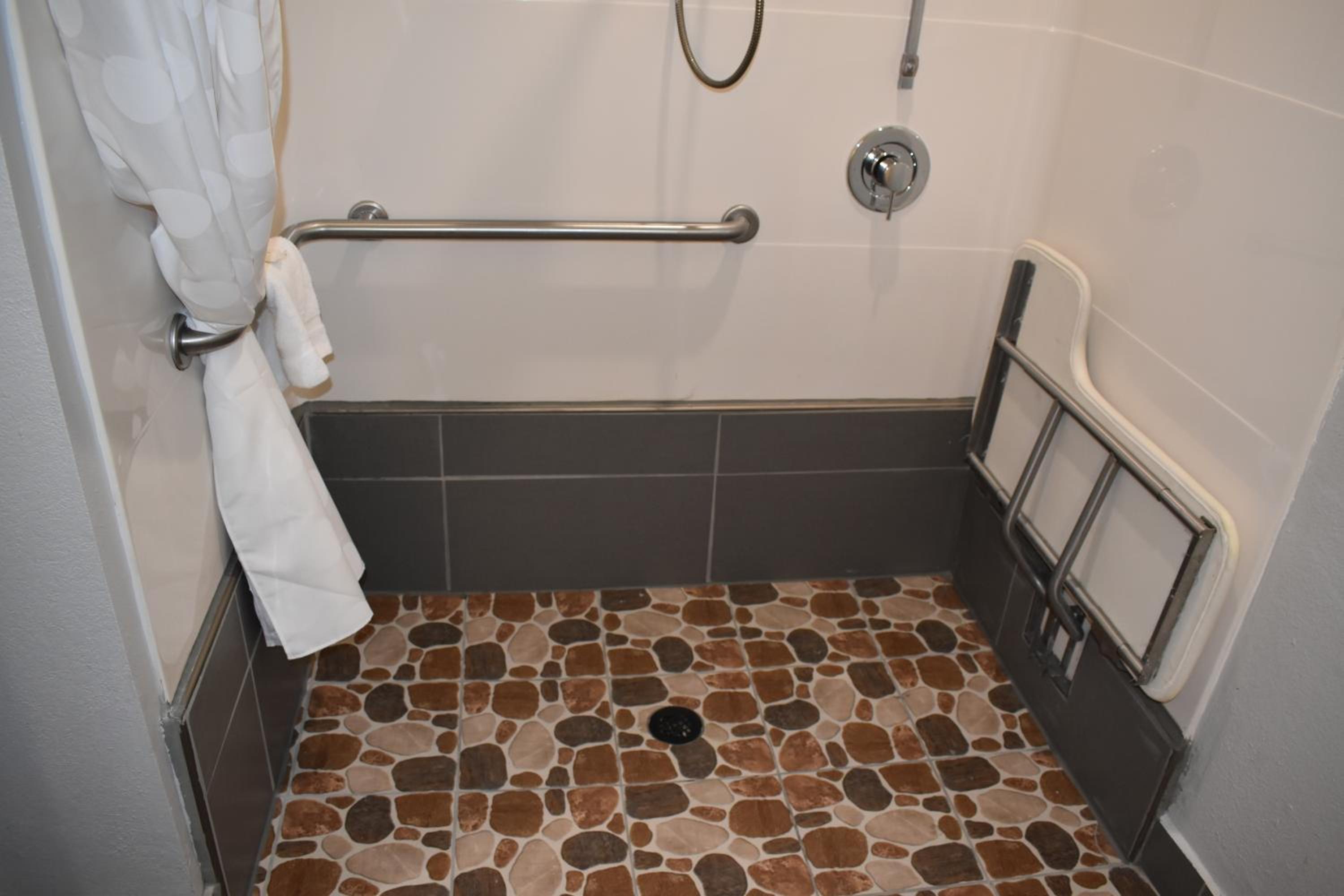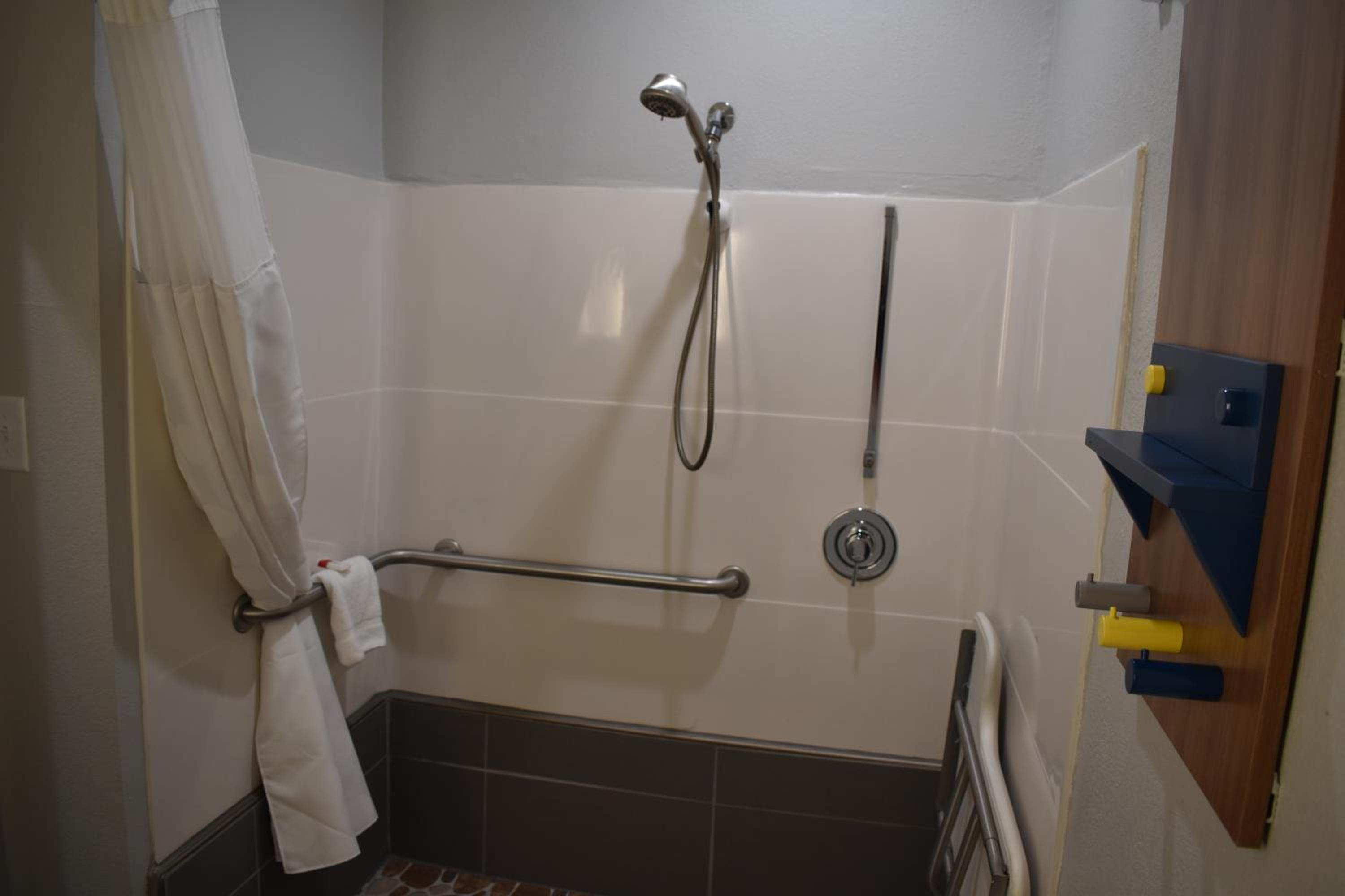 Friendly staff. ADA room was able to fit 2 full size mobility scooters while leaving room to walk. Bathtub had several handrails. Only negatives were no rail at toilet and no shower stall.