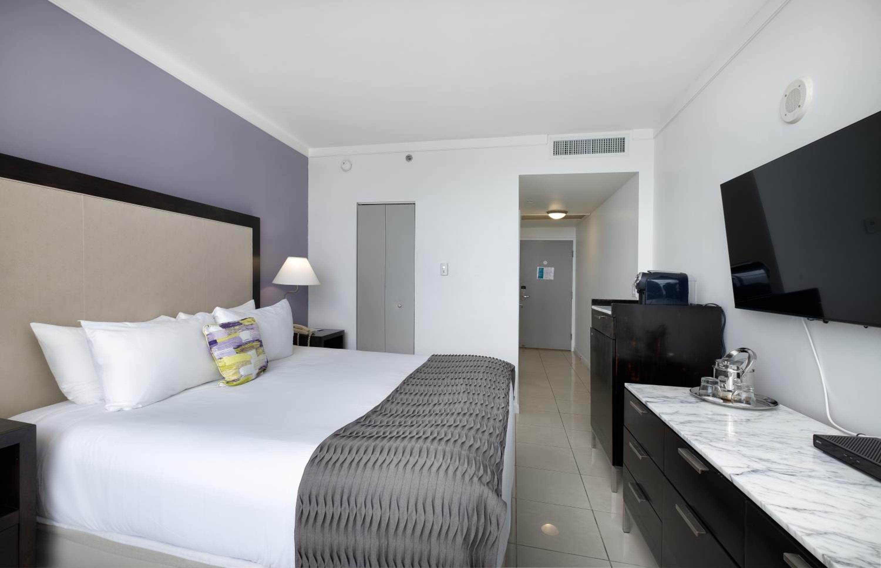 Relax in modern guest rooms featuring a 42-inch flat-screen TV, alarm clock radio, safe, and coffee maker.