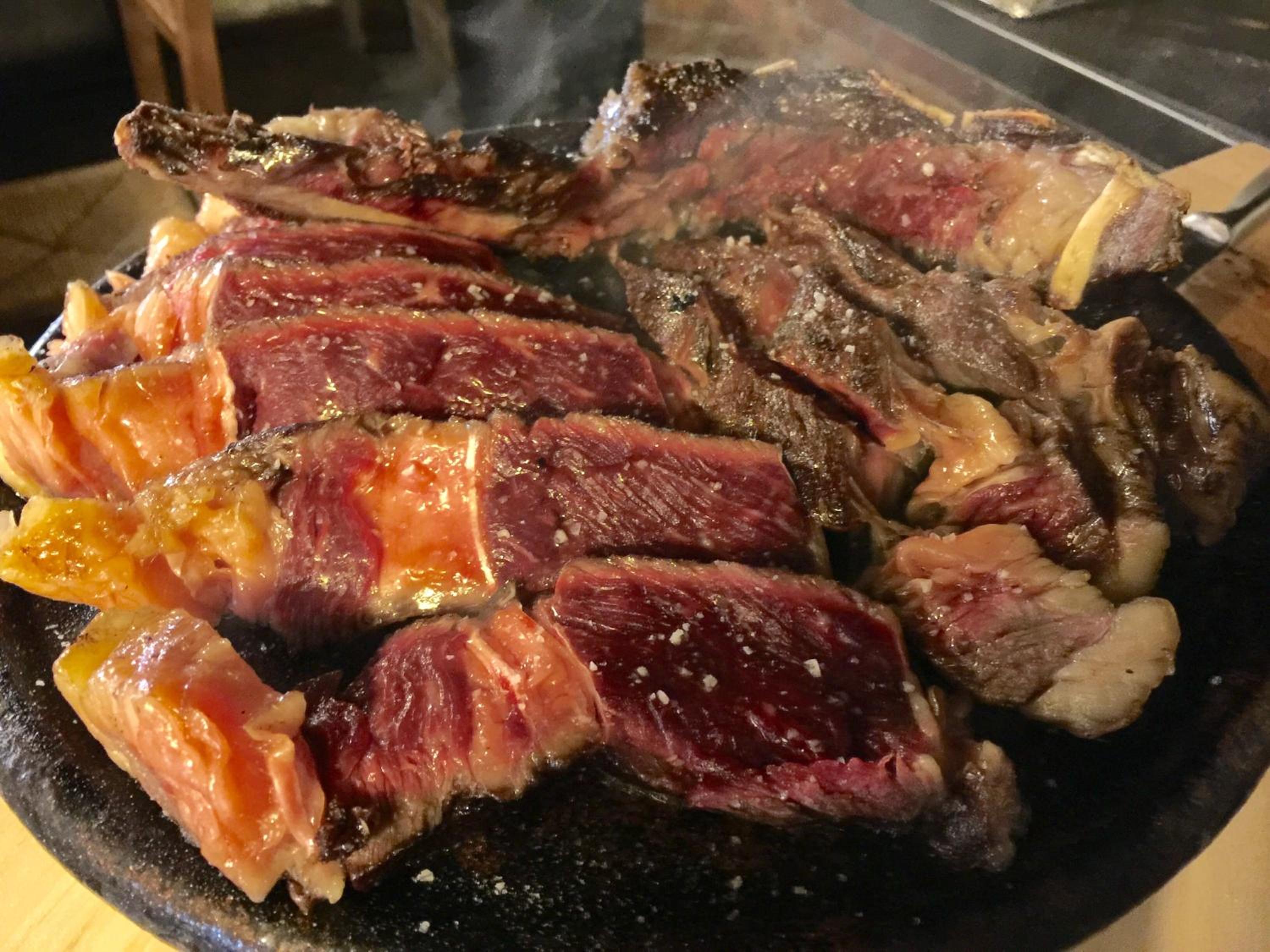 Une dame à l'accueil puis au service, très compétente et énergique. La côte de bœuf maturée exceptionnel et les sorbets en dessert excellents. Chambre calme et propre.