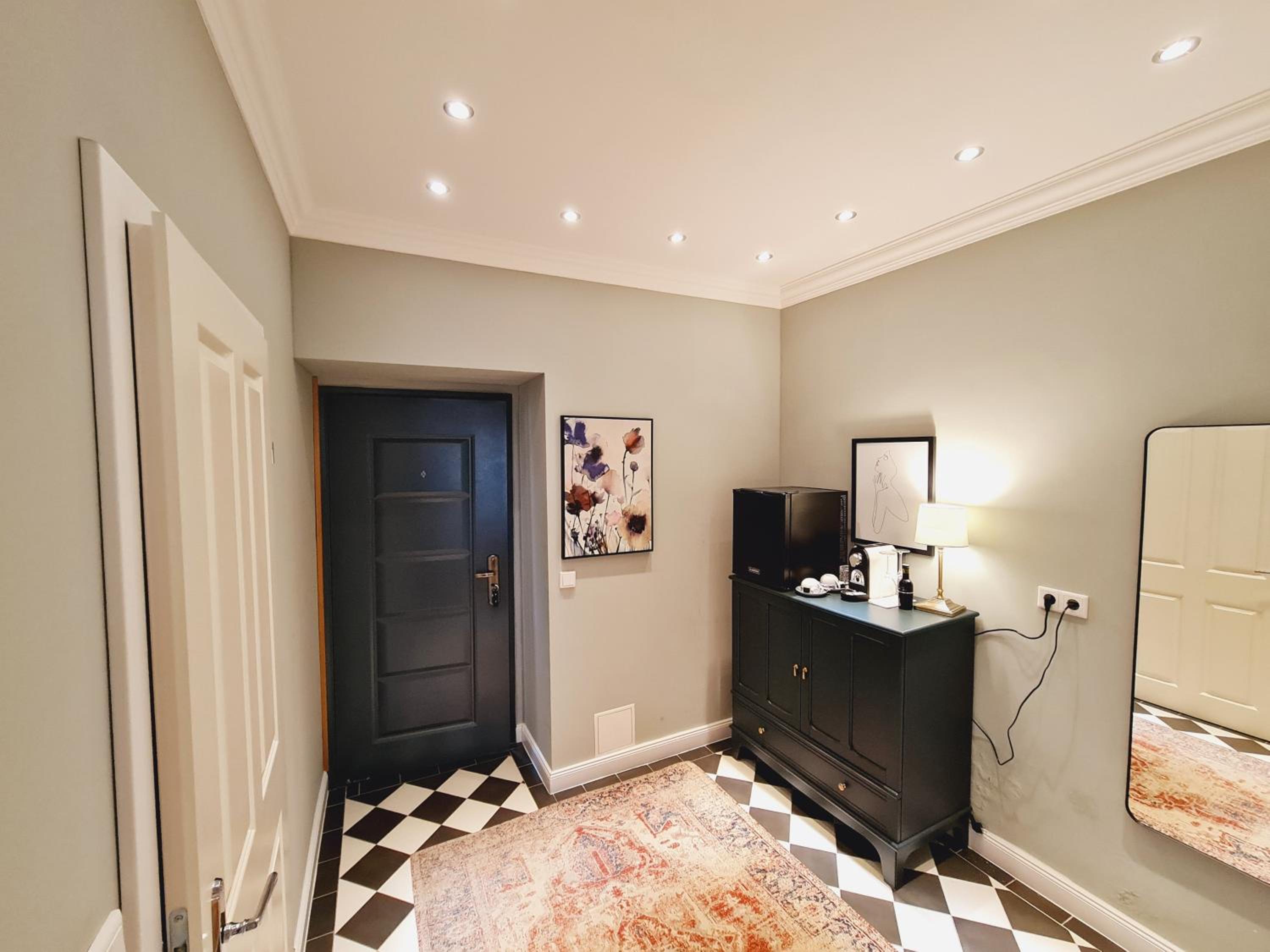 Großes Zimmer mit Vorraum, Bad, Essbereich und Schlafzimmer.