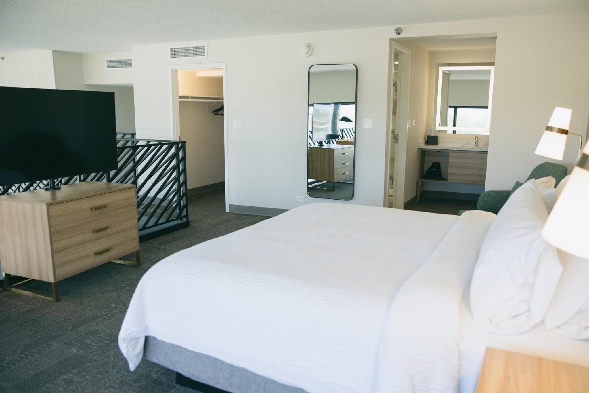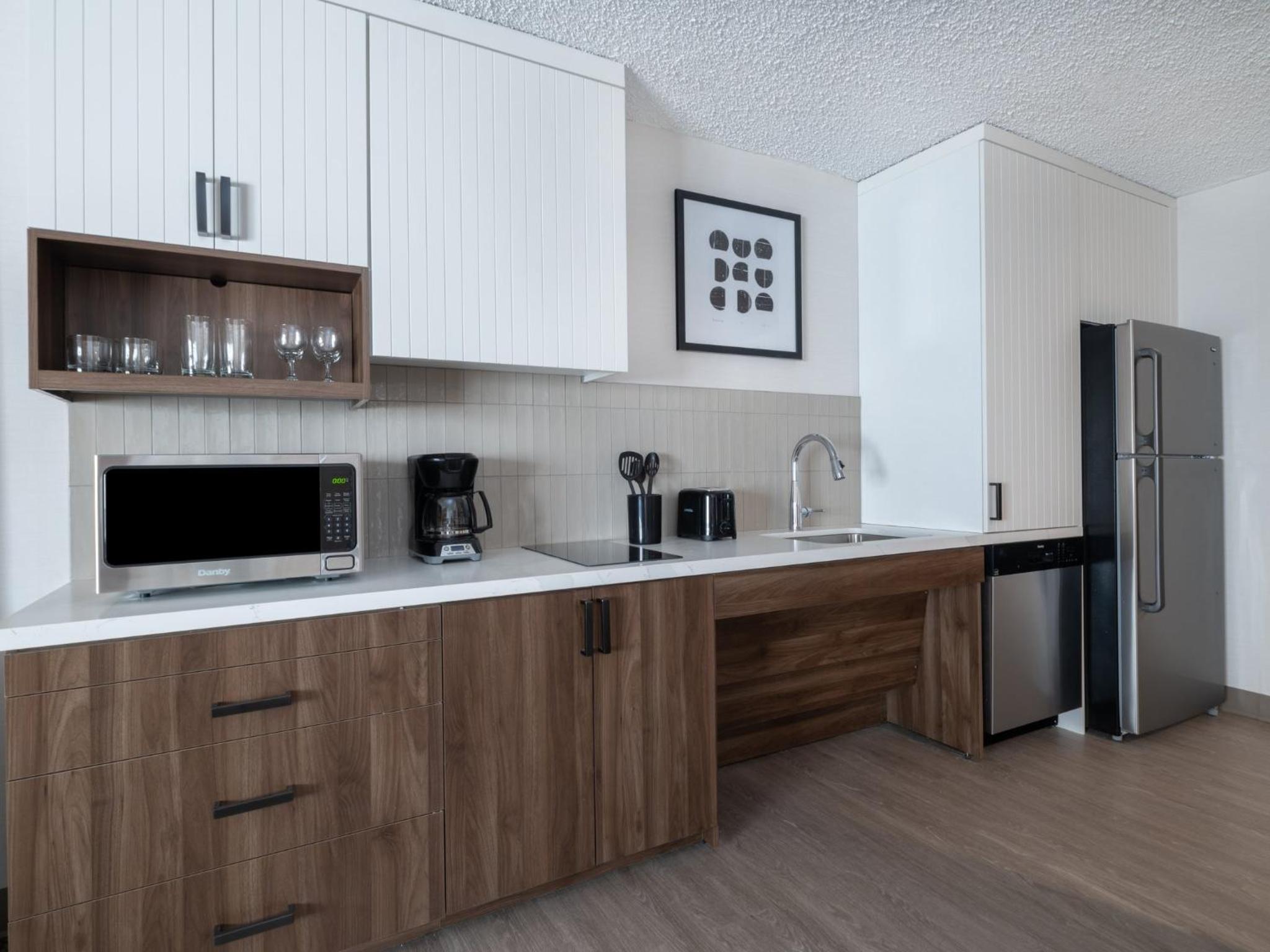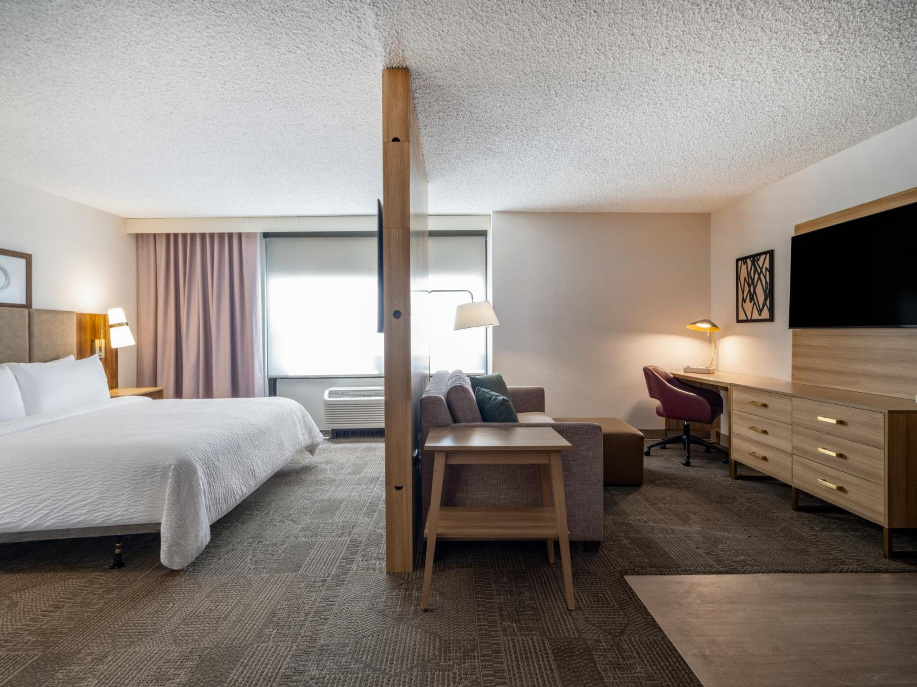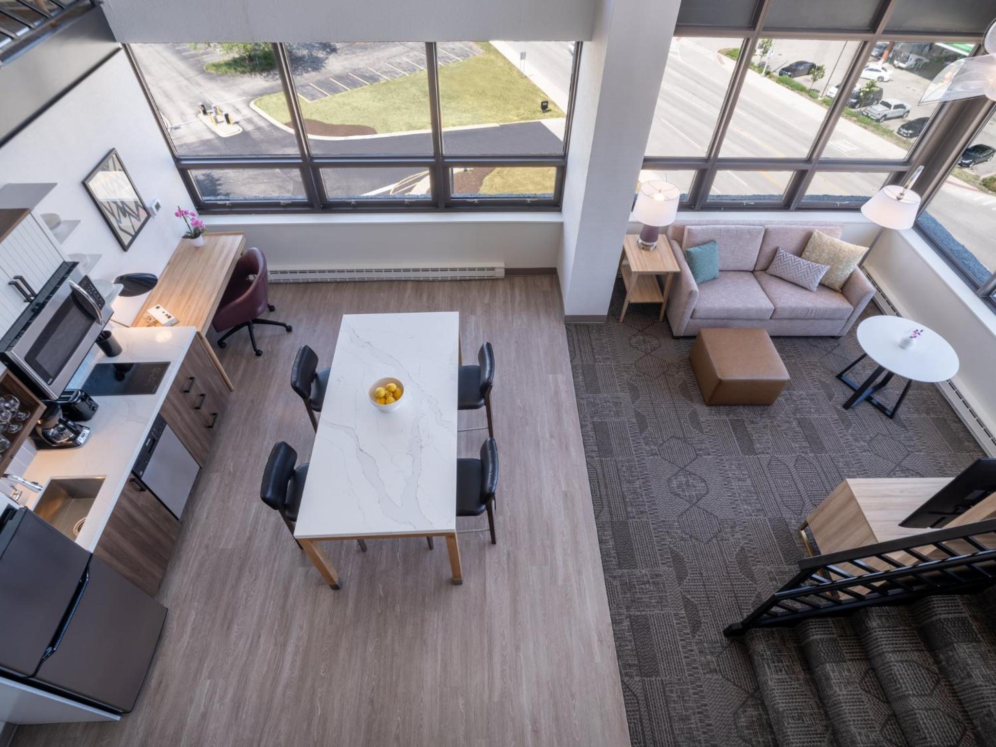 Our king studio was very clean with a comfortable bed, pillows and nice linens. The kitchenette was clean and useful. Just wish there had been a kettle but kind staff at front desk got hot water from the coffee bar for me. Only a shower, which was fine with us, but if you want a bathtub make sure one is included in description. Did not have the included breakfast due to early flight. Walls are lovely soundproofed but windows are old. Fan on AC worked great to cover road noise. Staff at front desk superlative and helpful. The ORD MMF with the rental cars is a 15 min walk from hotel. Very useful!