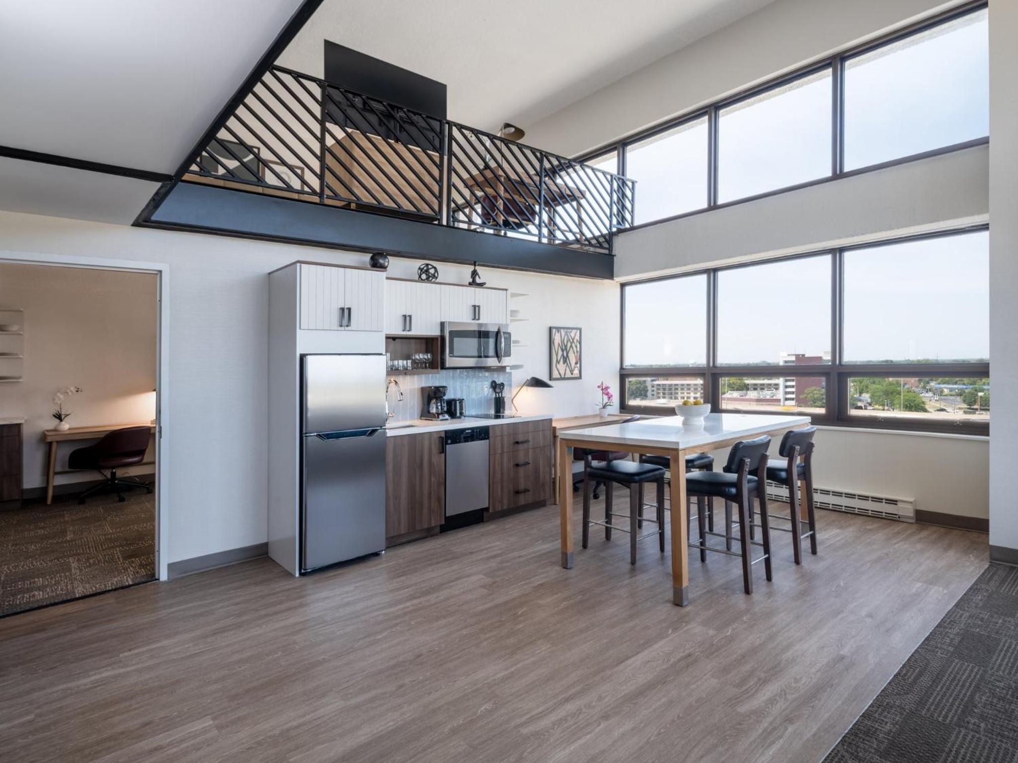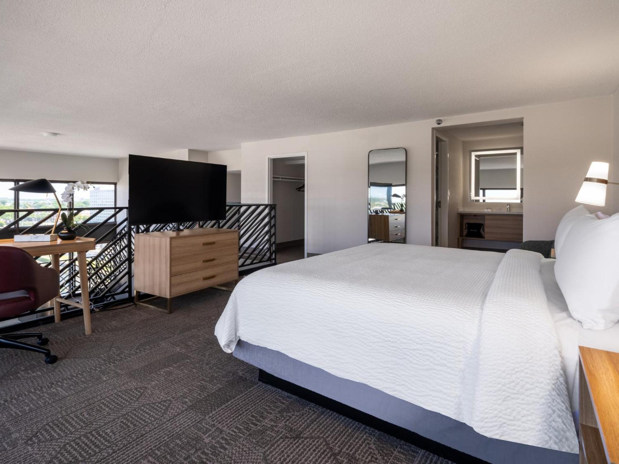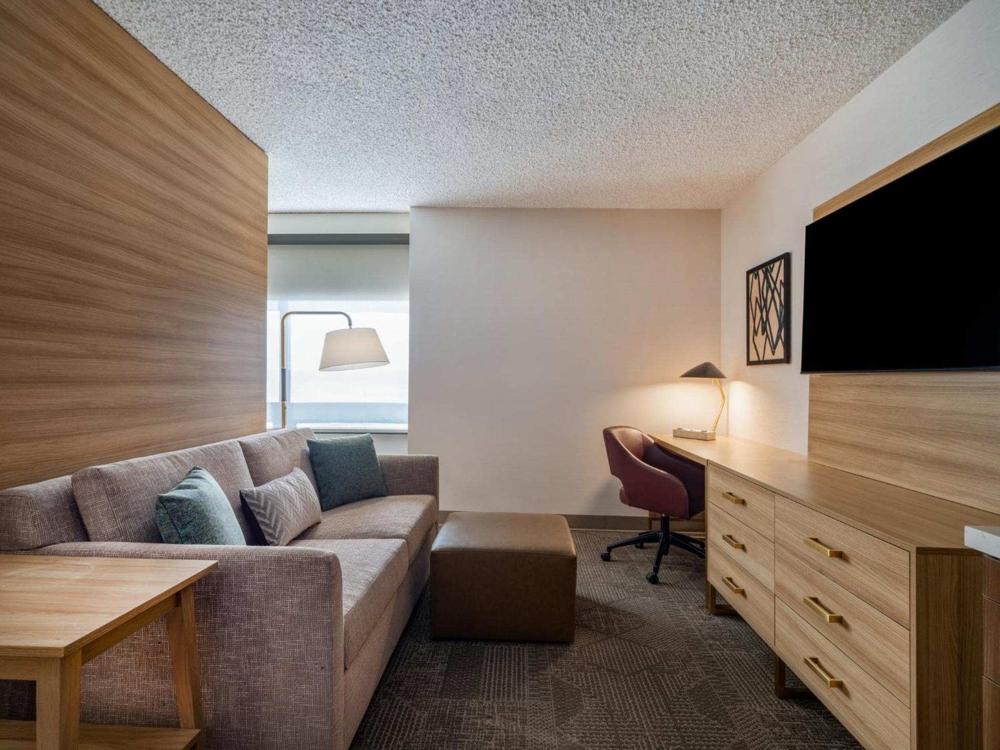 Our king studio was very clean with a comfortable bed, pillows and nice linens. The kitchenette was clean and useful. Just wish there had been a kettle but kind staff at front desk got hot water from the coffee bar for me. Only a shower, which was fine with us, but if you want a bathtub make sure one is included in description. Did not have the included breakfast due to early flight. Walls are lovely soundproofed but windows are old. Fan on AC worked great to cover road noise. Staff at front desk superlative and helpful. The ORD MMF with the rental cars is a 15 min walk from hotel. Very useful!