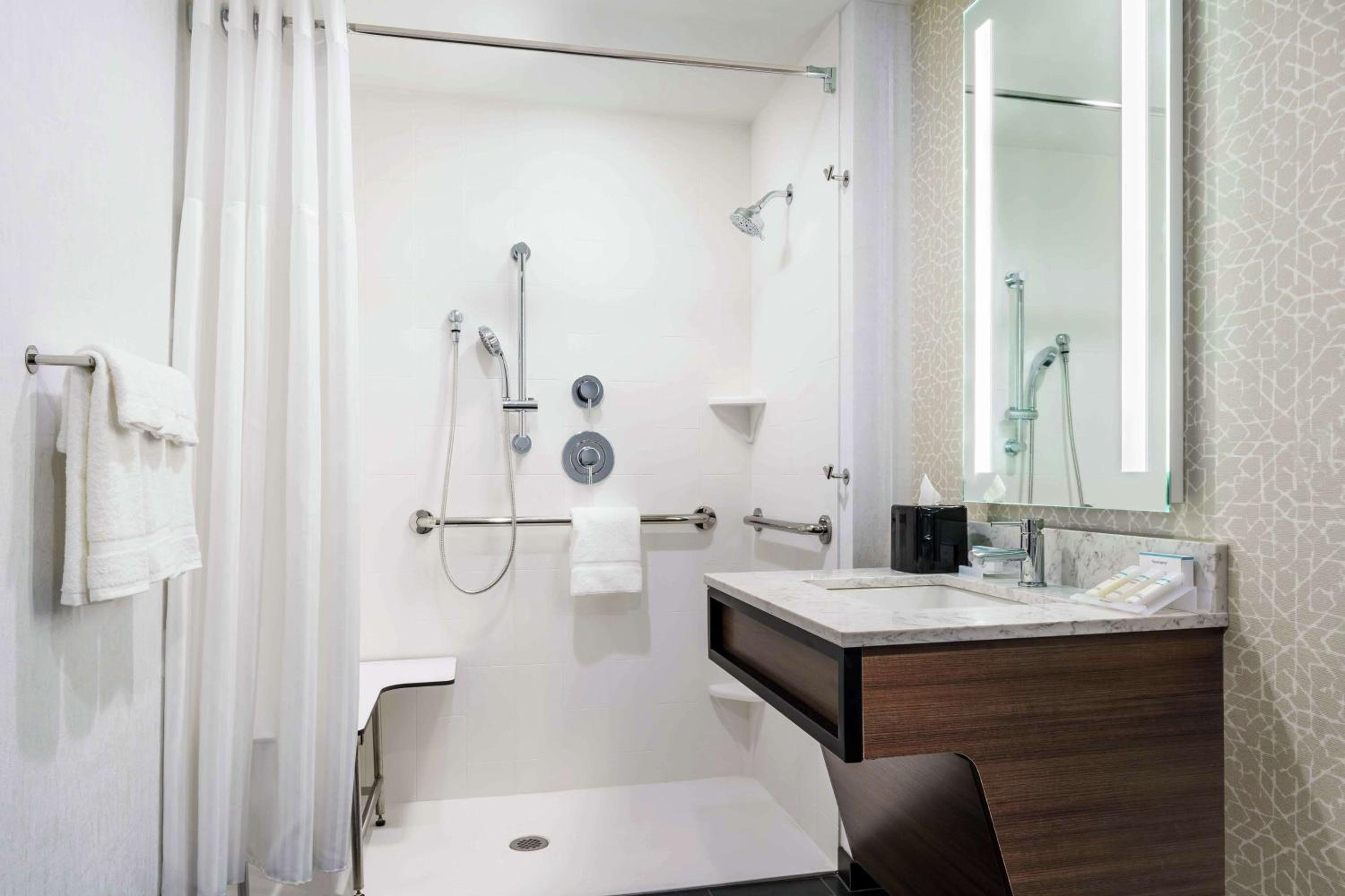 The room smelled moldy. I am guessing because it was a handicap accessible room/shower that at some point maybe it was flooded. The shower current was a foot too short so no matter how you had the shower head angled half the bathroom floor ended up wet and that was with us putting down towels and being careful.