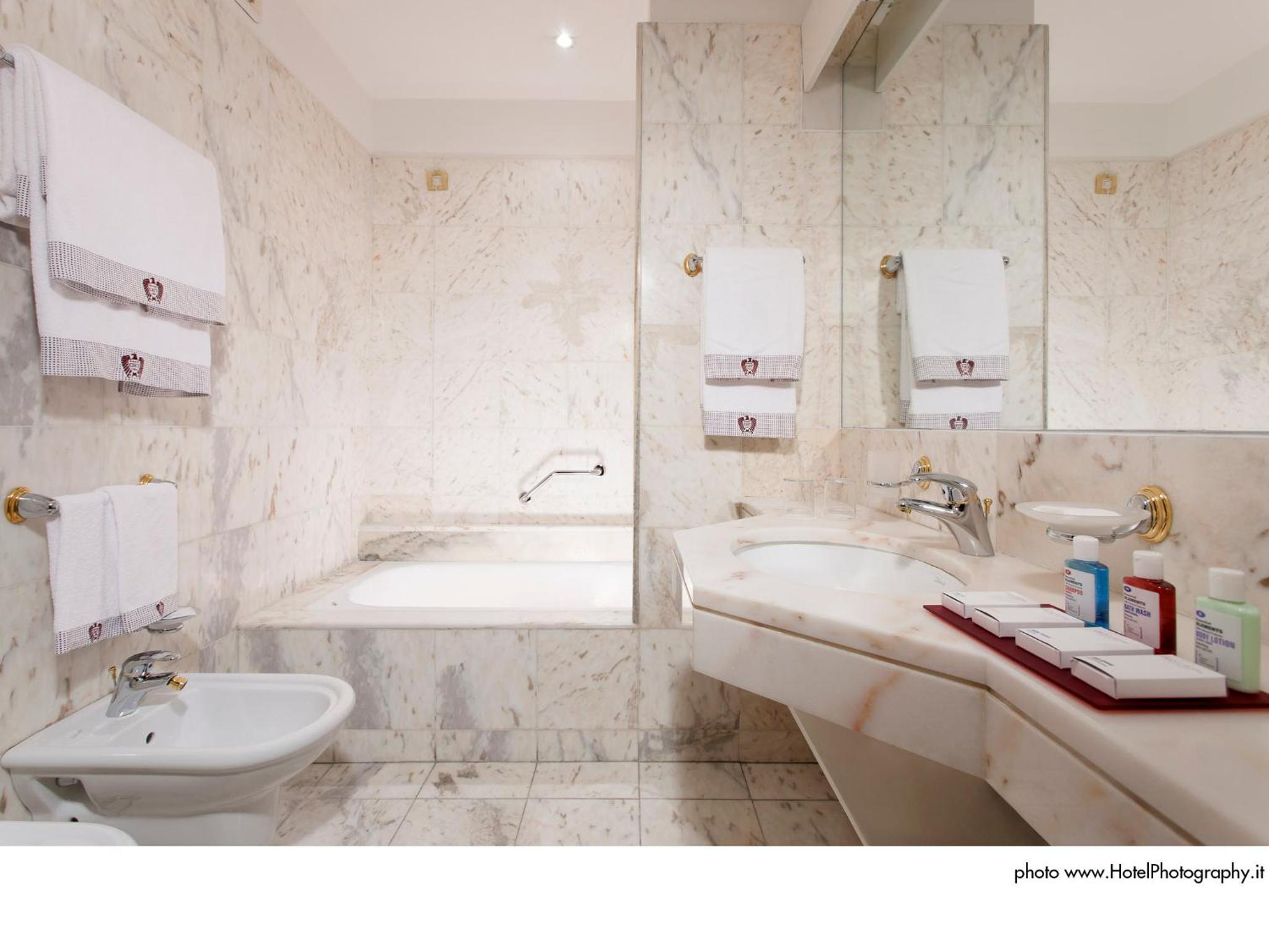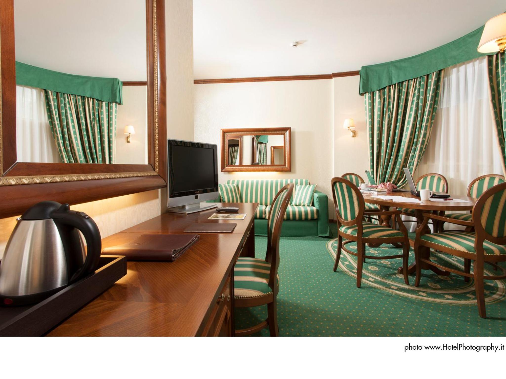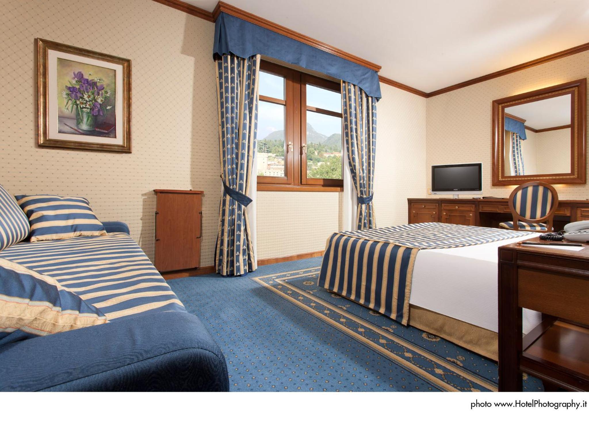 Grand Hotel Trento offers elegant rooms with wooden furniture, soft carpeted floors, and modern amenities like flat-screen TVs. Upgrade to sophisticated rooms with prized furniture and marble bathrooms for an indulgent stay.
