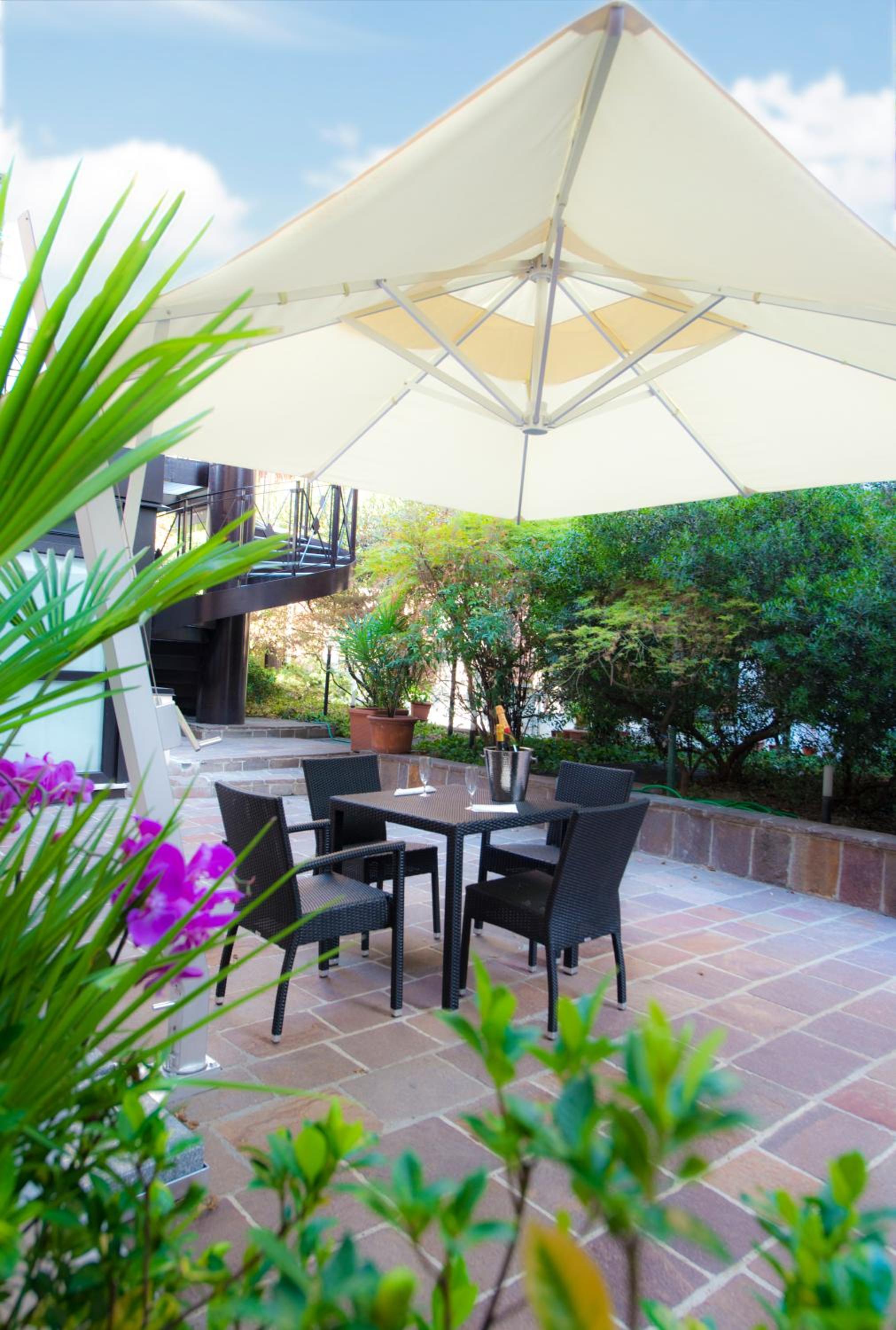 Enjoy a delightful buffet breakfast in our common area, featuring a variety of sweet and savory options. Unwind at the bar with live piano music, adding a touch of elegance to your stay. Some rooms even offer serene garden views, enhancing your relaxation.