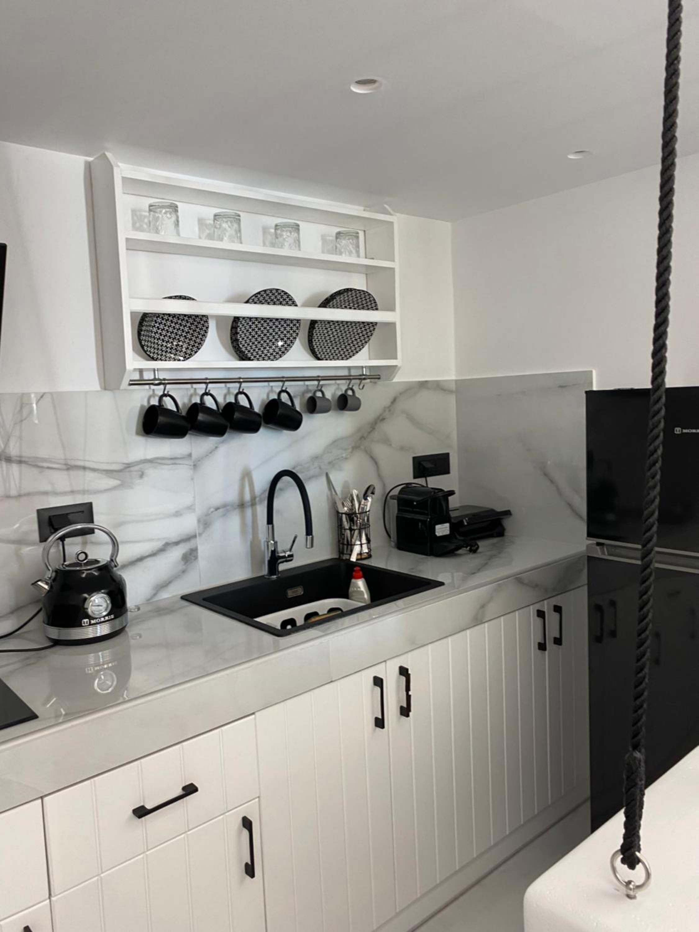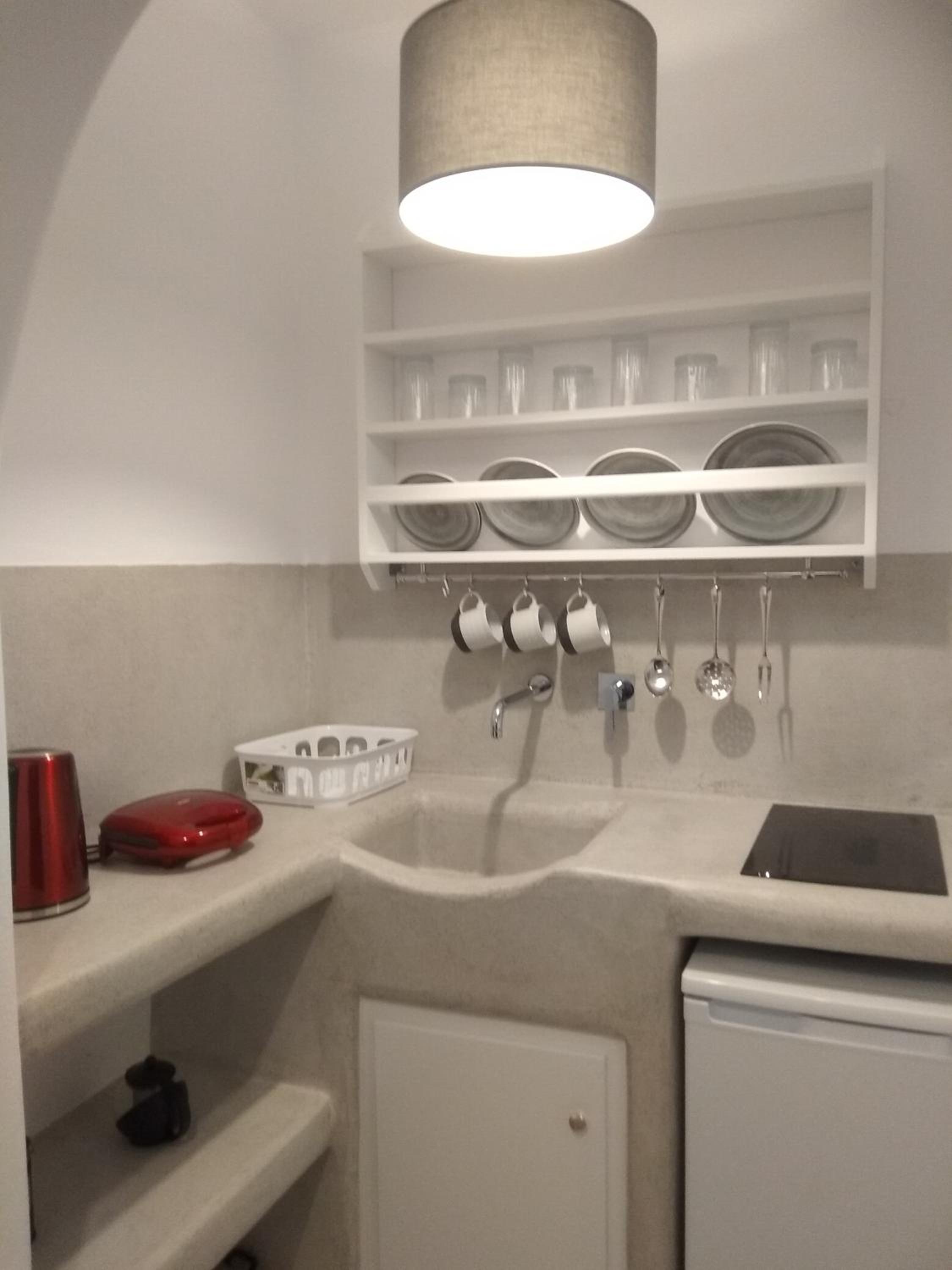 Il nostro angolo cottura aveva poco spazio per muoversi e c'erano pochi strumenti a disposizione (una sola forchetta e un solo piatto fondo) ma è comunque dotata del necessario per cucinare una pasta o un'insalata.