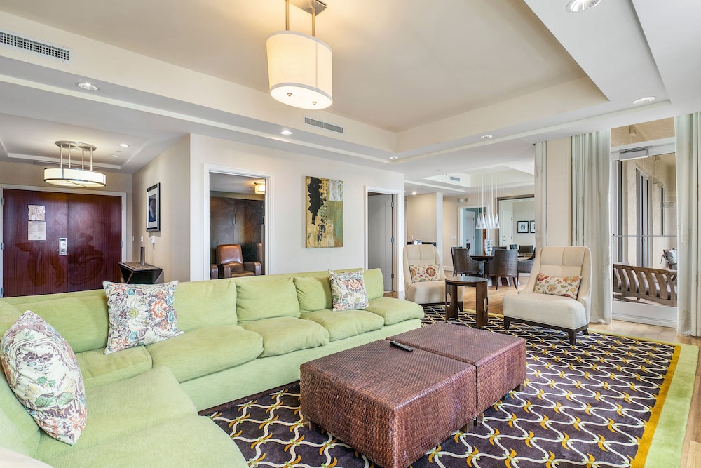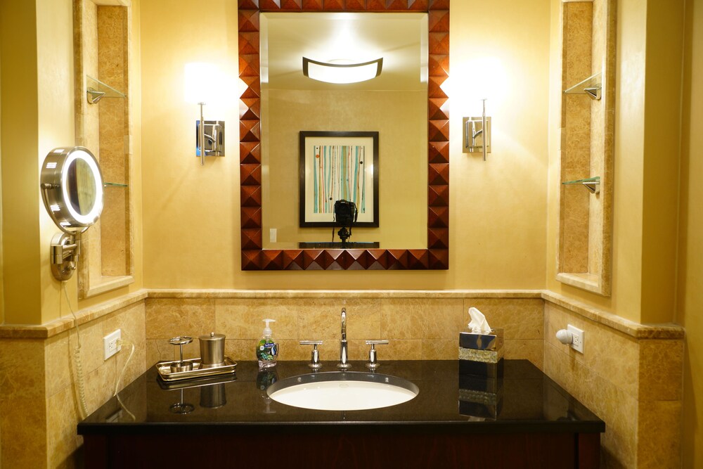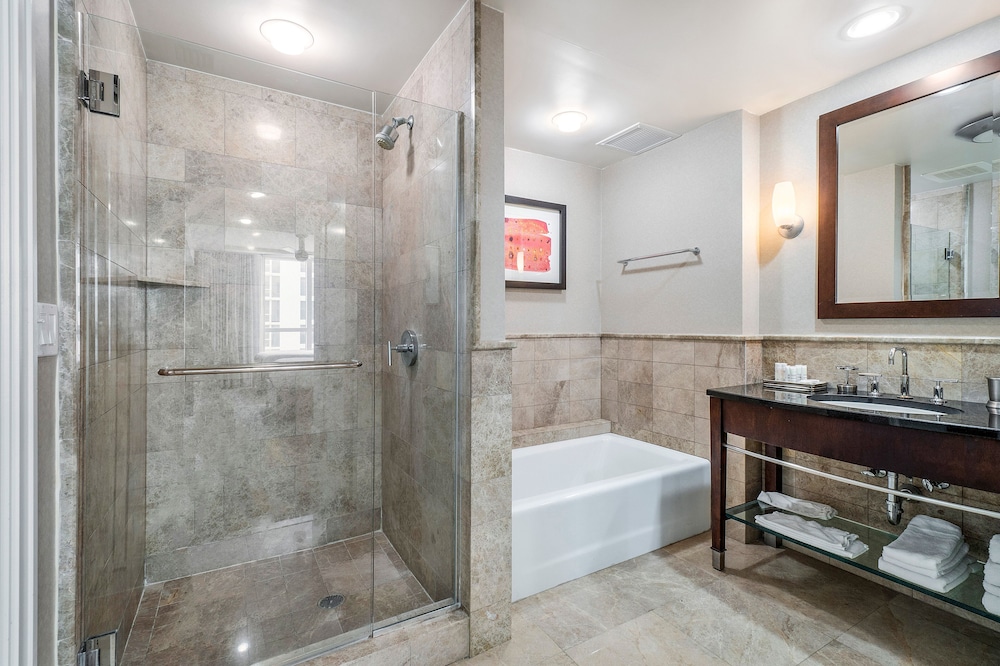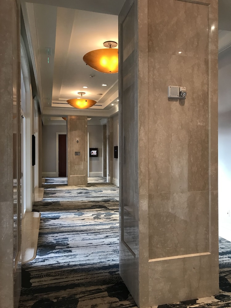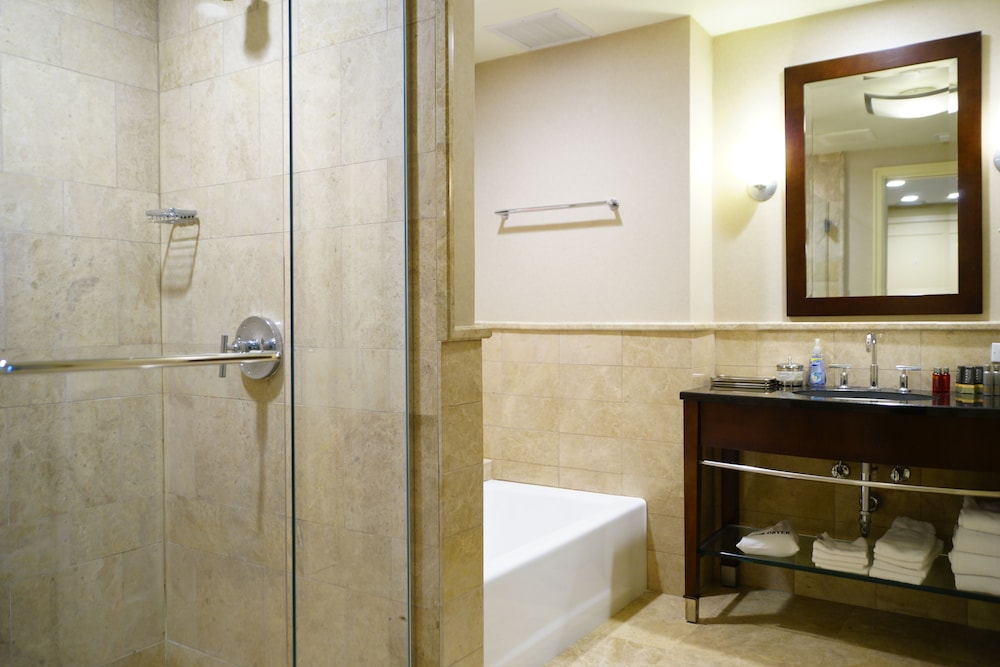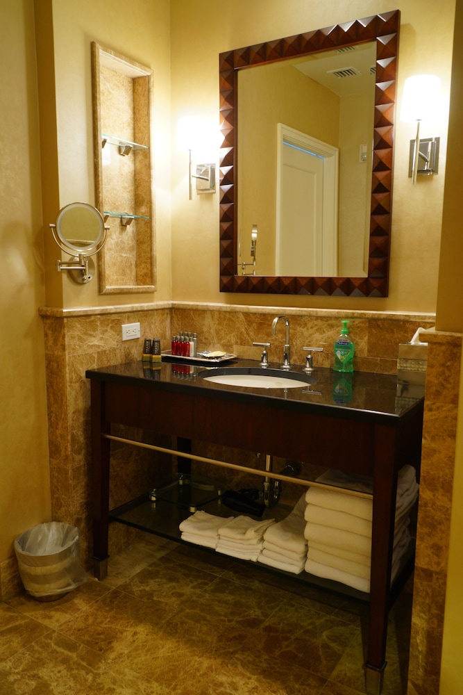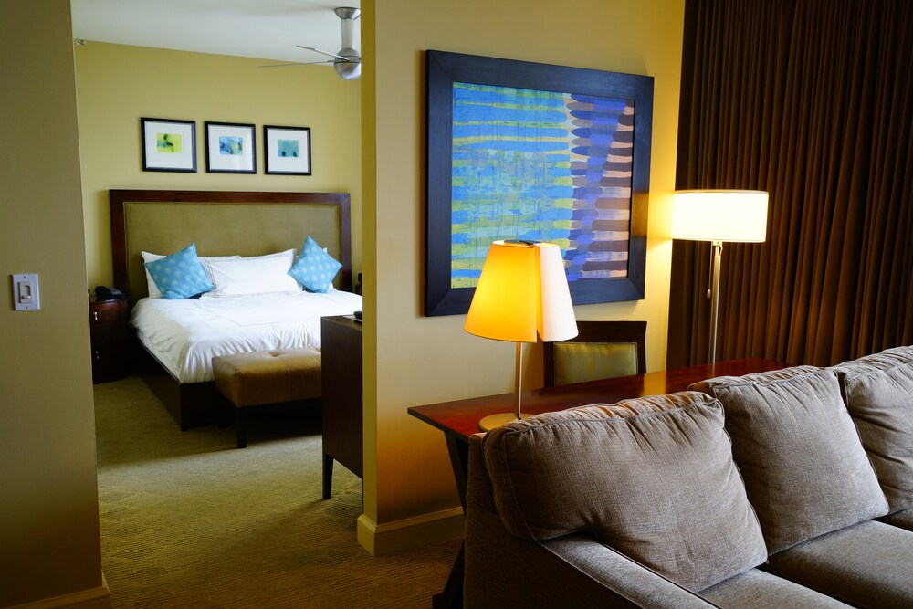 The room looked clean and nice at first glance but as we settled in we realized it is in need of deep cleaning. There were stains on the couch/sofa bed, throw pillows and the sofa bed itself was unstable and didn’t set up properly. As we were setting it up we realized we didn’t have any sheets for it (there were only itchy blankets and comforters available). When we called to ask for sheets and to inform them about the sofa bed, the gentleman was very defensive saying “no sofa beds are comfortable” and since we bought the least expensive room (keep in mind we booked the “luxury king suite”) that we shouldn’t expect anything else but that he’d be glad to upgrade us at our expense. The room wasn’t very neat. Lamp shades were tilted, shelf items were pushed to the side and not placed very neat. All in all it was terrible. Since this property shares the property with Marriott, it seems nice at first but it’s definitely not up to Marriott standards for hospitality, cleanliness or comfort. Spend the extra $$$$ per night to get what you’re expecting.