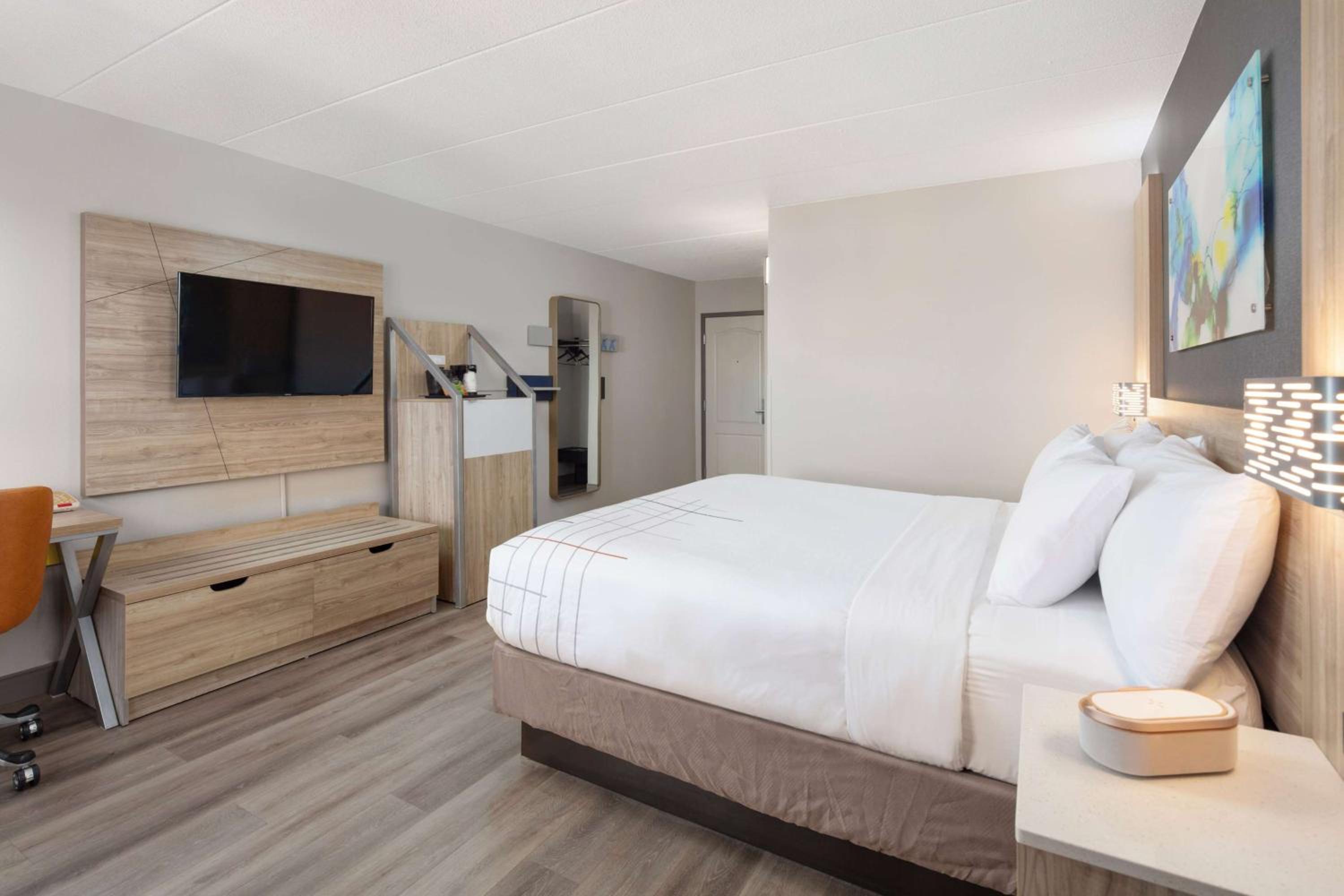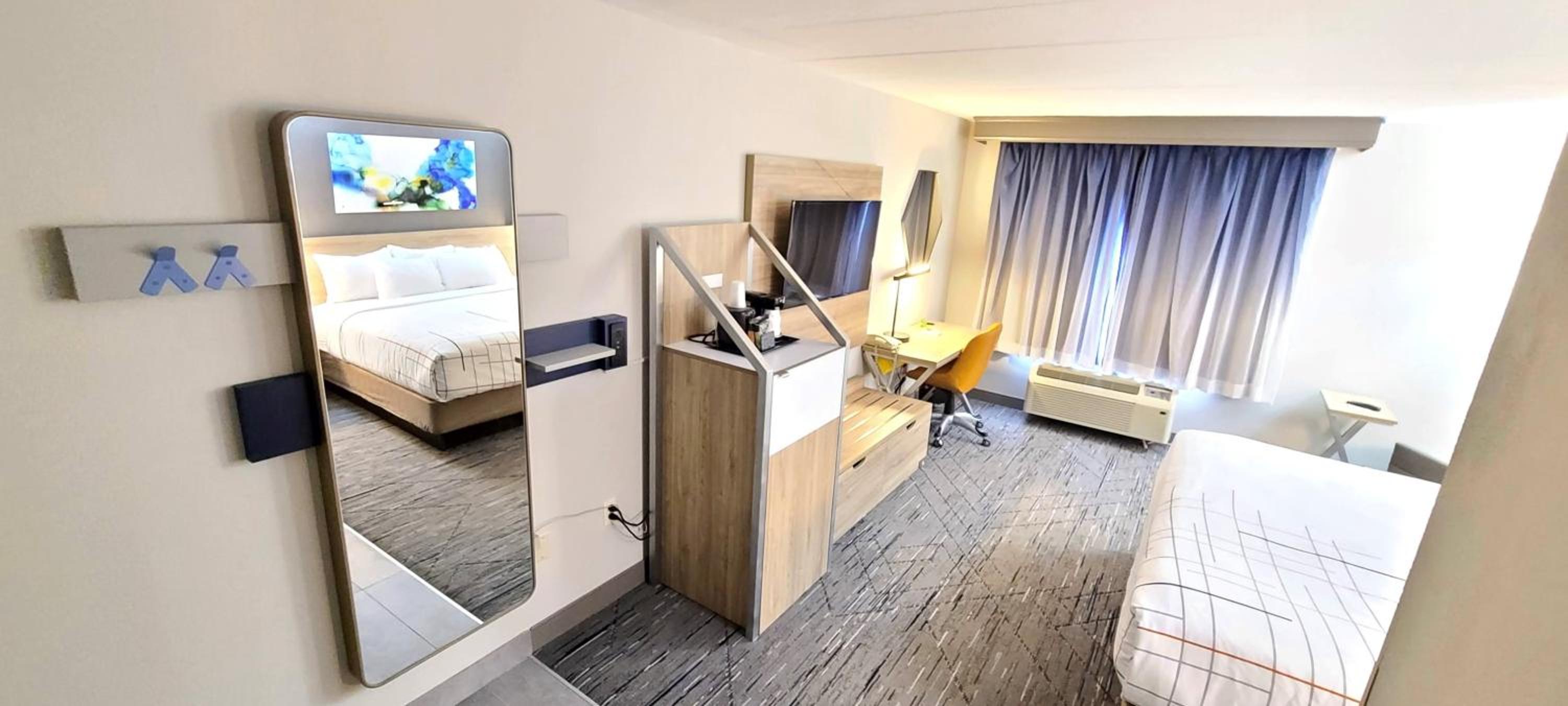 Rooms modern and well equipped with fridge, microwave, and coffee makers. Clean and comfortable bed. Nice breakfast for a hotel of this class.