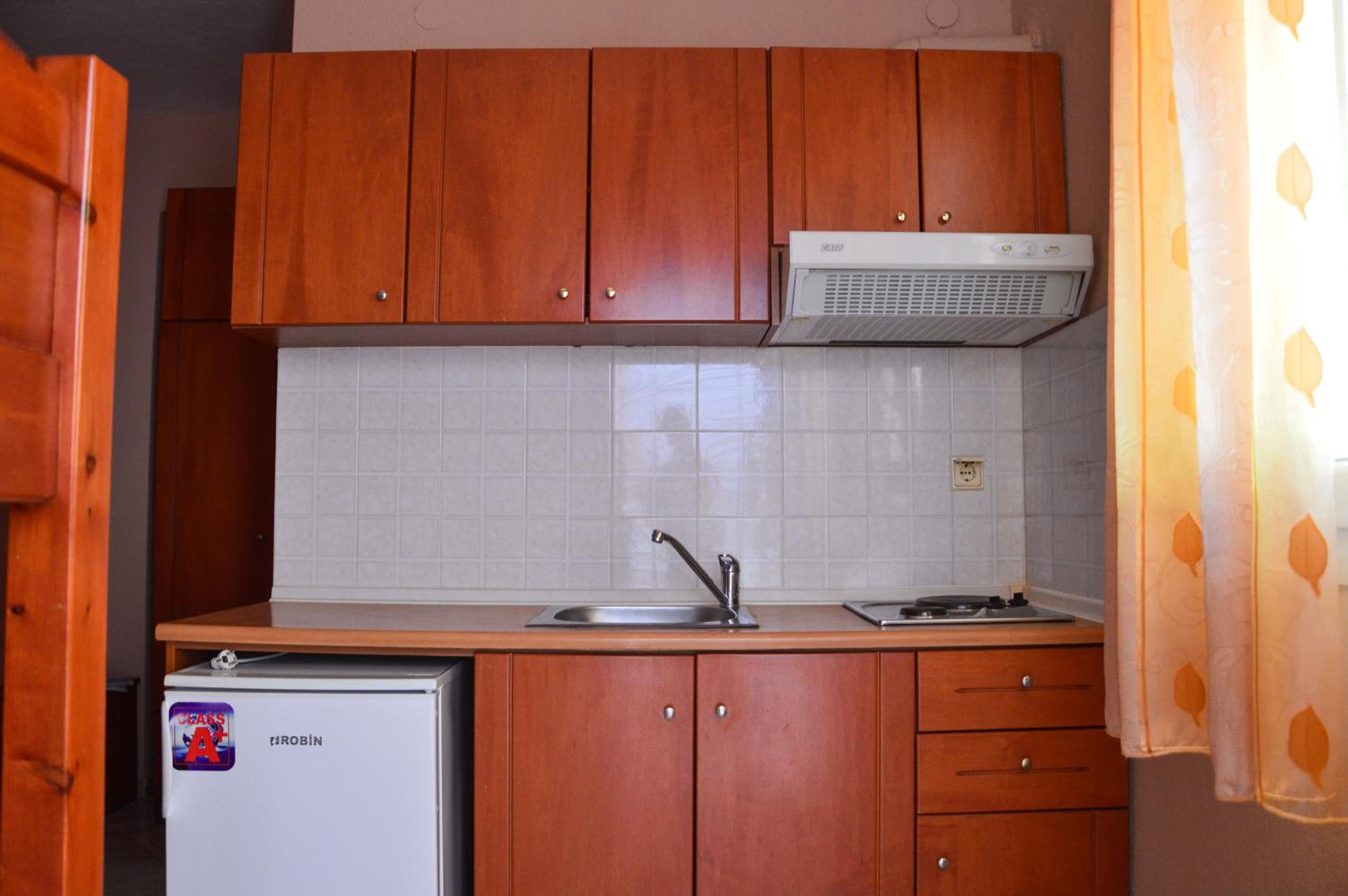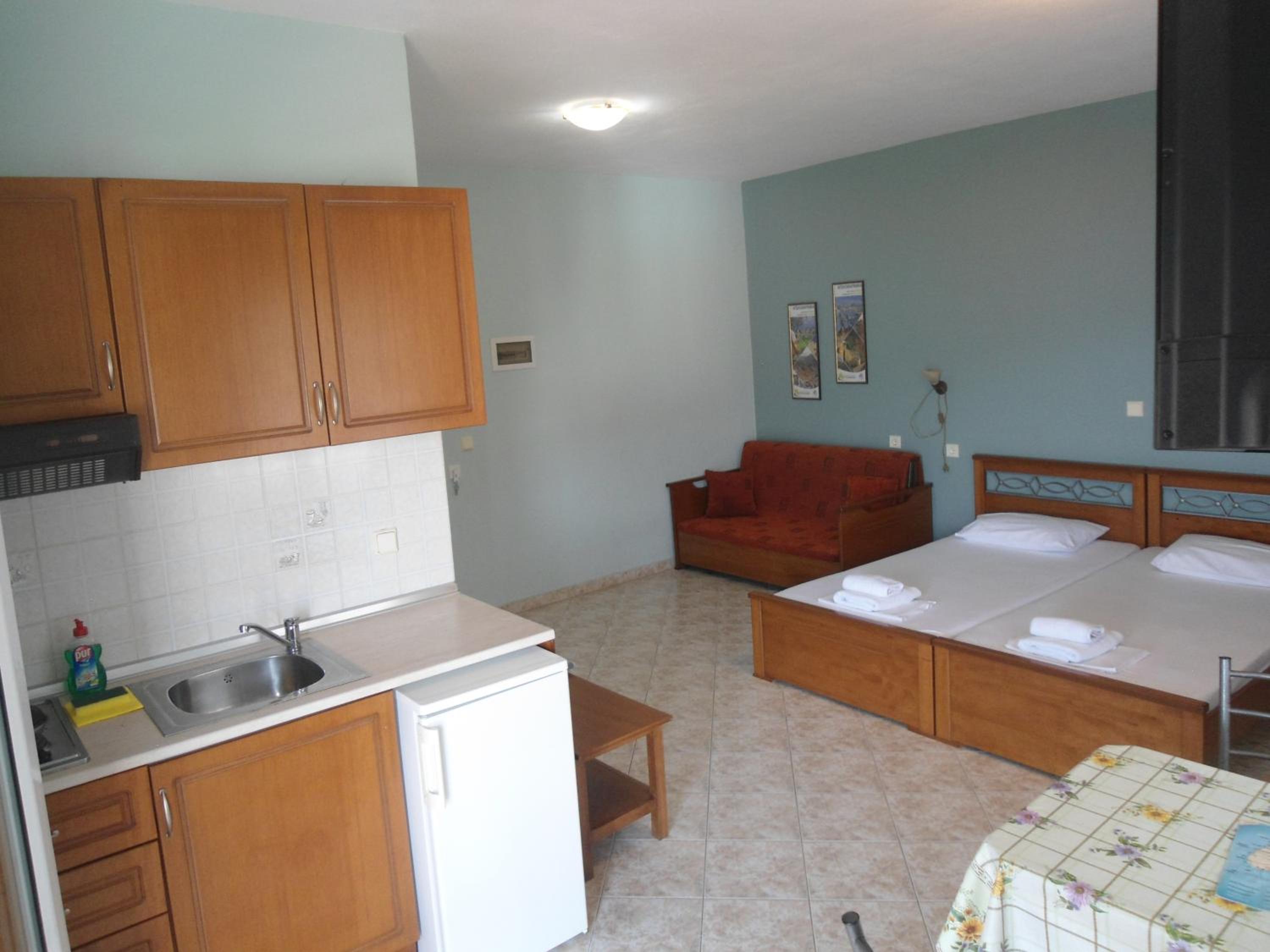 The location is good, near sandy golden beach. It is also very clean. The beds are comfortable. The kitchen has a modern stove. The air conditioning is good. You can buy pine honey from the guests.
