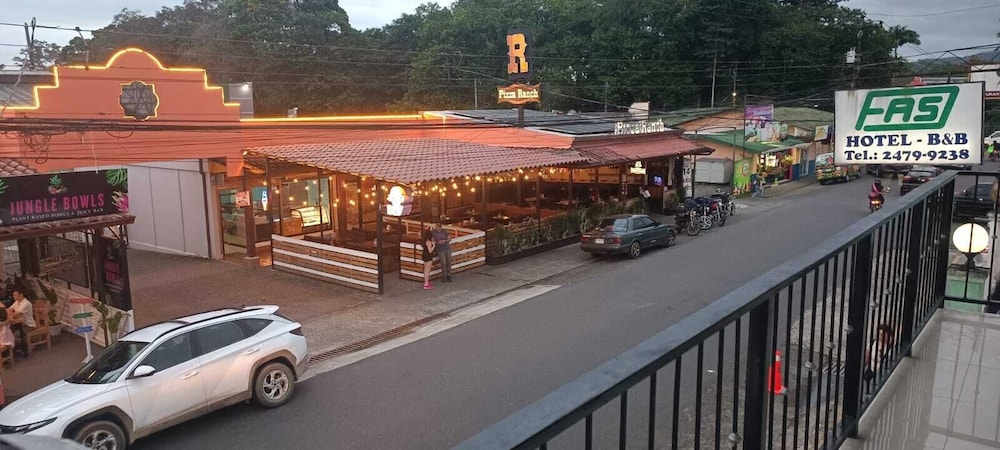 Great choice for car drivers as gated parking lot. Very comfortable room with ac, fridge, good wifi and two beds and breakfast. Very helpful Mauricio advice and booking local park entrances. Would have missed somethings without his input. Included visit to thermal pools. A bit noisy from intermittent road traffic at night, but also able to walk everywhere as downtown La Fortuna. Inexpensive.