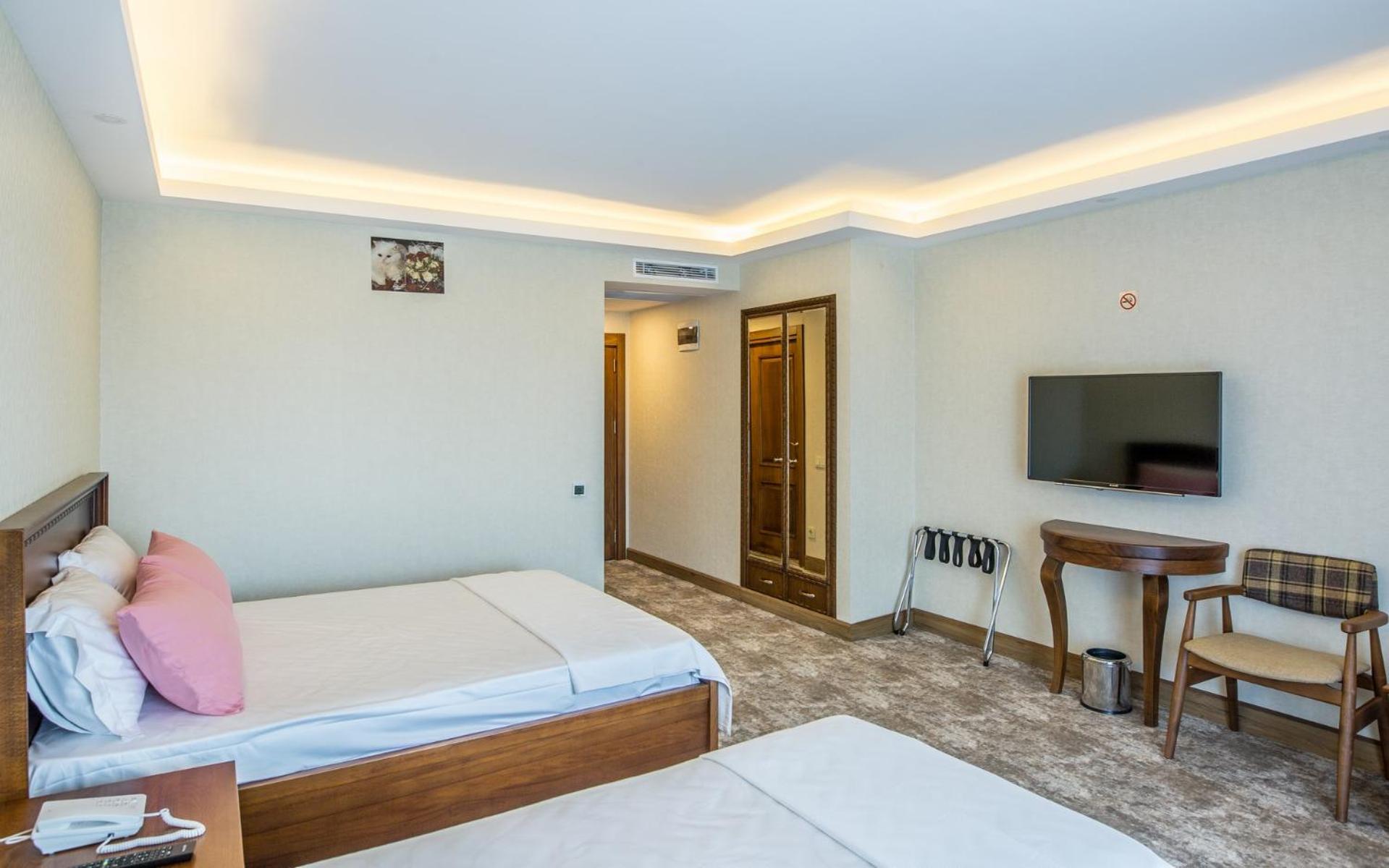 Sakin bir yerde, F/K oteli, geniş odalar, temiz yatak ve banyo. 4 yıldız bir otelde olması gereken ekipmanların hepsi mevcut.
