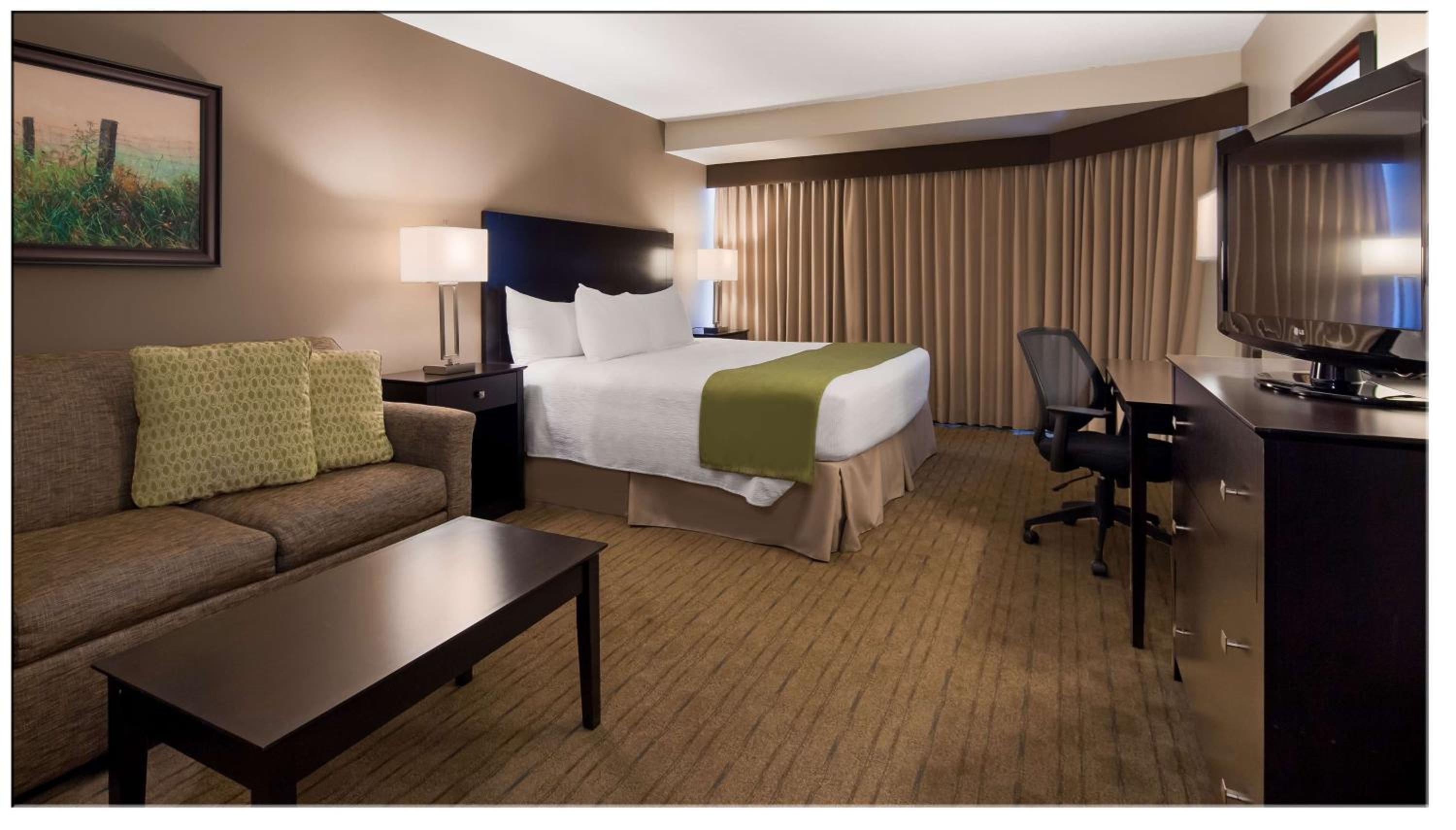 The front staff at check was very friendly and helpful. We traveled with our dogs and there were good places to walk them. It was quiet for sleeping. Coffee in lobby was good in the morning.