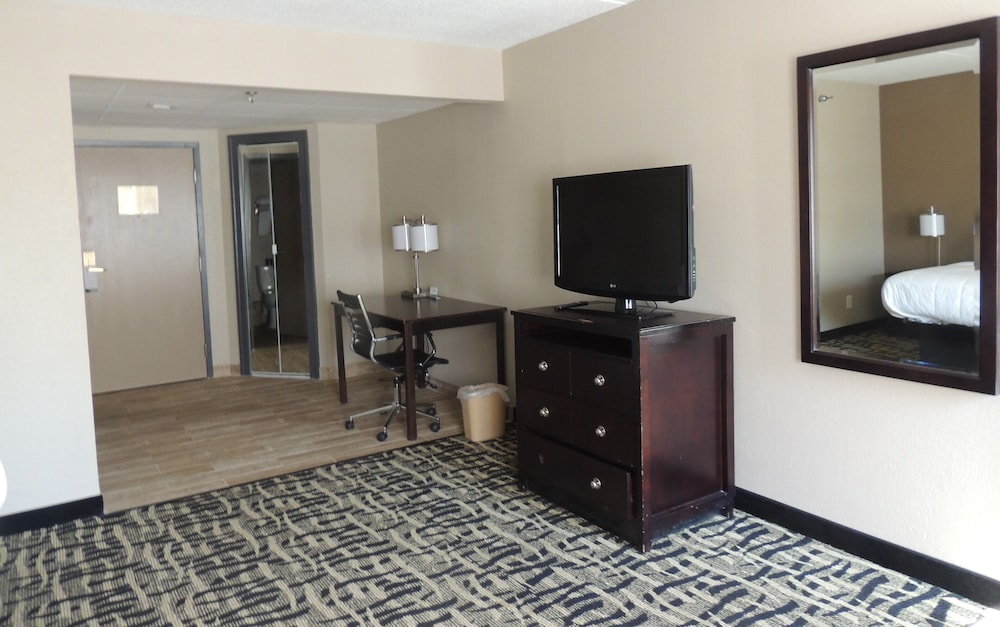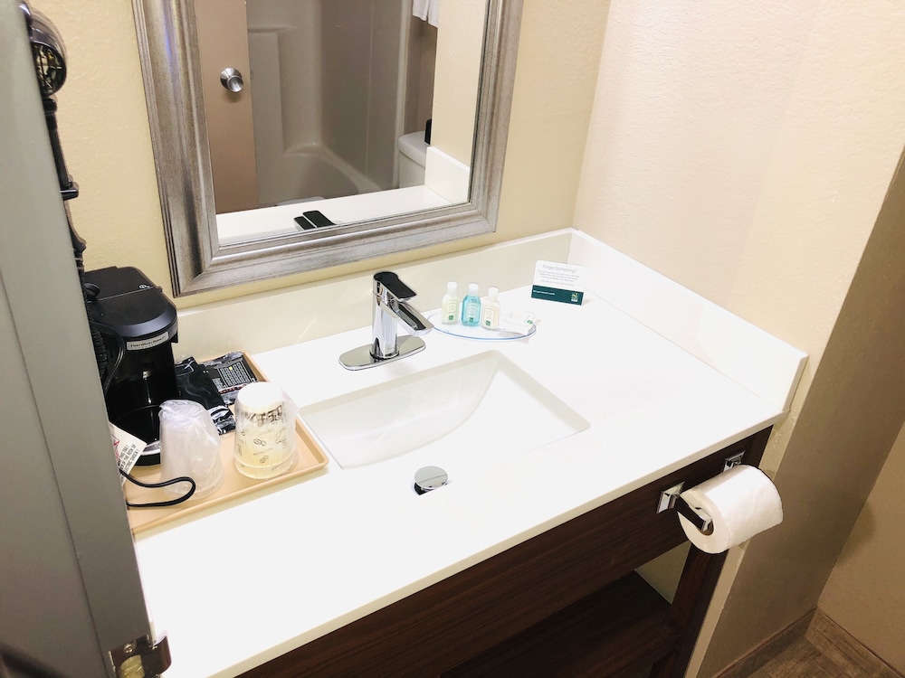 Conveniently located off freeway, clean, friendly staff, continental breakfast of coffee, juice, cereal, waffles, breakfast sandwiches, yogurt, fresh fruit. Room was spacious, bed was fine, the pillows were too small and too soft and the AC was very loud. The doors, some of the walls and ceiling could use a paint touch up. Had to drive a bit to get to area with restaurants, shops, etc., but it was good for a nights stop.