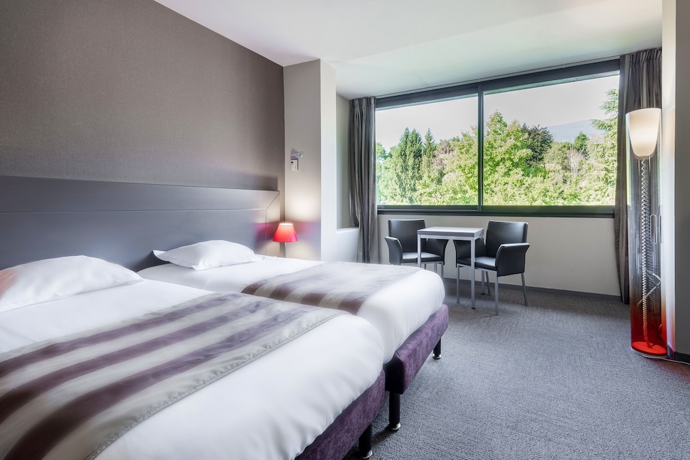 Chose it fro proximity to airport to drop off rental car and access to airport next day thinking there would be some sort of shuttle/public transport to the two nearest towns Chambery and Aix-Les-Bains. Much to our surprise there was no such transport. The hotel was basic but very expensive for what was on offer. The restaurant food was OK but overpriced for the quality. In retrospect I would have made alternative arrangements to drop off rental car the same day as using airport.