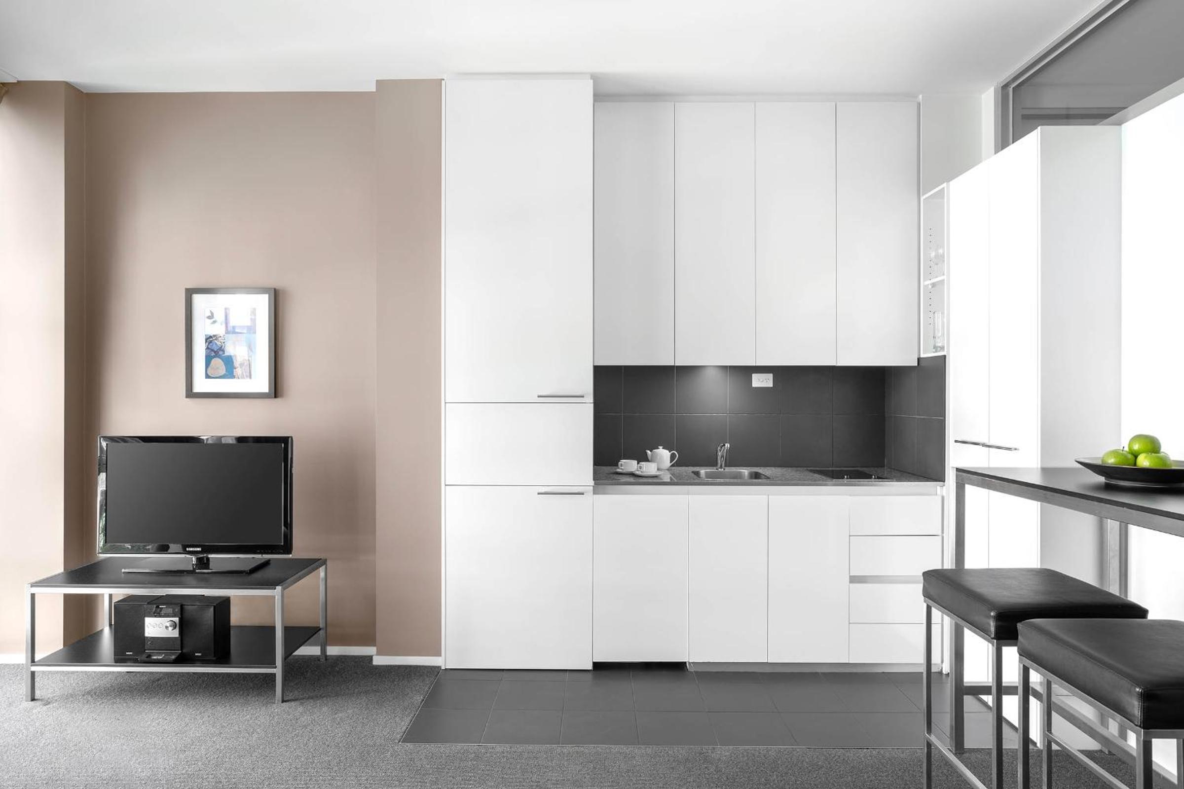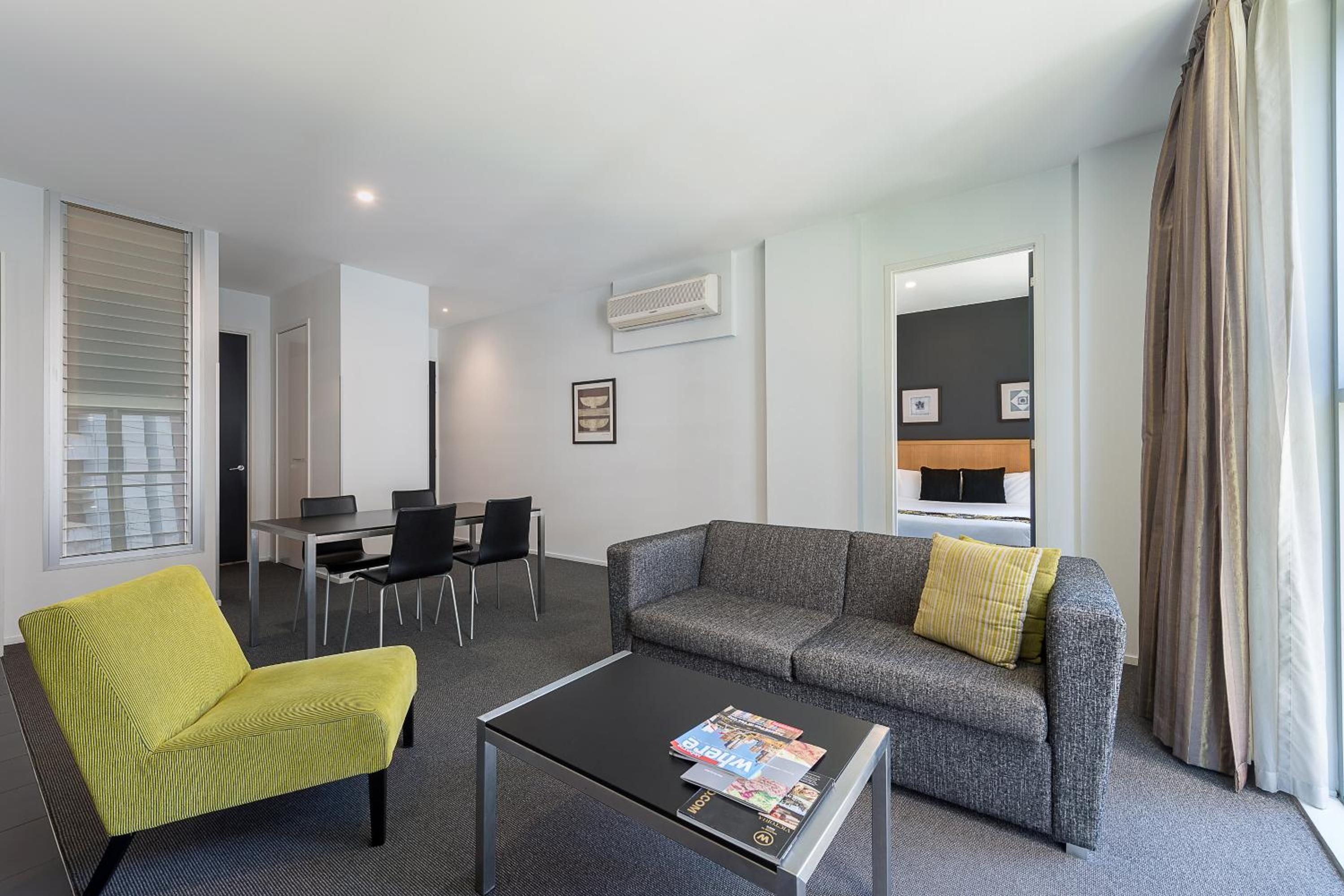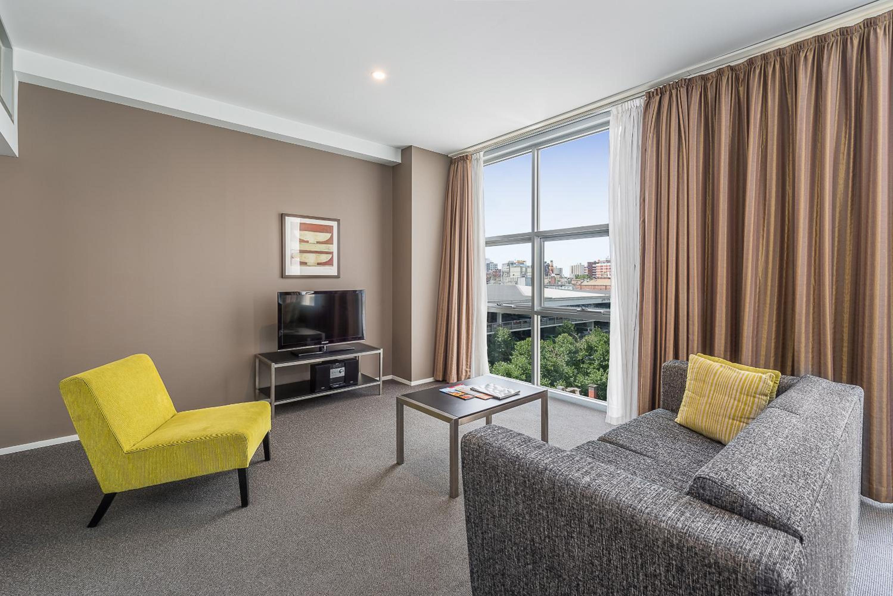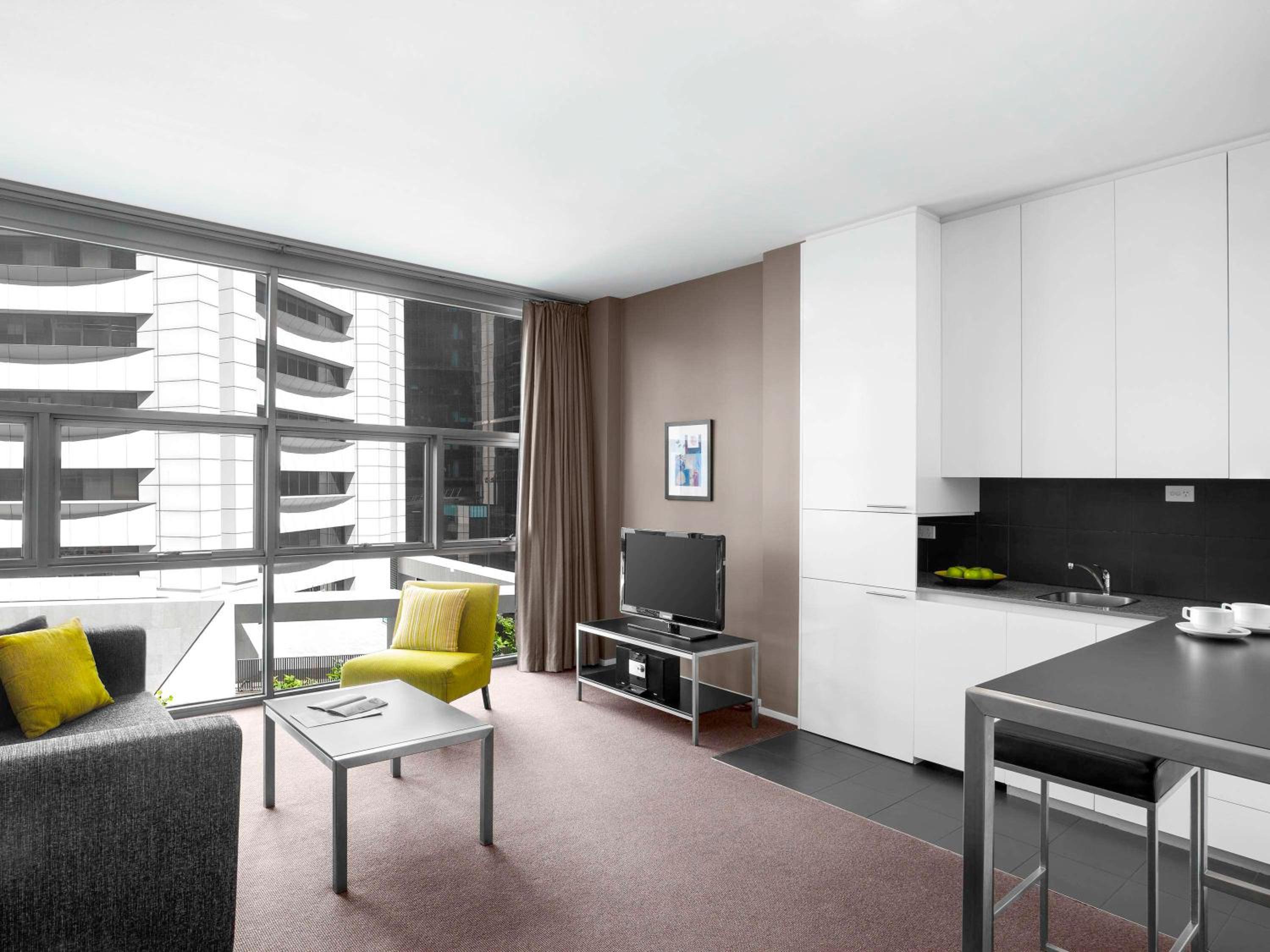 Experience the epitome of luxury at Mantra 100 Exhibition with spacious 1 and 2-bedroom apartments boasting modern amenities and separate lounge areas with LCD TVs.