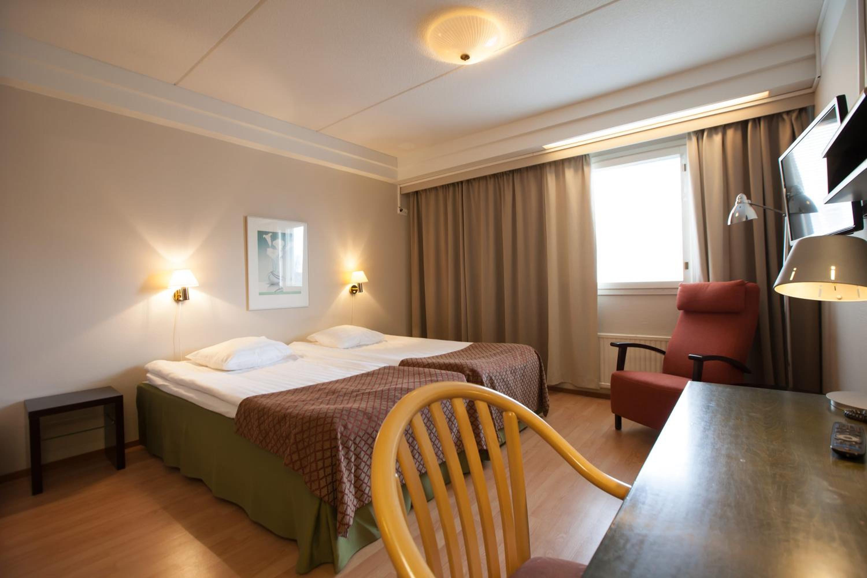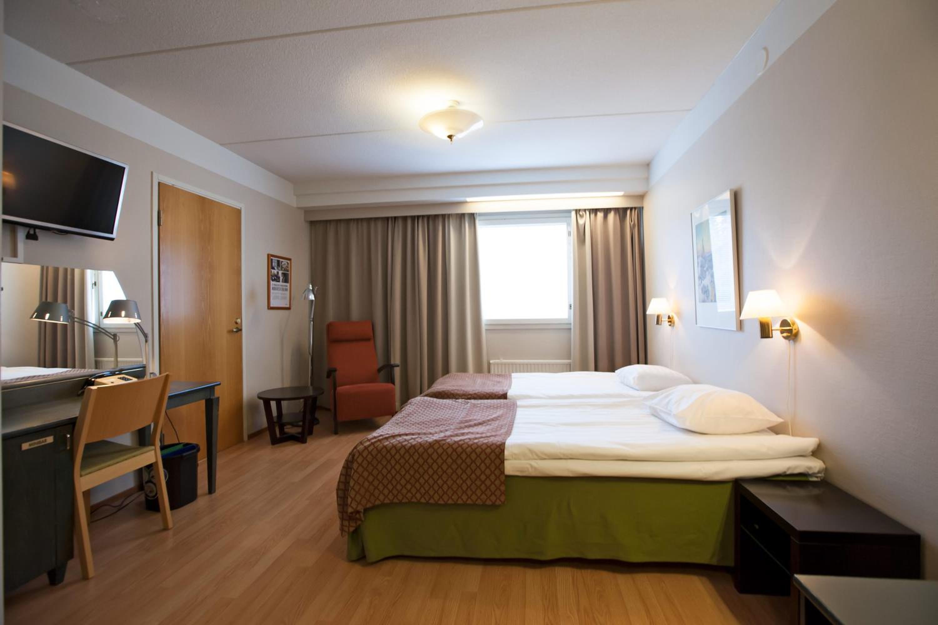 Each room features a work desk and a flat-screen TV with various cable channels. The hotel's renowned breakfast buffet offers a delightful array of local porridge and Finnish delicacies.