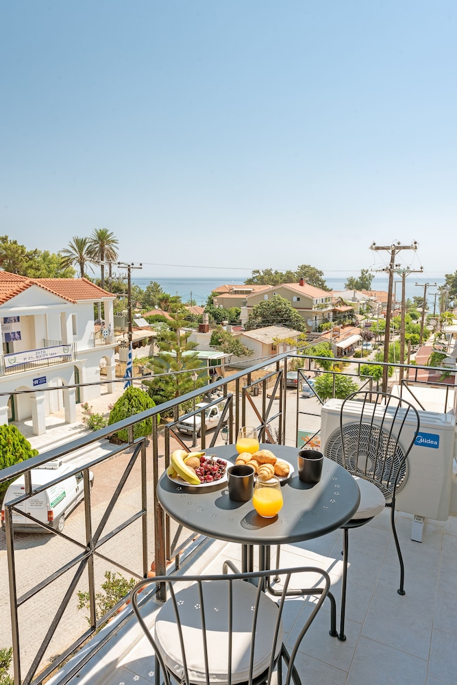This is not really a hotel- it’s more like an Airbnb with an unresponsive host. Check in was inconvenient as when we arrived at 3pm there was no one at the property. I waited outside and finally happened to see a cleaning staff come to the locked gate. There was a language barrier or something as I felt as though I was doing something wrong when I was just trying to check in. The hotel itself was also very tricky to find and we had to ask several people on the street to find it. There is a very small sign outside the hotel. The WiFi didn’t work at all in our room and so I used up all my internet plan and pay for more usage, and my husband couldn't work from our room at all. Very inconvenient to say the least. The breakfast that was included was mediocre at best. Large portions but the food seemed to be cooked in too much of an oily fake butter. The loft part of our room would not cool down with the AC on. We had to buy a fan in order to be able to sleep. The one good thing about this place was the location - right in the center of the small town of Skala and the balcony view was lovely. I would not choose to stay at this hotel again.