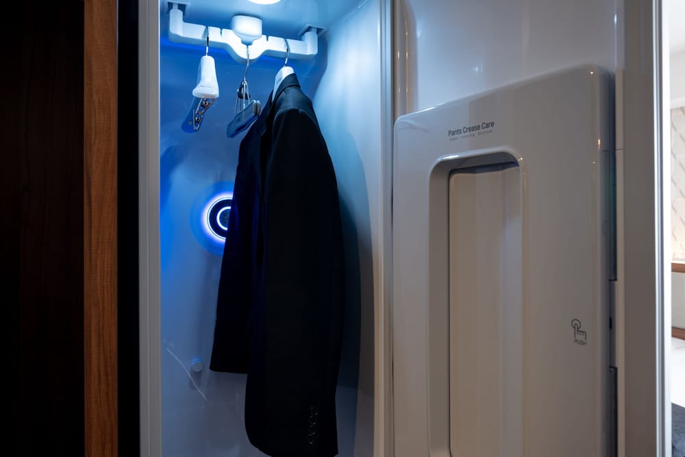 お部屋はツインルームで、ベットも広く、くつろげるソファ等スペースもあり、居心地が良かった。衣類を除菌したり消臭したりできる機器が備え付けてあり、服は少なめに持ってきてたので、とても助かった。