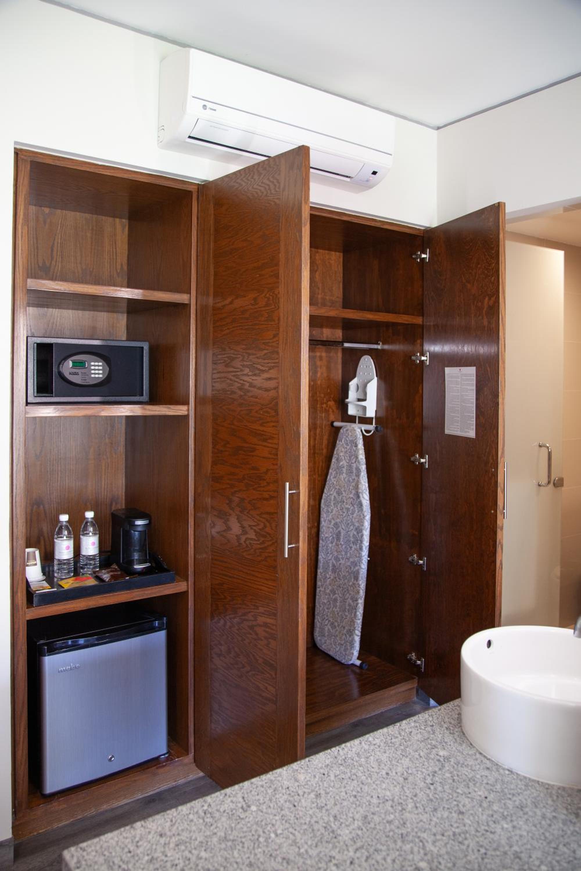 Comfortable Accommodations: Relax in rooms furnished with dark hardwood furniture, blackout curtains, and modern amenities like cable TV, free Wi-Fi, a coffee maker, and in-room safe.