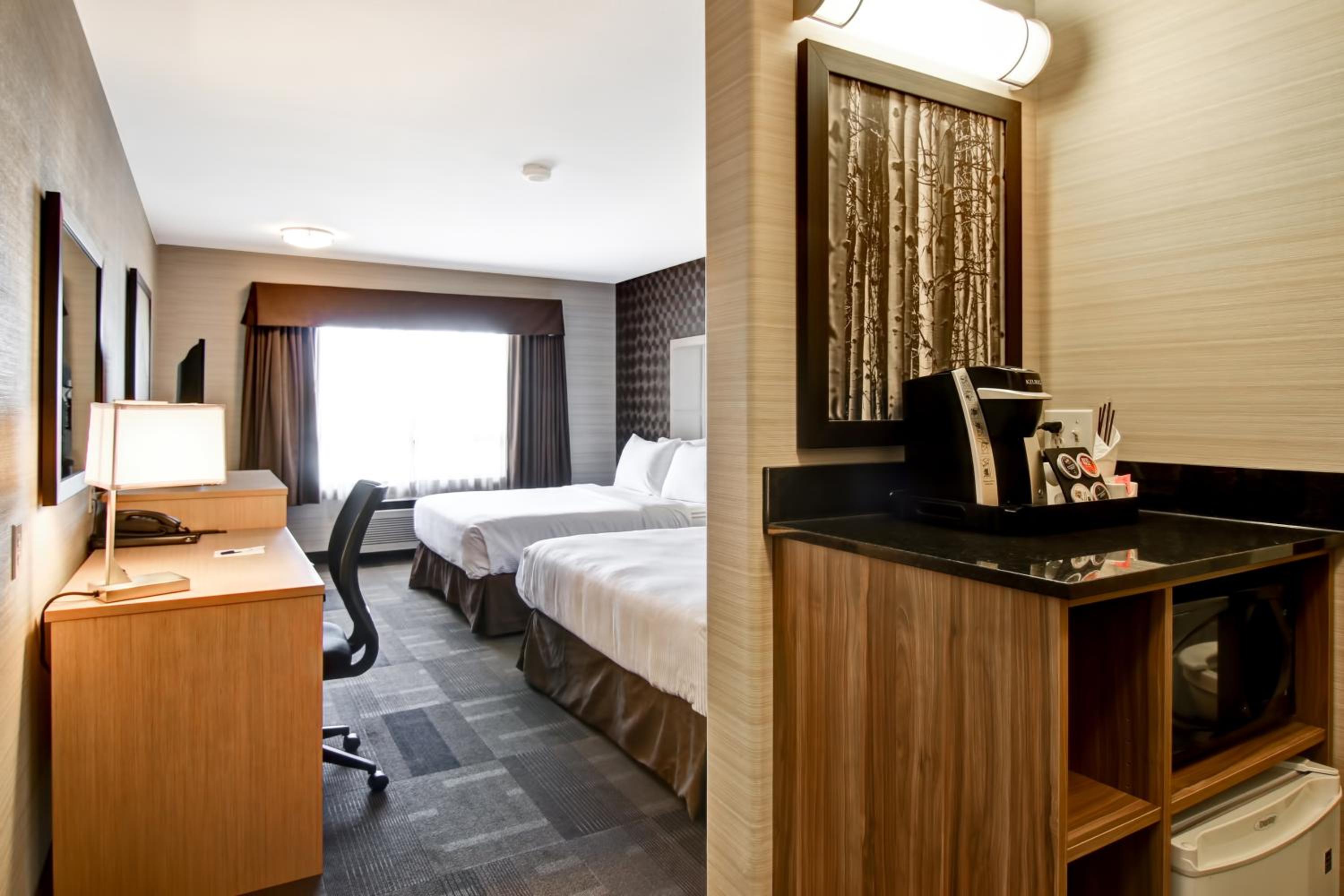 Great hotel. Nice size rooms. The little coffee bar area in the room was perfect. Fridge and microwave in the room was nice. The breakfast exceeded my expectations. Eggs, really good sausages, toast. I wasn’t expecting a warm breakfast. Oh, and waffles! Plus, they had outlets for the vehicles. It came in handy as the night time temperature dipped to -35.