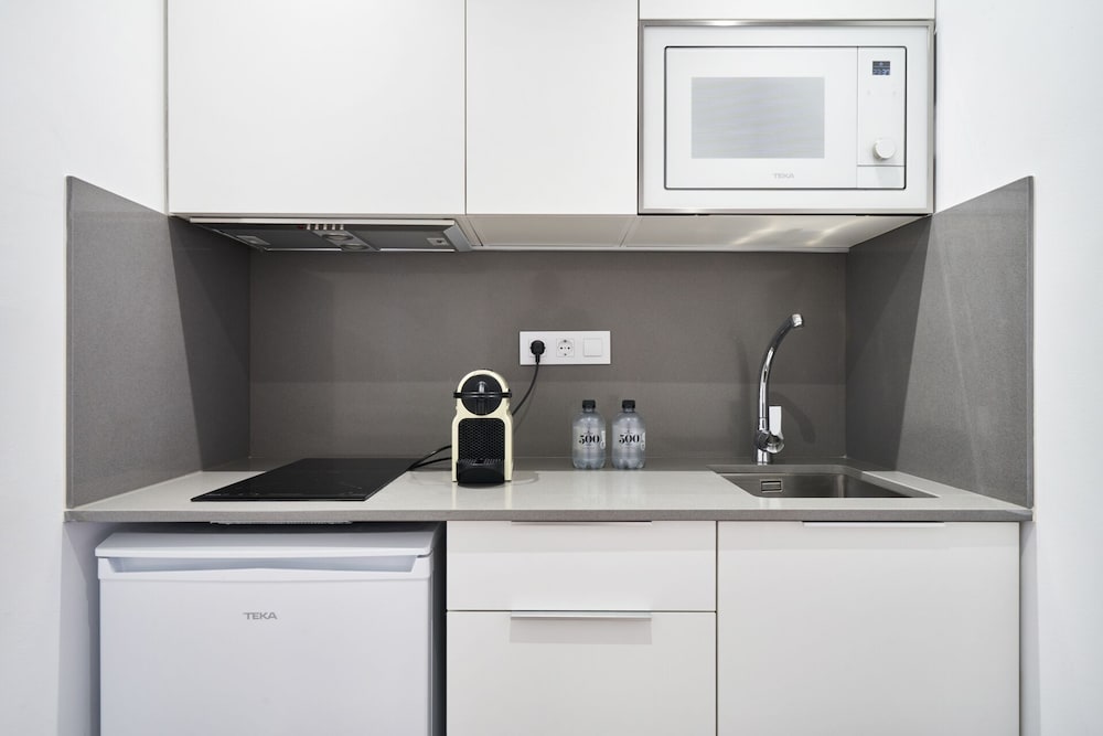We had a 2bd unit on the top floor with a balcony, really nice. Central AC, kitchen. There's a decent restaurant downstairs. About 5-7 min walk to metro lines. Some cafes/bakeries/small convenience stores around.