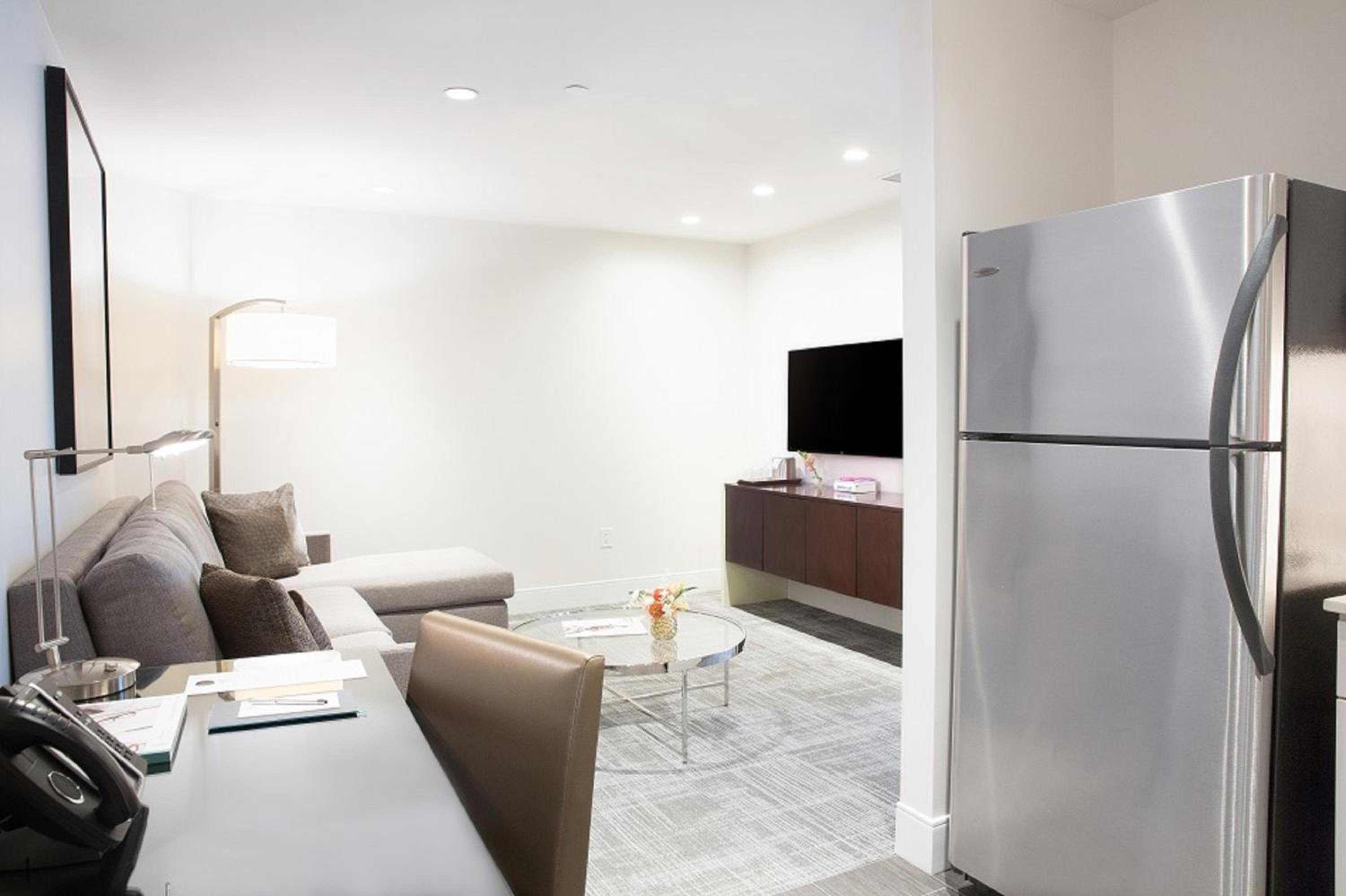 Experience comfort and style in our modern guest rooms equipped with flat-screen TVs and luxurious bathrobes for a relaxing stay at The Lumen.
