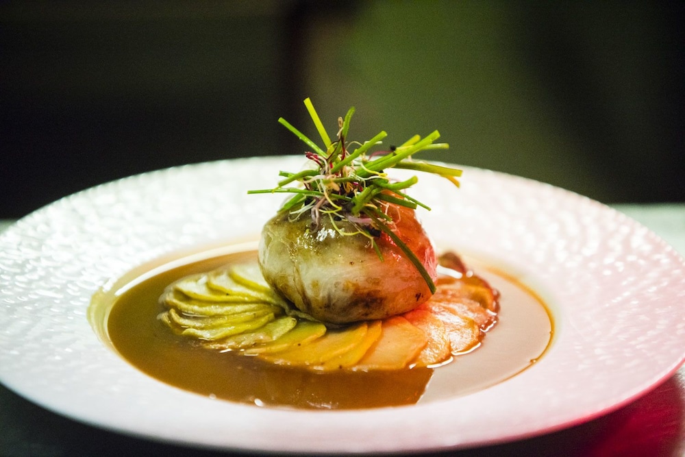 Savor exquisite French cuisine at Le M. 1474, featuring a delightful bar and lounge where you can sip drinks amidst a beautiful garden view, with alfresco dining options available for those lovely evenings.