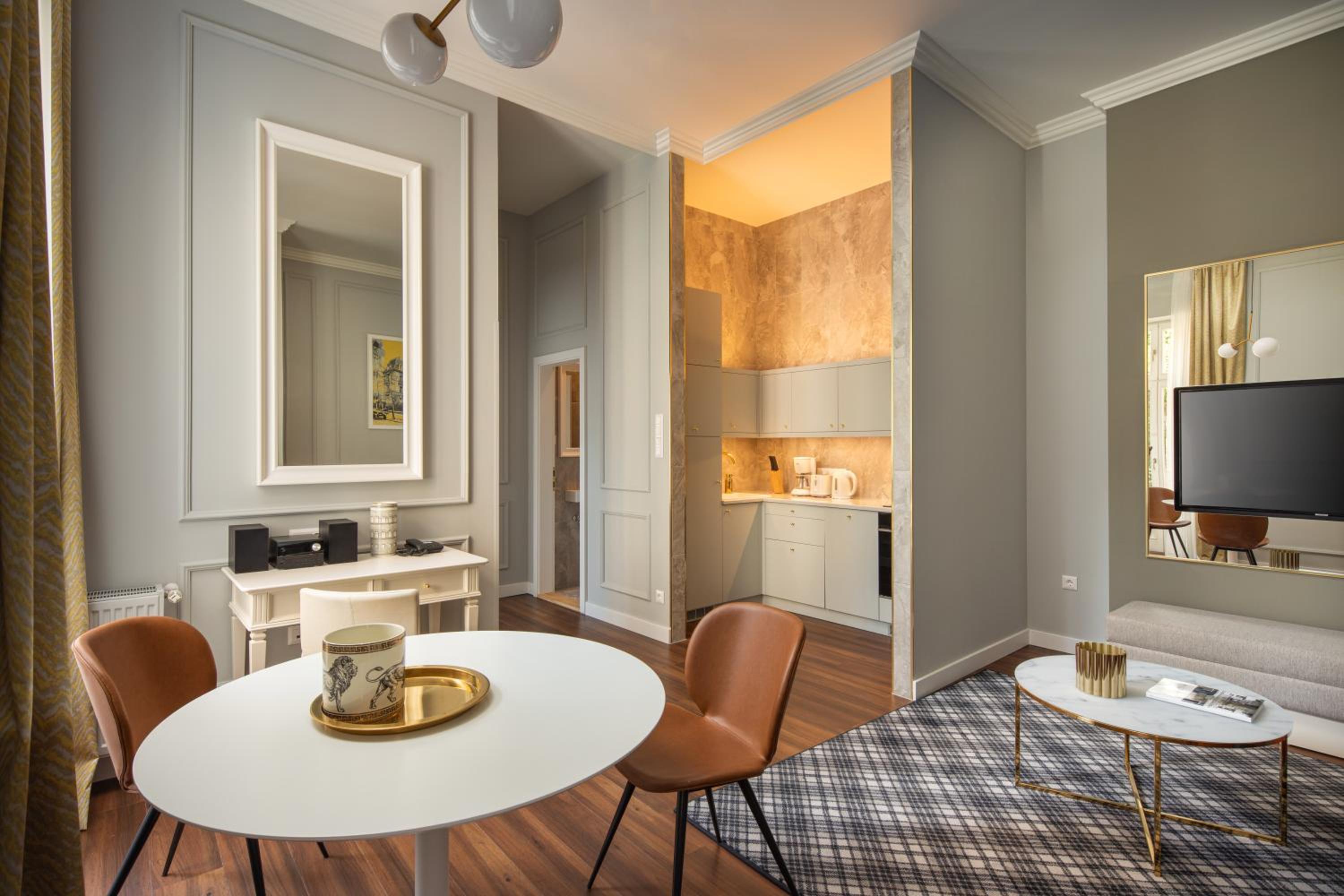 The Mamaison Residence Izabella Budapest, located just off the UNESCO-protected Andrassy Avenue, offers spacious suites with kitchenettes and complimentary Wi-Fi. Each suite boasts separate bedrooms and living rooms, fully equipped kitchens, DVD players, and access to a DVD library and Hi-Fi system.