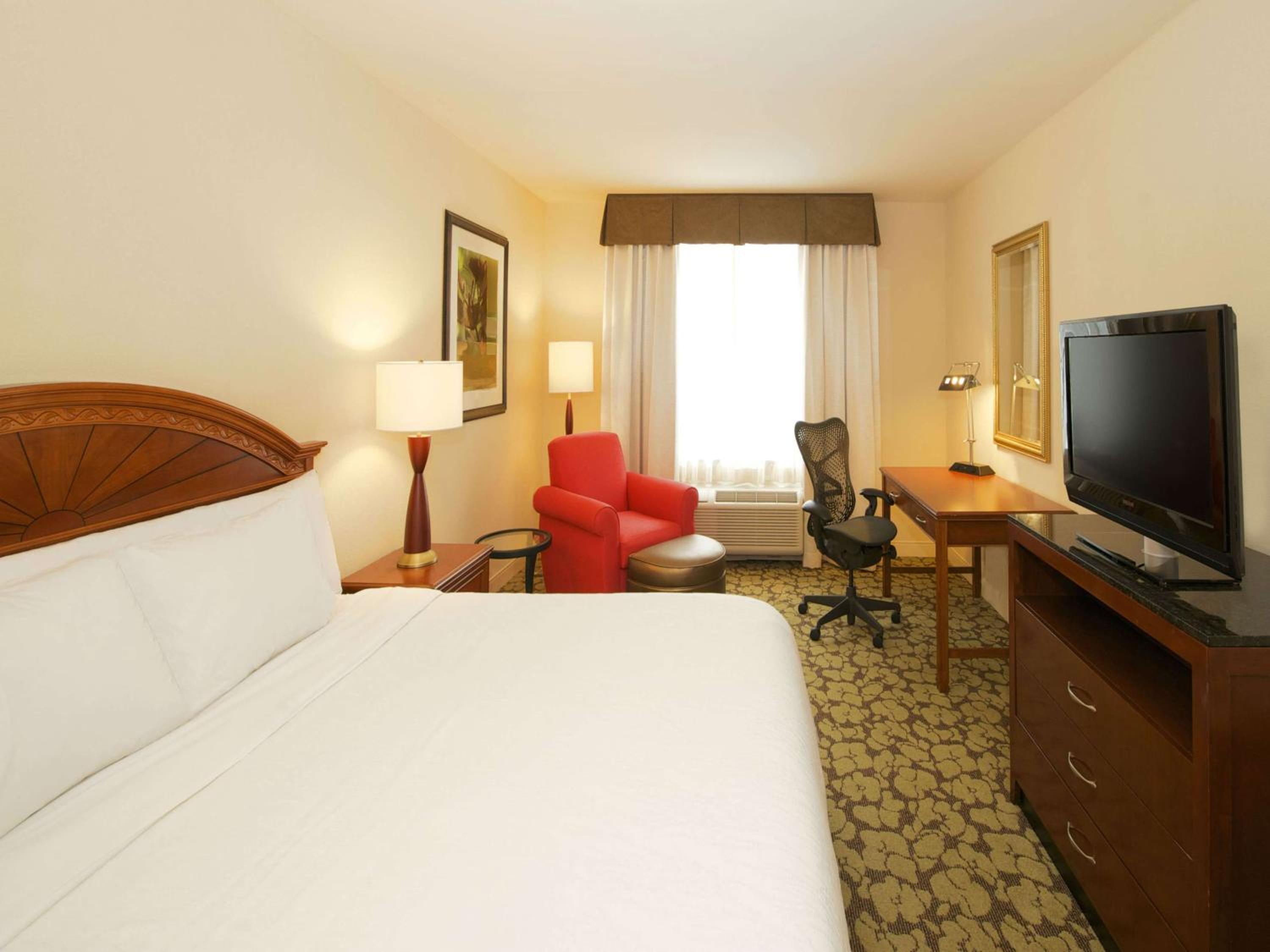 Outdated, run down, much needed remodeling. Bed squeaked all the time, getting in or out and rolling over. Bed linen was old, holes in the seems and frayed. Bath towels had holes in them. Terrible lighting with one lamp unstable/broken and outdated. Bathroom had no working exhaust fan. Hall way carpet was gathering in the center throughout the entire floor. No parking near the building only available parking was in a parking garage across the street. I would expect this from a Days Inn not a Hilton.