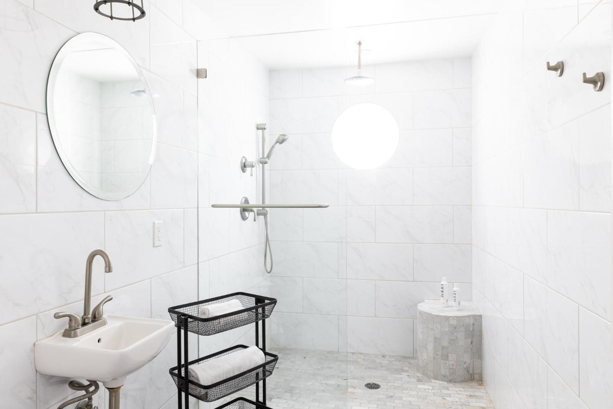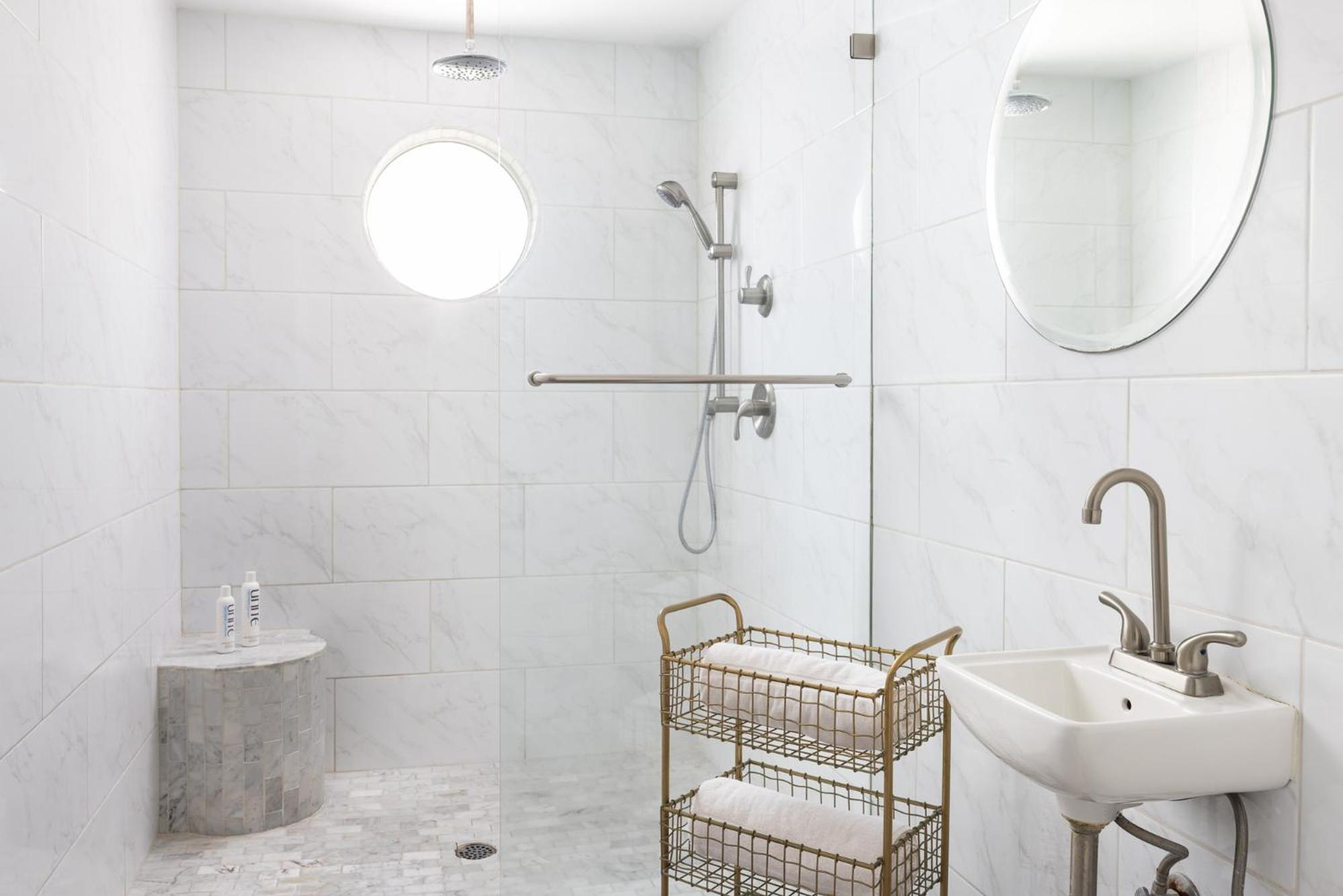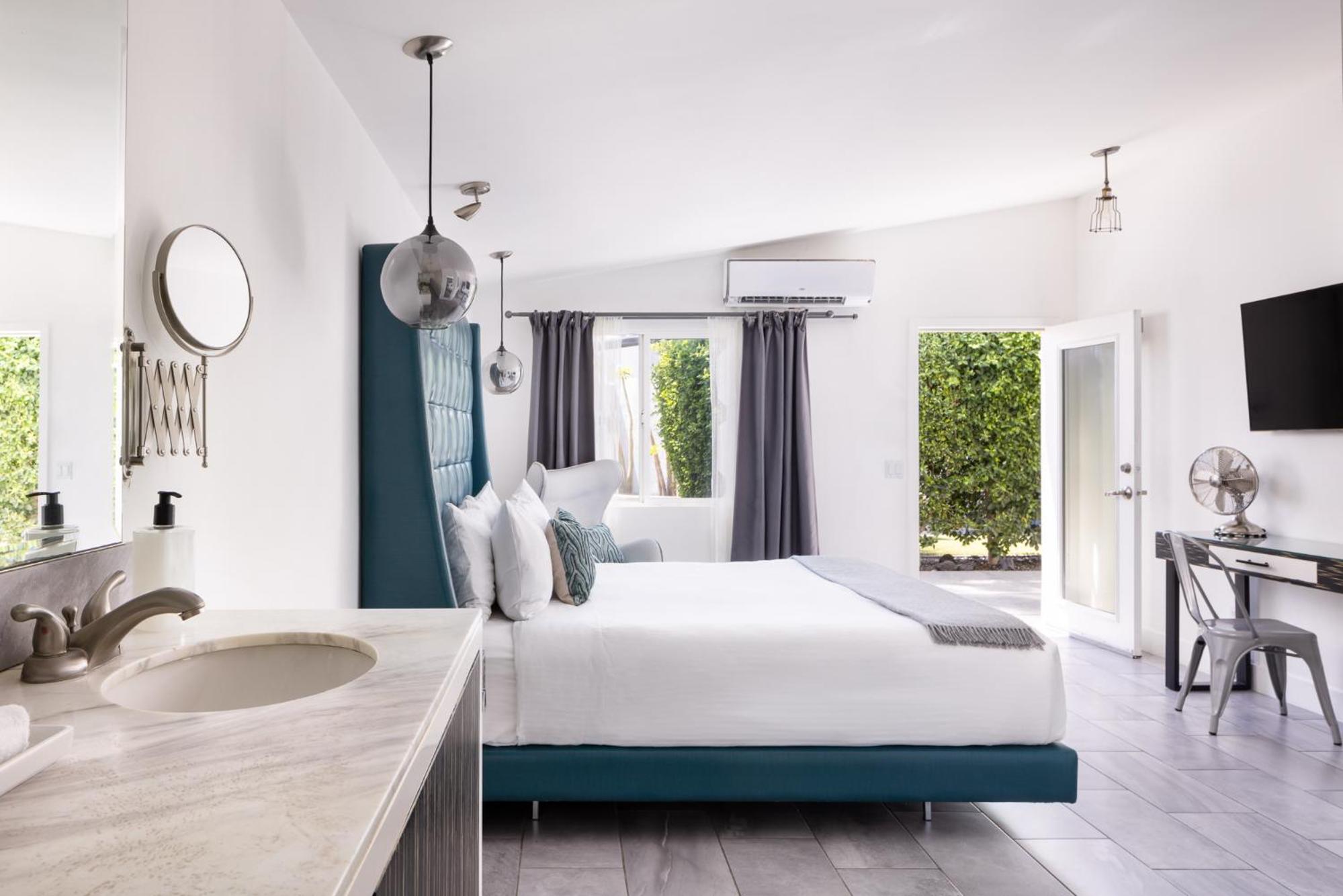 Each room at The Palm Springs Hotel features modern white on white decor with pops of teal, purple, or orange. The en suite bathrooms showcase a sleek white vessel sink and glass shower. Select suites offer additional luxury with separate living areas, private cabanas, or claw-foot baths.