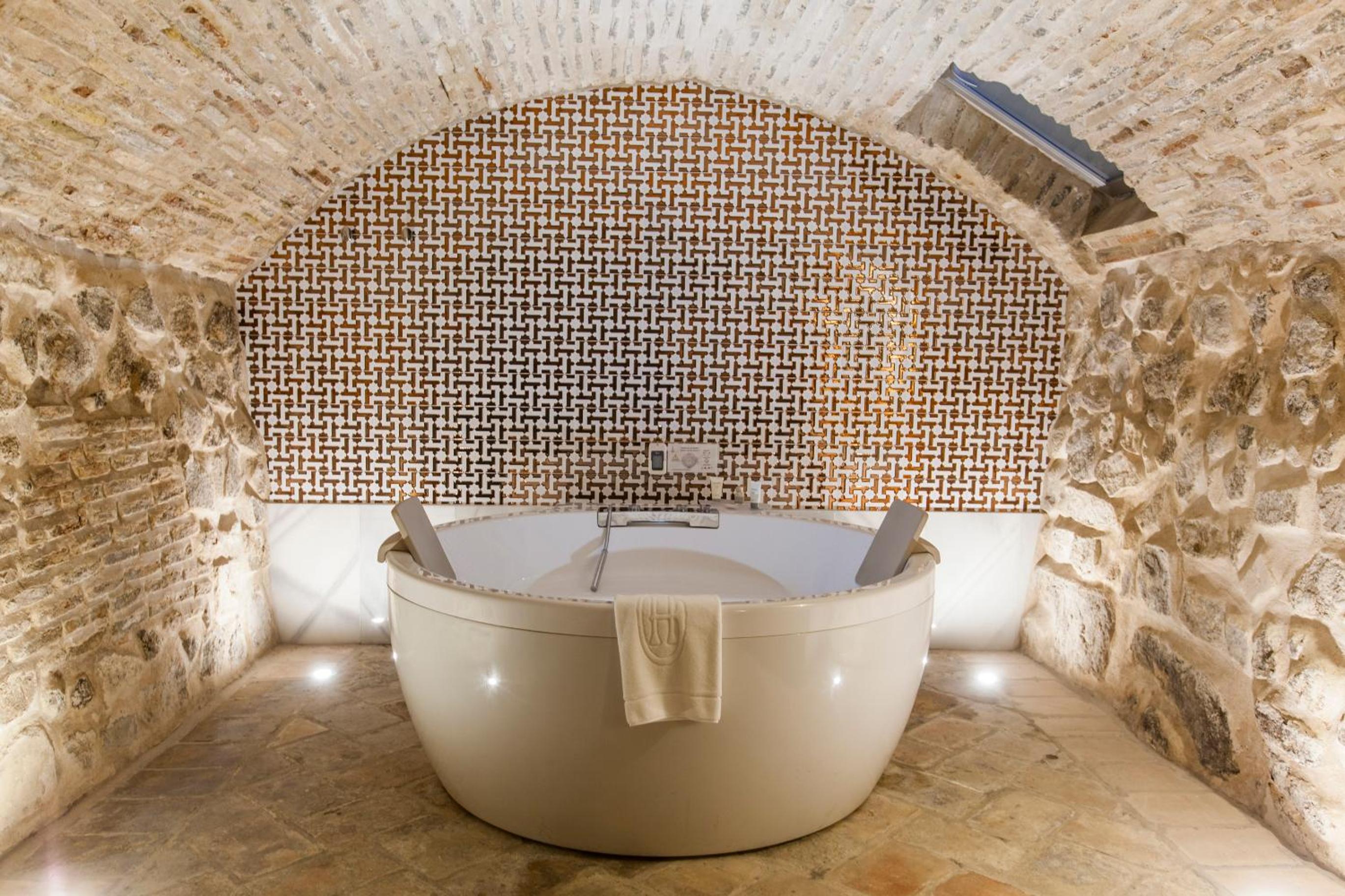 Experience rustic yet stylish rooms featuring wooden beams, exposed brickwork, and modern bathrooms. Some rooms even boast a luxurious hydromassage bath for ultimate relaxation.