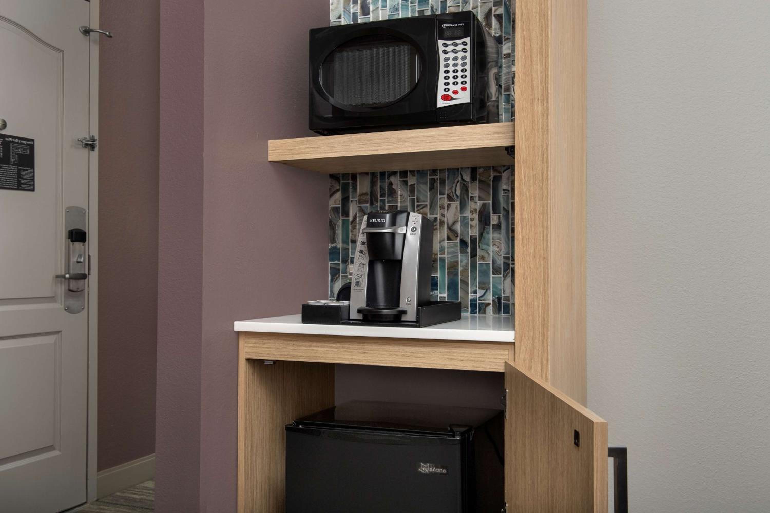 Experience the convenience of a microwave, refrigerator, and coffee maker in every room, along with free Wi-Fi and a spacious work desk.