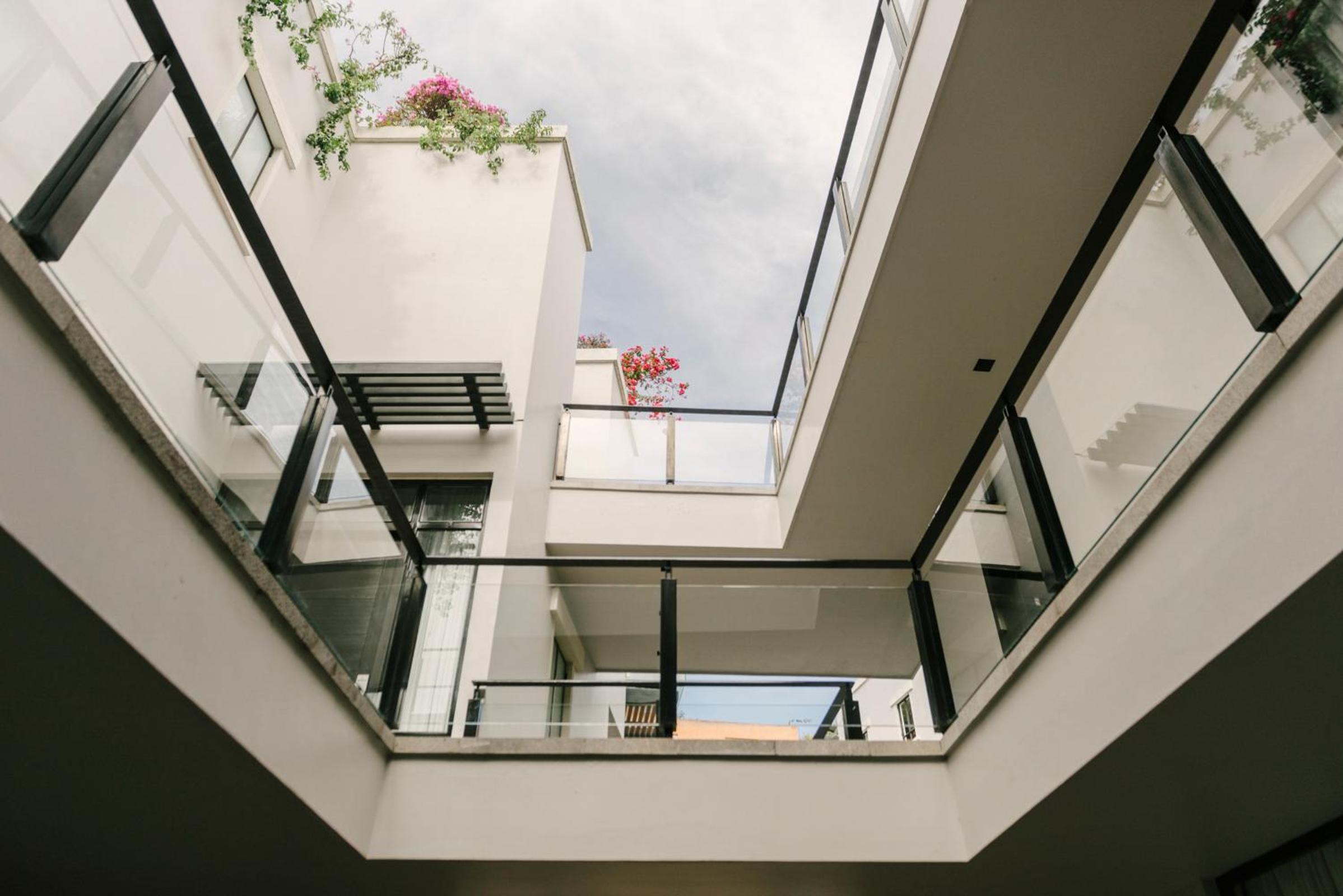 The architecture is stunning, blending sleek modern lines with lush natural elements like the vibrant bougainvillea lining the walls.