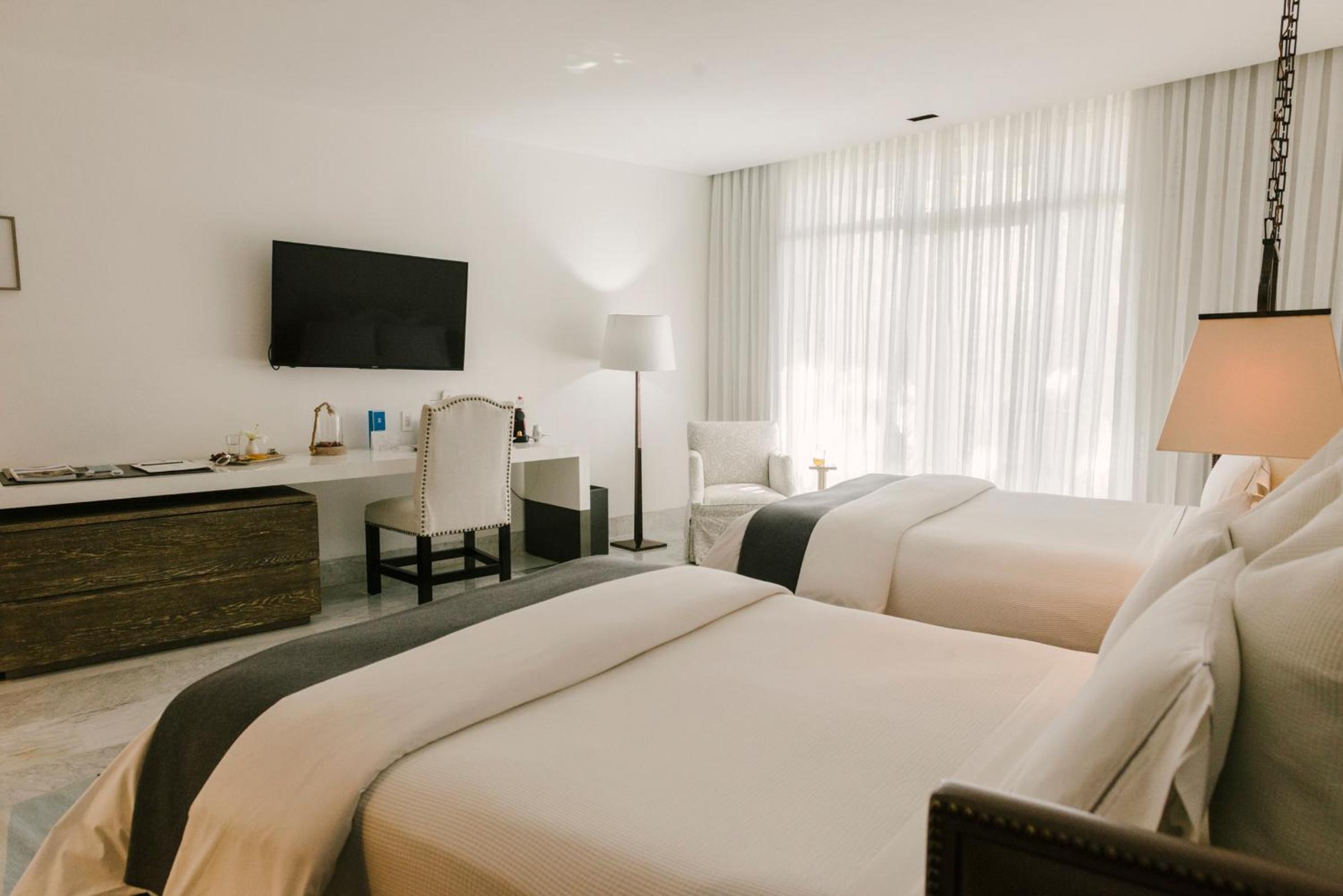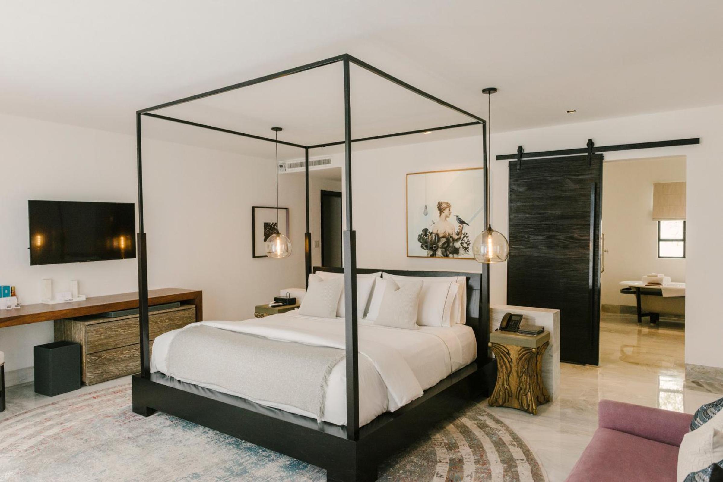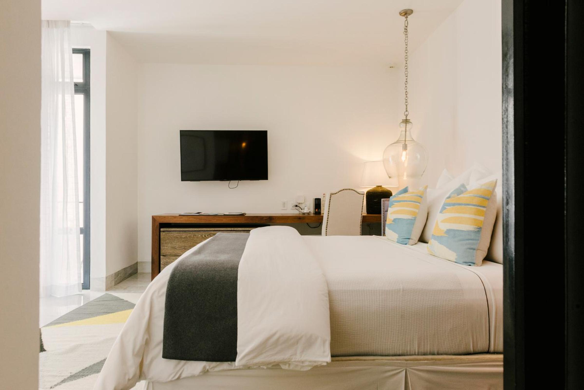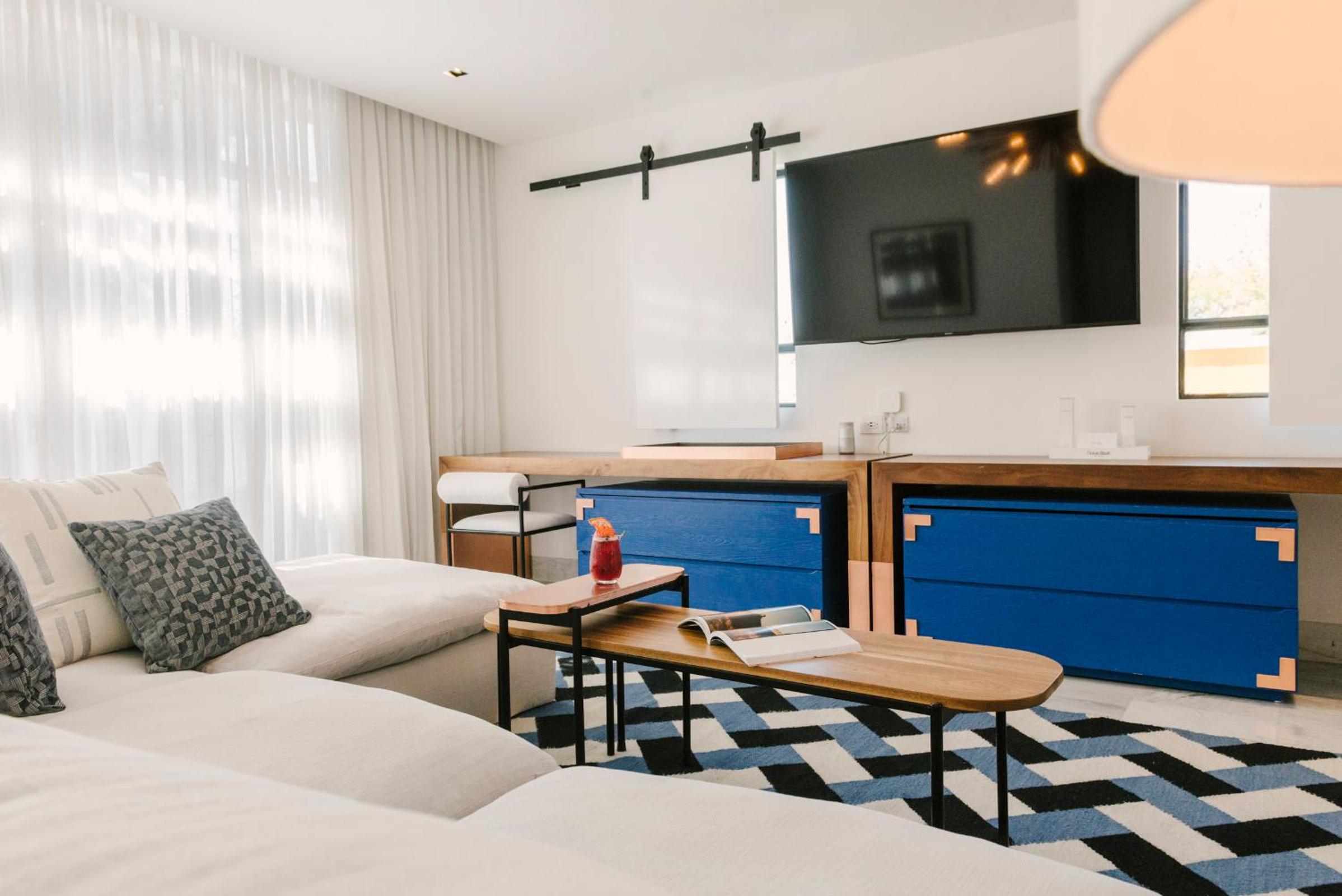 Modern Mexican Decor: Immerse yourself in the beauty of modern Mexican photography adorning our air-conditioned rooms and suites, featuring free Wi-Fi, flat-screen cable TV, and large bathrooms with double sinks.