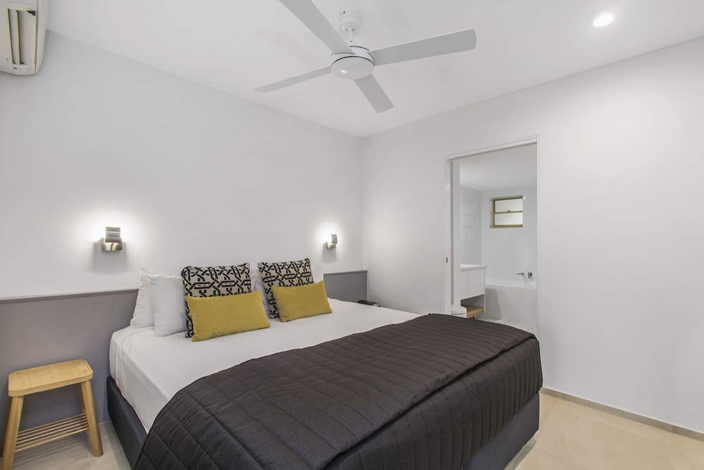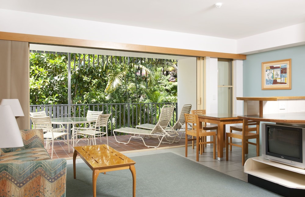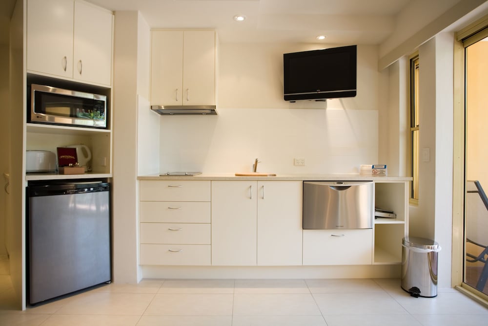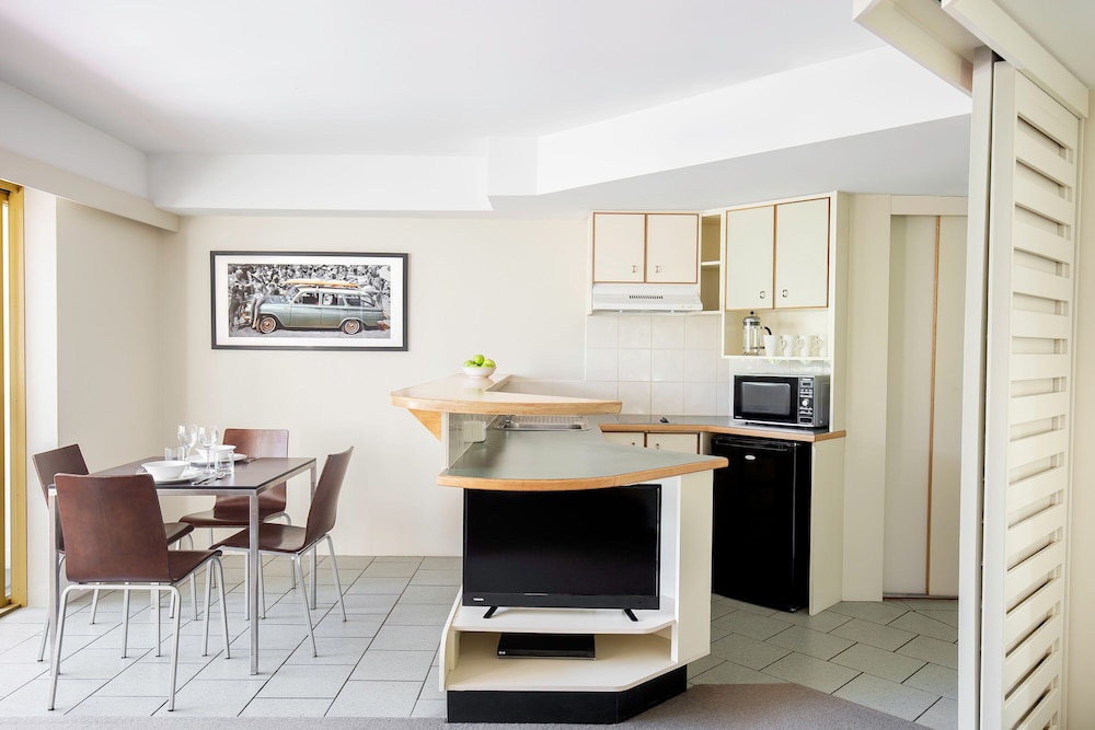 Rooms overlooking the pool is nice and the birds came down to visit. Apartments were plenty big enough for us but the contents were tired and dirty or broken. Couch was stained and ironing board was broken. No vaccuum so the bedroom carpet couldn’t be cleaned and even though the manager had checked our room was ready when we arrived it hadn’t been cleaned properly just a basic quick clean. There was drink or food splashes over the door divider panels and the floors weren’t clean if you closed the doors there was dust and dirt behind them. Cobwebs and bugs in the ceiling and ants in the kitchen bench area. Very disappointed in the cleanliness.