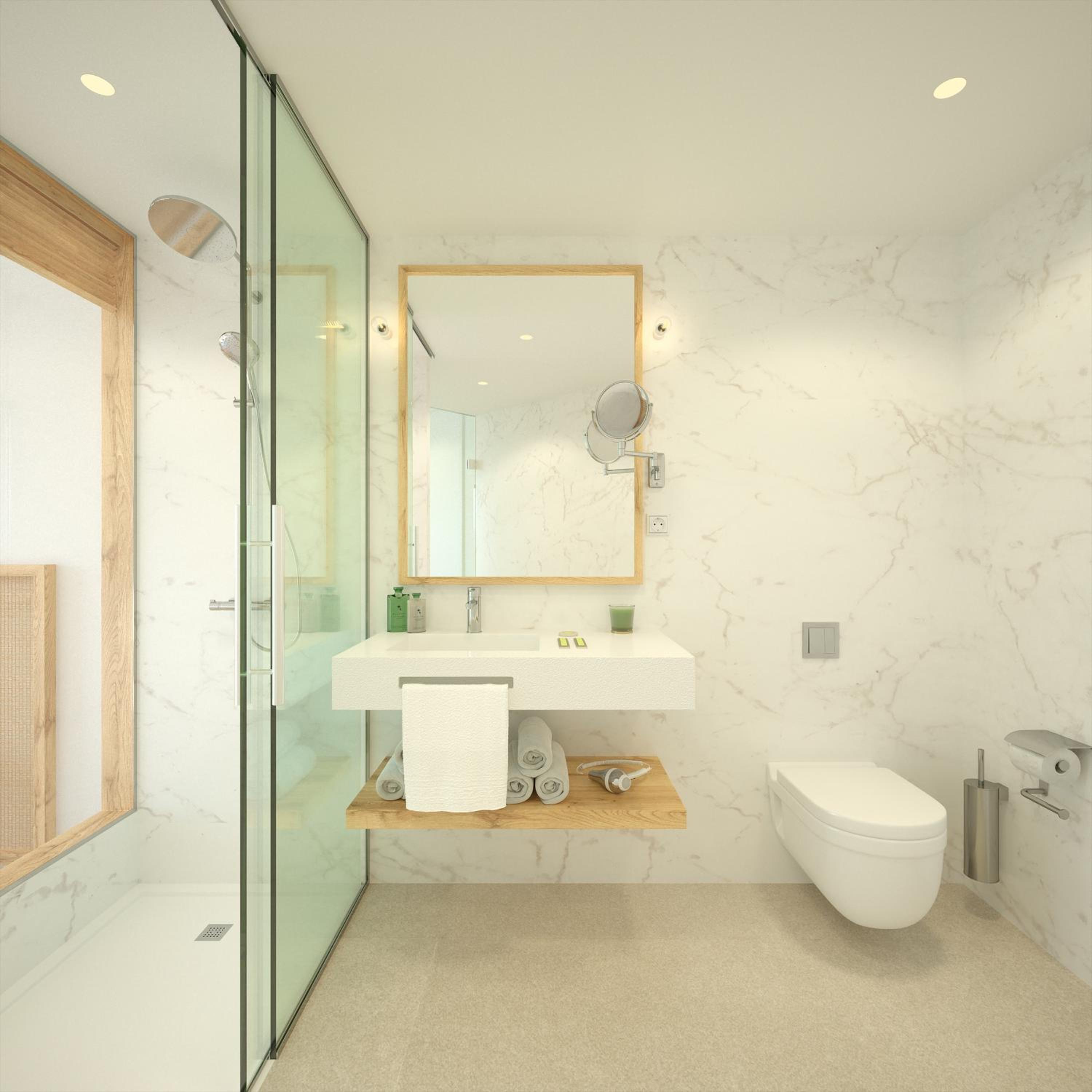 La cloison vitrée entre la salle de bain et la chambre est bien mais il devrait y avoir la possibilité de l'occulter par un rideau au cas où.