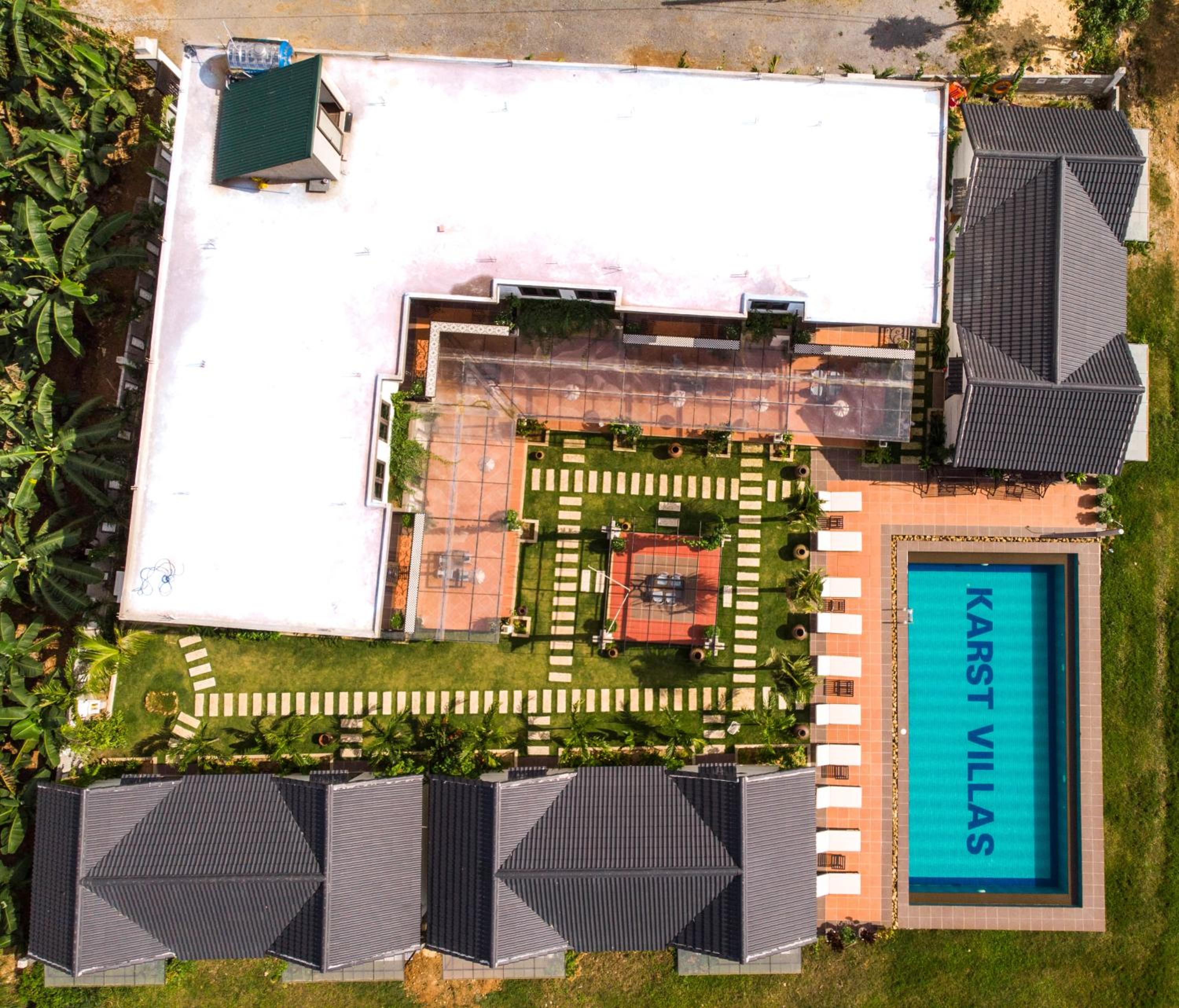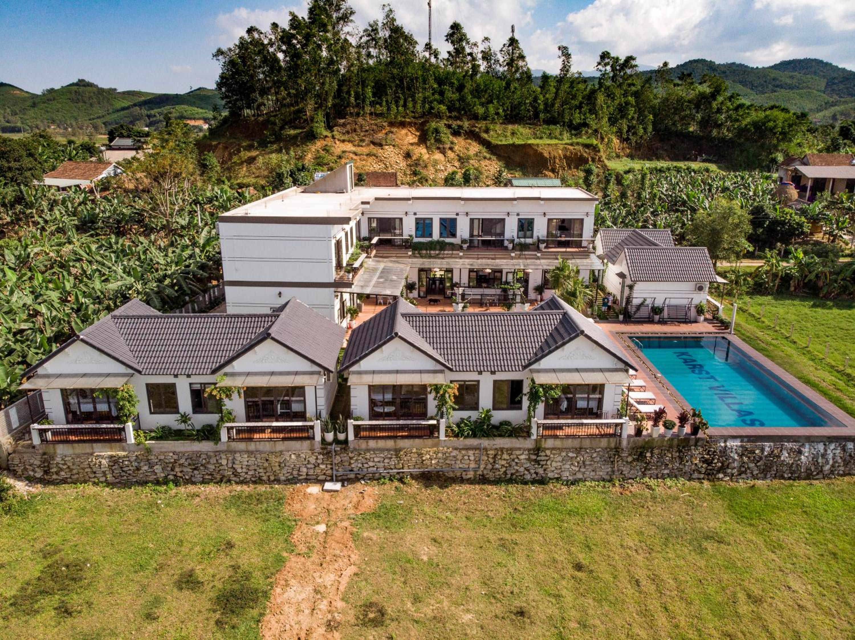 Karst Villas Phong Nha offers a picturesque setting with mountain views and modern amenities including a restaurant, 24-hour front desk, bar, garden, and a year-round outdoor pool. The units are elegantly designed with a terrace, air conditioning, flat-screen TV, and a private bathroom. Guests can enjoy pool views from the patio and relax in the garden while staying connected with free WiFi.