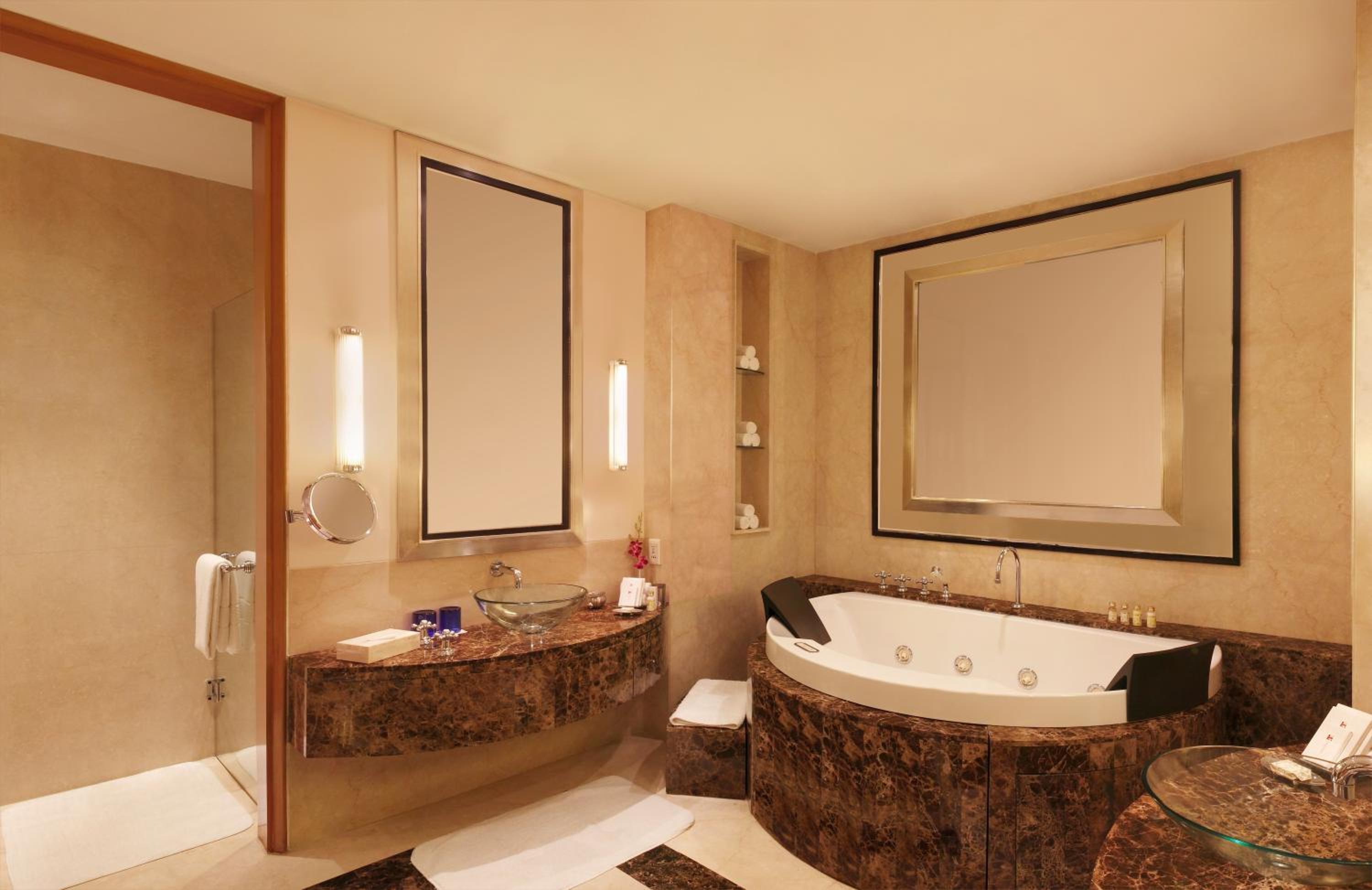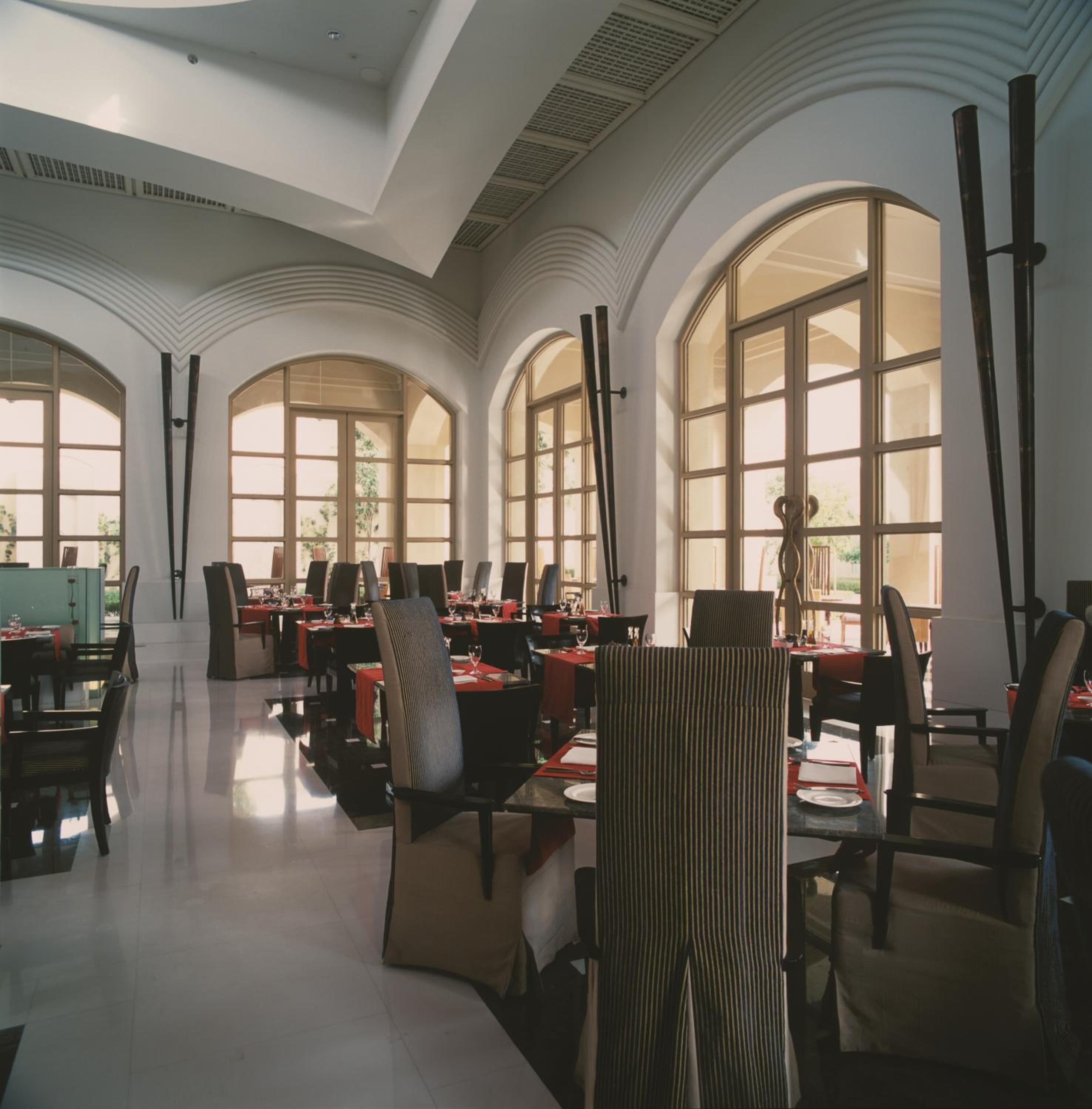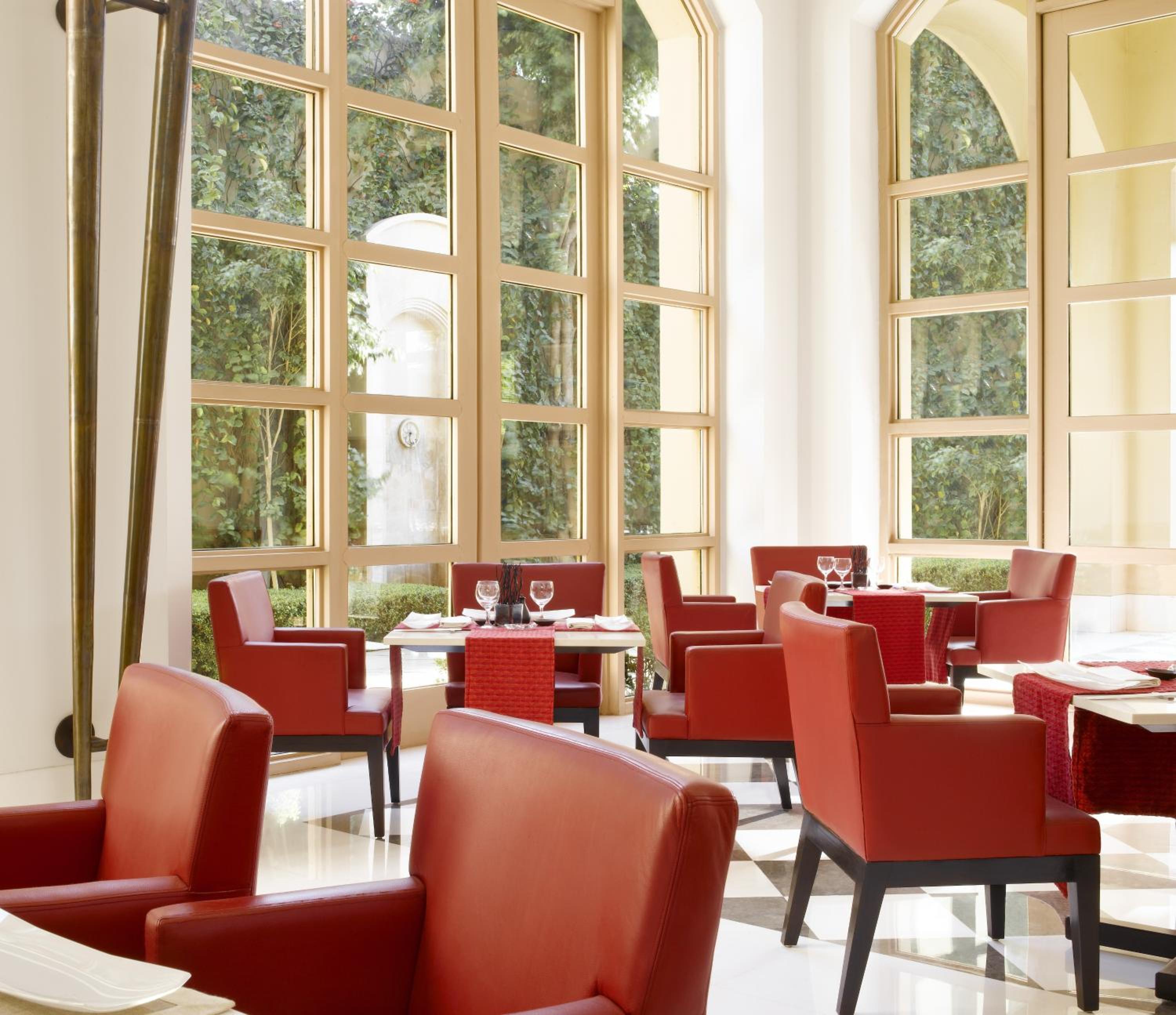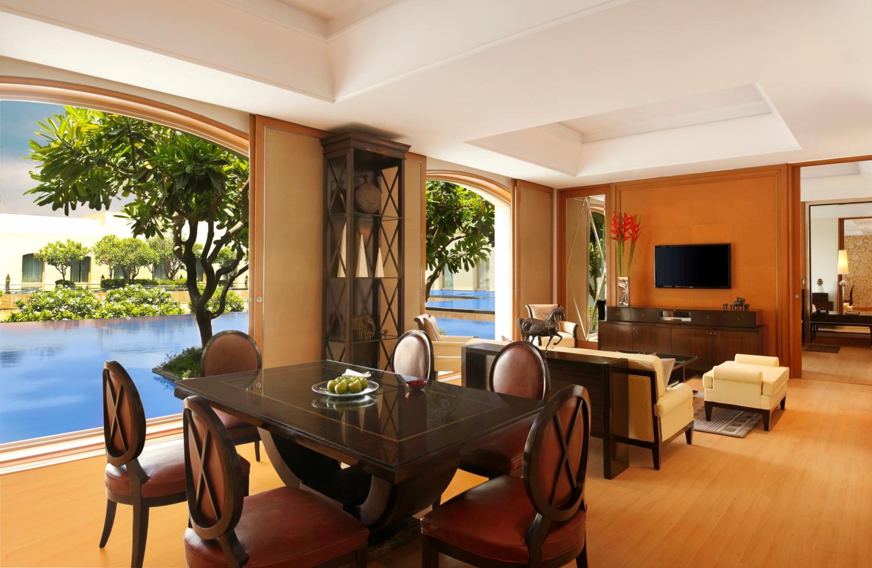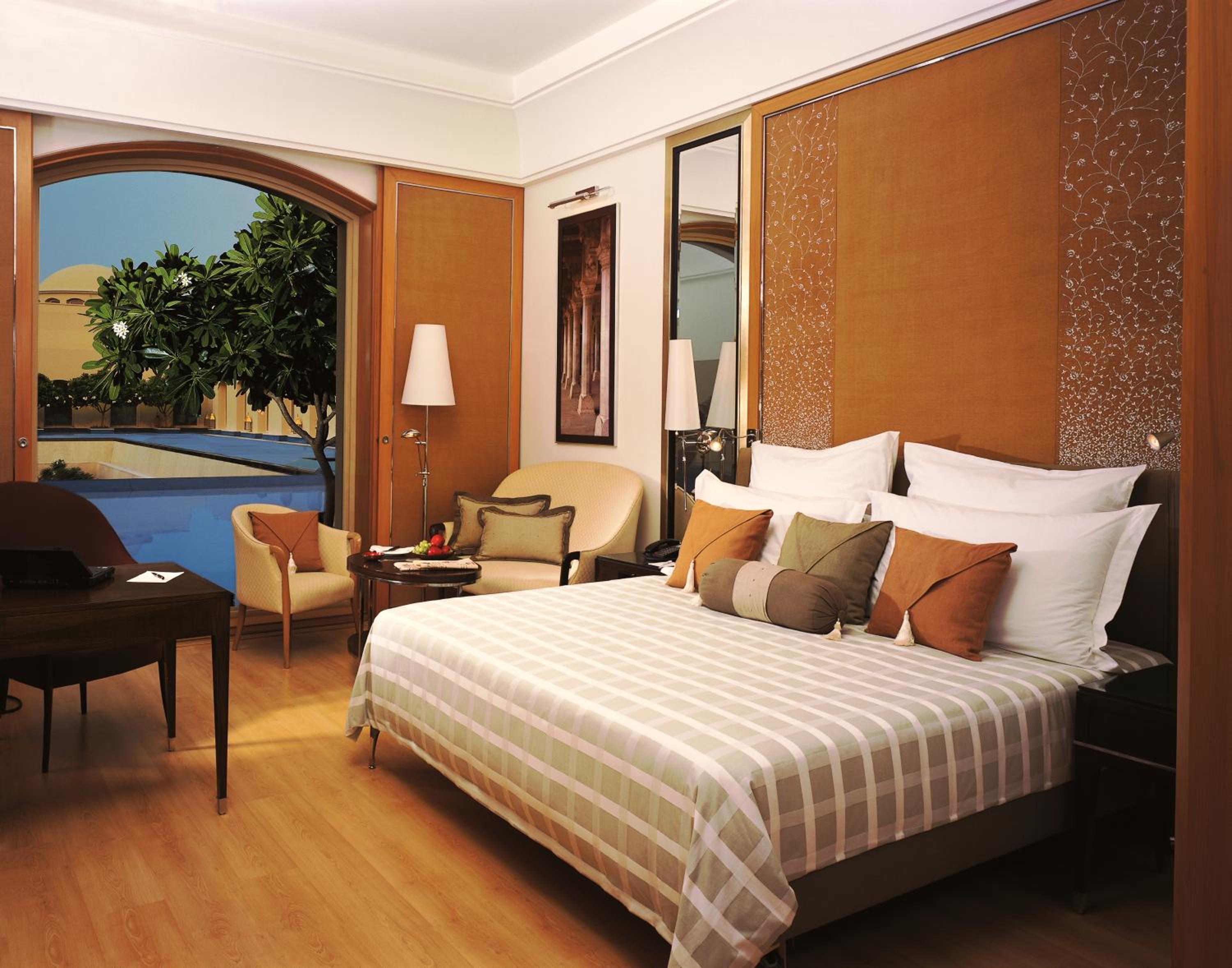 Trident Gurgaon, set on 7 acres of lush gardens, offers 5 dining choices, spacious courtyards, and serene pools. The rooms feature elegant wooden flooring, large windows with garden views, and modern amenities like air conditioning and minibars.